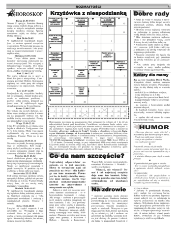 ROZMAITOŚCI HOROSKOP Baran 21.03-19.04 Wenus Ci sprzyja. Samotne Barany mają szansę znaleźć drugą połowę, a osoby w stałych związkach przeżyć kolejny miodowy miesiąc. Sprawy zawodowe zejdą na dalszy plan. Dobre zdrowie. Byk 20.04-20.05 W najbliższych tygodniach poczujesz, że możesz sprostać wszystkim wyzwaniom. Wykorzystaj ten czas na realizację swoich marzeń. I nie przejmuj się nieporozumieniami w pracy, szybko miną. Bliźnięta 21.05-21.06 Trwa Twoja dobra passa. Nowe kontakty zaowocują ciekawymi nowymi propozycjami. Nie rezygnuj z kilkudniowego wyjazdu. Być może spotkasz wówczas miłość swojego życia. Zadbaj o kondycję na wiosnę. Rak 22.06-22.07 Nie warto wdawać się w spory z kimś, kto jest ci nieżyczliwy. Czas i energię poświęć bliskim. Koniecznie zaplanuj też sobie parę dni urlopu. Zasługujesz na odpoczynek. Finanse w normie. Lew 23.07-22.08 Przejmujesz się wszystkim bardziej niż to konieczne. Zmień trochę spojrzenie na codzienne problemy. I pozwól sobie pomóc, przecież nie jesteś sam. W najbliższych tygodniach poprawią się Twoje finanse. Panna 23.08-22.09 Nie wstydź się swoich słabości, niektóre wręcz dodają ci uroku. I otwórz się na przyjaciół. Dobrze też, byś zrobiła trochę oszczędności. Pieniądze przydadzą Ci się na urlop. Waga 23.09-22.10 Czas, byś doceniła to, co masz, a nie bujała w obłokach. Twój partner chce Ci w tym pomóc. Może więc razem wybierzecie się na romantyczne spotkanie. Finanse Wam na to pozwolą. Skorpion 23.10-21.11 Nie wierz w plotki, bo mogą przysporzyć Ci problemów. Rób swoje i staraj się być perfekcyjny w pracy. A w domu koniecznie znajdź czas na rozmowy z bliskimi. Zdrowie dobre. Strzelec 22.11-21.12 Jesteś ulubieńcem planet, więc spodziewaj się interesującego spotkania i korzystnych propozycji zawodowych. Warto też spróbować szczęścia w grach losowych. W podróże się nie wybieraj, te lepiej odbywać latem. Koziorożec 22.12-19.01 Pod koniec miesiąca spotkasz dawną sympatię i dobrze, gdybyś nie pozwolił zniknąć jej z życia. W pracy trochę więcej luzu, ale też trochę mniej pieniędzy. Oszczędzaj. Wodnik 20.01-18.02 W najbliższych tygodniach cieszyć się będziesz dobrą rodzinną atmosferą. Najbliżsi podzielą się z Tobą ciekawymi nowinkami i zwierzą z najskrytszych planów. Finanse w normie. Ryby 19.02-20.03 Liczyłeś na czyjeś wsparcie i nie zawiodłeś się. Wyciągnij z tego wnioski. Może to jest właśnie ta osoba, z którą powinieneś iść przez życie. Skontroluj zdrowie, bo wiosną możesz poczuć się słabiej. Krzyżówka z niespodzianką niespodzianką USUWANIE PLAMY Z ODZIEŻY PRĄDNICA PRĄDU MIASTO NAD BUGIEM URZĘDOWE GRECKA OPOWIEŚĆ NA UKRAINIE NIE OKRYCIE 4 PRZY ROWERZE KAFTAN, WIERZCH- 3 POLECENIE 12 O BOHATERACH 8 11 ROBAK NA HACZYKU WĘDKI WYSZYWANA 9 TKANINA NA ŚCIANIE 2 5 17 6 BICZ WOŹNICY TWARDY METAL O SYMBOLU CHEMICZNYM V ...TAYLOR AKTORKA GRAJĄCA KLEOPATRĘ 10 SARMACKIE „NIE POZWALAM”, ZRYWAJĄCE DAWNE SEJMY 1 TELEWIZYJNY „TALERZ” POETYCKO O NIWACH OBSIANYCH ZBOŻEM ROZMAITYM KORBOWY LUB PRZECIWPOWODZIOWY NA DACHU 18 20 7 16 BRAT CYRYLA, MISJONARZ SŁOWIAN, OD 885 R. BISKUP MORAW 14 PLĄS LUB CHIŃSKA MIARA 19 15 CIĘŻARU 13 21 1 2 3 4 5 12 13 14 15 16 22 6 7 8 17 18 19 9 10 11 20 21 22 Rozwiązanie powstanie po przeniesieniu liter oznaczonych cyframi od 1 do 22 do odpowiednich kratek pod krzyżówką. Prawidłowo rozwiązane hasło należy więc wyciąć, nakleić na kartkę i przesłać pod adresem redakcji lub wrzucić do skrzynki. A dla czytelników nagrodą tym razem będzie książka. Poprzednie hasło z krzyżówki brzmiało: „Życzymy spokojnych Świąt”. Książkę z obrazkiem wylosowała Katarzyna Michalak, Garzyn, ul. Leszczyńska 1 (odpowiedź nadesłana SMS-em). Gratulujemy! Nagroda do odbioru w Centrum Kultury w Krzemieniewie. Przypominamy, że przesyłając rozwiązanie SMS-em w jego treści wpisujemy: TC.ZYCIE.rozwiązanie_krzyżówki i wysyłamy pod numer 7168. Koszt SMS-a to 1,22 zł brutto. Zwracamy uwagę, że przy odpowiedzi SMS-owej obok rozwiązania krzyżówki podać też trzeba swoje imię, nazwisko i adres. Równocześnie informujemy, że rozwiązanie można też przesłać na naszą skrzynkę e-mailową: [email protected]. Na odpowiedzi czekamy do 10 maja. Co da nam szczęście? Najtrudniej odpowiedzieć na pytanie, co to jest szczęście. Słowo to towarzyszy nam od przyjścia na świat i dla każdego ma inne znaczenie. Pewne jest to, że każdy chciałby szczęście mieć zawsze. Warto więc poznać niekonwencjonalne sposoby na przywołanie i utrzymanie szczęścia. Jednym z nich jest noszenie przy sobie kamieni szlachetnych i to w bezpośrednim kontakcie z ciałem. Ale uwaga - osobom z poszczególnych znaków zodiaku przypisuje się inne kamienie. I tak: Lwy powinny mieć przy sobie szafiry i diamenty, Raki - selenity i górskie kryształy. Barany i Skorpiony najlepiej, gdyby nosiły szmaragdy oraz rubiny. Bliźniętom i Pannom szczęście przyniosą agaty oraz granaty, a Strzelcom i Rybom - hiacynty z karneolami. Wagi i Byki powinny nosić ametysty, natomiast Koziorożce i Wodniki szafiry oraz turkusy. Wierzyć, nie wierzyć? Ponoć i tak najwięcej szczęścia daje nam ten kamień, który nam się podoba oraz ten, który otrzymaliśmy od ukochanej osoby. Na zdrowie * Jedzenie czosnku może chronić przed miażdżycą. Naukowe badania potwierdzają, że wystarczą dwa ząbki czosnku dziennie, by zmniejszyć powstawanie blaszek miażdżycowych w tętnicach. Warzywo to pomaga zarówno tym, którzy już skarżą się na miażdżycę, jak i osobom zagrożonym tą chorobą. Czosnek można jeść dodany do potraw i sałatek, ale także w preparatach bogatych w 9 Dobre rady * Jeżeli do wody w żelazku z nawilżaczem dodamy kilka kropel swoich ulubionych perfum, ubrania będą pięknie pachnieć. * Mrożone owoce najlepiej rozmraża się polewając je gorącą osłod