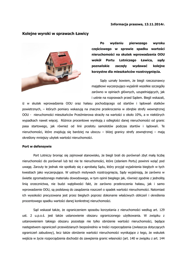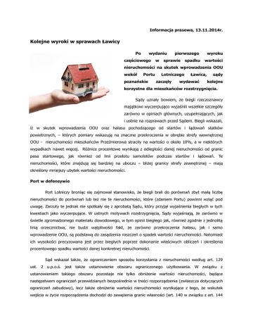 Informacja prasowa, 13.11.2014r. Kolejne wyroki w sprawach Ławicy Po wydaniu częściowego w pierwszego sprawie spadku wyroku wartości nieruchomości na skutek wprowadzenia OOU wokół Portu poznańskie Lotniczego zaczęły Ławica, wydawać sądy kolejne korzystne dla mieszkańców rozstrzygnięcia. Sądy uznały bowiem, że biegli rzeczoznawcy majątkowi wyczerpująco wyjaśnili wszelkie szczegóły zarówno w opiniach głównych, uzupełniających, jak i ustnie na rozprawach przed Sądem. Biegli wskazali, iż w skutek wprowadzenia OOU oraz hałasu pochodzącego od startów i lądowań statków powietrznych, – których pomiary wskazują na znaczne przekroczenia w obrębie strefy wewnętrznej OOU - nieruchomości mieszkańców Przeźmierowa straciły na wartości o około 10%, a w niektórych wypadkach nawet więcej. Różnice procentowe wynikają z odległości danej nieruchomości od granic pasa startowego, jak również od linii przelotu samolotów podczas startów i lądowań. Te nieruchomości, które znajdują się bardziej na uboczu – bliżej granicy strefy zewnętrznej – mają określony mniejszy ubytek wartości nieruchomości. Port w defensywie Port Lotniczy broniąc się zajmował stanowisko, że biegli brali do porównań zbyt małą liczbę nieruchomości do porównań lub też nie te nieruchomości, które (zdaniem Portu) powinni wziąć pod uwagę. Zarzuty te jednak nie spotkały się z aprobatą Sądu, który przyjął wyjaśnienia biegłych w tych kwestiach jako wyczerpujące. W ustnych motywach rozstrzygnięcia, Sądy wyjaśniają, że zarówno w świetle zgromadzonego materiału dowodowego, w tym opinii biegłego jak, również zgodnie z jednolitą linią orzecznictwa, nie budzi wątpliwości fakt, że zarówno przekroczenia hałasu, jak i samo wprowadzenie OOU, są podstawą do zasądzenia roszczeń o spadek wartości nieruchomości. Natomiast ich wysokości precyzowana jest przez biegłych poprzez dokonanie właściwych obliczeń i określenia procentowego spadku wartości danej konkretnej nieruchomości. Sąd wskazał także, że ograniczeniem sposobu korzystania z nieruchomości według art. 129 ust. 2 u.p.o.ś. jest także ustanowienie obszaru ograniczonego użytkowania. W związku z ustanowieniem takiego obszaru pozostaje nie tylko obniżenie wartości nieruchomości, będące następstwem ograniczeń przewidzianych bezpośrednio w treści rozporządzenia (zwłaszcza dotyczących ograniczeń zabudowy), lecz także obniżenie wartości nieruchomości wynikające z tego, że wskutek wejścia w życie rozporządzenia dochodzi do zawężenia granic własności (art. 140 w związku z art. 144 k.c.). Tym samym powstaje sytuacja zmienijszenia wyłącznego władztwa właściciela względem nieruchomości położonej na obszarze ograniczonego użytkowania, który będzie musiał znosić dopuszczalne na tym obszarze utrudnienia, w tym - hałas. Wątpliwości w sprawie rewitalizacji Kwestia roszczenia rewitalizacyjnego, jest sprawą bardziej złożoną. Co do tego roszczenia wątpliwości ma nie tylko Sąd, ale i sami biegli. Port Lotniczy Ławica nie podaje bowiem szczegółowych danych w prezentowanych przez niego pomiarach monitoringowych, np. nie podaje wartości maksymalnego poziomu hałasu oraz poziomu równoważnego hałasu (choć mógłby to zrobić, gdyż takimi danymi dysponuje). Biegli muszą sami obliczać te wartości na podstawie albo własnych pomiarów (robią to biegli akustycy) albo danych porównawczych np. z lotniska im. Chopina w Warszawie z obszaru najbardziej zbliżonego poziomem hałasu do Lotniska Ławica. Kolejnym problemem jest określenie liczby równoważnych lotów samolotów realizowanych od strony Przeźmierowa w porze nocnej, w porównaniu z lotami od strony Poznania. Już w Raporcie oddziaływania Lotniska Ławica na środowisko wskazano, że 75% lotów odbywa się od strony Przeźmierowa. Jednak, dla biegłych istotne znaczenie dla zastosowania norm polskich ma to, czy liczba równoważnych lotów w porze nocnej przekracza 8 nad nieruchomościami położonymi w Przeźmierowie. Biegli nie mogą tego stwierdzić jak to będzie wyglądać do roku 2034, a zatem daty, do jakiej obowiązuje OOU. Od częściowych wyroków przysługuje każdej ze stron apelacja. Port Lotniczy pierwsze apelacje już złożył. Teraz przyjrzy się im Sąd. Anna Brykczyńska adwokat --Dystrybucja materiałów: Agata Gajewy [email protected] kom./+48/ 730 -311-112