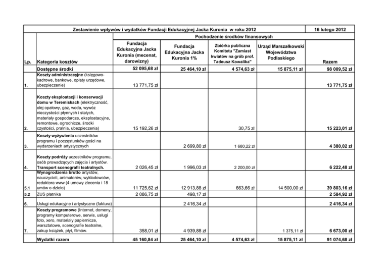 Zestawienie wpływów i wydatków Fundacji Edukacyjnej Jacka Kuronia w roku 2012 16 lutego 2012 Pochodzenie środków finansowych Fundacja Edukacyjna Jacka Kuronia (mecenat, darowizny) Lp. Kategoria kosztów Dostępne środki 52 095,68 zł 1. Koszty administracyjne (księgowokadrowe, bankowe, opłaty urzędowe, ubezpieczenie) 13 771,75 zł 2. Koszty eksploatacji i konserwacji domu w Teremiskach (elektryczność, olej opałowy, gaz, woda, wywóz nieczystości płynnych i stałych, materiały gospodarcze, eksploatacyjne, remontowe, ogrodnicze, środki czystości, pralnia, ubezpieczenia) 15 192,26 zł 3. Koszty wyżywienia uczestników programu i poczęstunków gości na wydarzeniach artystycznych 5.1 Koszty podróży uczestników programu, osób prowadzących zajęcia i artystów. Transport scenografii teatralnych. Wynagrodzenia brutto artystów, nauczycieli, animatorów, wykładowców, redaktora www (4 umowy zlecenia i 18 umów o dzieło) 5.2 ZUS płatnika 6. Usługi edukacyjne i artystyczne (faktura) Koszty programowe (Internet, domeny, programy komputerowe, serwis, usługi foto, xero, materiały papiernicze, warsztatowe, scenografie teatralne, zakup książek, płyt, filmów. 4. 7. Wydatki razem Fundacja Edukacyjna Jacka Kuronia 1% 25 464,10 zł Zbiórka publiczna Urząd Marszałkowski Komitetu "Zamiast Województwa kwiatów na grób prof. Podlaskiego Tadeusz Kowalika" 4 574,63 zł 15 875,11 zł Razem 98 009,52 zł 13 771,75 zł 30,75 zł 15 223,01 zł 2 699,80 zł 1 680,22 zł 4 380,02 zł 2 026,45 zł 1 996,03 zł 2 200,00 zł 6 222,48 zł 11 725,62 zł 2 086,75 zł 12 913,88 zł 498,17 zł 663,66 zł 14 500,00 zł 2 416,34 zł 358,01 zł 4 939,88 zł 45 160,84 zł 25 464,10 zł 39 803,16 zł 2 584,92 zł 2 416,34 zł 4 574,63 zł 1 375,11 zł 6 673,00 zł 15 875,11 zł 91 074,68 zł