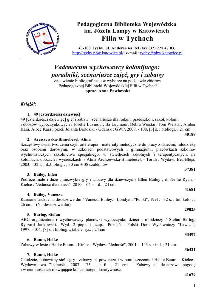 Pedagogiczna Biblioteka Wojewódzka im. Józefa Lompy w Katowicach Filia w Tychach 43-100 Tychy, ul. Andersa 6a, tel./fax (32) 227 47 03, http://tychy.pbw.katowice.pl/; e-mail: [email protected] Vademecum wychowawcy kolonijnego: poradniki, scenariusze zajęć, gry i zabawy zestawienie bibliograficzne w wyborze na podstawie zbiorów Pedagogicznej Biblioteki Wojewódzkiej Filii w Tychach oprac. Anna Pawłowska Książki: 1. 49 [czterdzieści dziewięć] 49 [czterdzieści dziewięć] gier i zabaw : scenariusze dla rodzin, przedszkoli, szkół, kolonii i obozów wypoczynkowych / Josette Luvmour, Ba Luvmour, Debra Weistar, Tom Weistar, Amber Kara, Albee Kara ; przeł. Jolanta Bartosik. - Gdańsk : GWP, 2008. - 108, [3] s. : bibliogr. ; 21 cm 40188 2. Arciszewska-Binnebesel, Alina Szczęśliwy świat tworzenia czyli arteterapia : materiały metodyczne do pracy z dziećmi, młodzieżą oraz osobami dorosłymi, w szkołach podstawowych i gimnazjum., placówkach szkolnowychowawczych szkolnictwa specjalnego, w świetlicach szkolnych i terapeutycznych, na koloniach, obozach i wycieczkach / Alina Arciszewska-Binnebesel. - Toruń : Wydaw. Bea-Bleja, 2003. - 32 s. : il.,bibliogr. ; 30 cm + 38 szablonów 37381 3. Bailey, Ellen Podróże małe i duże : niezwykłe gry i zabawy dla dziewczyn / Ellen Bailey ; il. Nellie Ryan. Kielce : "Jedność dla dzieci", 2010. - 64 s. : il. ; 24 cm 41681 4. Bailey, Vanessa Karciane tricki : na deszczowe dni / Vanessa Bailey. - Londyn : "Punkt", 1991. - 32 s. : fot. kolor. ; 26 cm. - (Na deszczowe dni) 29025 5. Barłóg, Stefan ABC organizatora i wychowawcy placówki wypoczynku dzieci i młodzieży / Stefan Barłóg, Ryszard Jankowski. - Wyd. 2 popr. i uzup.. - Poznań : Polski Dom Wydawniczy "Ławica", 1997. - 104, [7] s. : bibliogr., tabele, rys. ; 24 cm 33497 6. Baum, Heike Zabawy w lesie / Heike Baum. - Kielce : Wydaw. "Jedność", 2001. - 143 s. : ind. ; 21 cm 36421 7. Baum, Heike Chodźcie, pobawimy się! : gry i zabawy na powietrzu i w pomieszczeniu / Heike Baum. - Kielce : Wydawnictwo "Jedność", 2007. - 173 s. : il. ; 21 cm. - Zabawy na deszczową pogodę i w ciemnościach rozwijające koncentracje i kreatywność. 41679 1 8. Bondarowicz, Marian Forma zabawowa w nauczaniu sportowych gier zespołowych / Marian Bondarowicz. -Warszawa : Wydawnictwo „Sport i Turystyka”, 1983. - 448, [1] s. ; 20 cm 20072, 20073, 20075, 21112, 21114 9. Borowiecki, Stanisław Gry i zabawy na koloniach i zimowiskach / Stanisław Borowiecki, Maria Klimowa. - Wyd. 2. - Warszawa : Instytut WZZ, 1985. - 240 s. : il. ; 20 cm 23411 10. Busz, Jacek Gramy w siatkówkę / Jacek Busz. - Warszawa : Wydaw. Sport i Turystyka, 1975. - 235, [4] s. : il. ; 16 cm 10988 11. Campbell, Guy Podróże małe i duże : niezwykłe gry i zabawy dla chłopców / Guy Campbell ; il. Paul Moran. - Kielce : "Jedność dla dzieci", 2010. - 64 s. : il. ; 24 cm 41682 12. Chawa, Joanna Moje podróże : konspekty zajęć grupowych dla dzieci / Joanna Chawa, Anita Witczak. -Tychy : Maternus Media, 2001. - 51 s. ; 21 cm 36086 13. Czajkowski, Kazimierz Wychowanie do rekreacji / Kazimierz Czajkowski. - Warszawa : WSiP, 1979. - 200 s. : bibliogr. ; 20 cm 14883, 14884, 14885 14. Ćwirko-Godycki, Jerzy Proste gry i zabawy matematyczne w domu i na wakacjach / Jerzy Ćwirko-Godycki, Janina Karczmarczyk, Jolanta Makowska. - Warszawa : Instytut Wydawniczy CRZZ, 1980. - 147, [1] s. : rys. ; 19x21 cm. - (Rekreacja Relaks Rozrywka) 16775, 16776 15. Denek, Kazimierz Na turystycznych szlakach Polski / Kazimierz Denek. - [Toruń] : Wydaw. Adam Marszałek, [1996]. - 240 s. : bibliogr. ; 21 cm 33907 16. Denek, Kazimierz Współczesny obóz wędrowny młodzieży / Kazimierz Denek. - Warszawa : PTTK, 1978. - 66, [1] s. : bibliogr. ; 21 cm 517p 17. Erkert, Andrea Dzieci potrzebują ciszy : zabawy relaksacyjne na wiosnę, lato, jesień i zimę / Andrea Erkert. Kielce : Wydawnictwo "Jedność", 2001. - 96 s. ; 21 cm 37088 18. Fritz, Sabine Gry i zabawy na cały rok / Sabine Fritz; [il. Doris Oppenauer]. - Brema : Wydawnictwo MAK, 2010. - 144 s. : il. ; 29 cm 41235 19. Gajos, Iwona Gry i zabawy dydaktyczne podczas zajęć terenowych w lesie / Iwona Gajos. - Wilkowice : Wydawnictwo "Dla szkoły", 2005. - 48 s. ; 24 cm 40582 2 20. Griesbeck, Josef Zabawy uczące współzawodnictwa i wygrywania : propozycje dla dzieci i młodzieży / Josef Griesbeck. - Kielce : Wydawnictwo "Jedność", 2007. - 144 s. : il. ; 20 cm 39292 21. Kalinowski, Adam Harce : ćwiczenia i gry terenowe / Adam Kalinowski. - Warszawa : Sport i Turystyka, 1957. - 226, [2] s. : bibliogr. ; 17 cm 1646 22. Ligęza, Adam Vademecum wychowawcy kolonijnego / Adam Ligęza. - Kraków : Wydaw. eSPe, 2010. - 157 s. : il. ; 27 cm 41750 23. Łobożewicz, Tadeusz Obozy wędrowne / Tadeusz Łobożewicz. - Warszawa : MAW, 1979. - 210, [4] s. : bibliogr. ; 21 cm 15469, 15470 24. Malkiewicz, Mariola Chodźmy się bawić : 150 zabaw dla dzieci / Mariola Malkiewicz. - Gdańsk : Wydawnictwo HARMONIA, 2009. - 181 s. ; 21 cm 40975 25. Michalec, Bogusław Świat zagadek : 100 zagadek dla najmłodszych / Bogusław Michalec ; il. Anna KaszubaDębska. - Kraków : Wydawnictwo AKSJOMAT, 2009. - [46] s. : il. kolor. ; 23 cm 41541 26. Mikułowski, Jan Koszykówka / Jan Mikułowski, Halina Oszast. - Warszawa : Wydawnictwo „Sport i Turystyka", 1976. - 266, [1] s. ; 21 cm 12964 27. Na Na wczasach bezpiecznie : zbiór przepisów i wytycznych dotyczących ochrony zdrowia i życia dzieci i młodzieży na wczasach. - Wyd. 4 popr. i zmien.. - Warszawa : MAW, 1973. -198, [2] s. ; 16 cm 13886, 13887 28. Noga, Ewa Stare i nowe zabawy podwórkowe / Ewa Noga, Anna Wasilak. - Lublin : Klanza, 2002. - 46 s. : bibliogr., il. ; 24 cm 40892 29. Organizacja Organizacja wypoczynku dzieci i młodzieży / pr. zb.. - Warszawa : IWZZ, 1981. - 270, [2] s. : tabele ; 21 cm 17737, 17738, 17739, 21620 30. Parolini, Marsilio Gry i zabawy na powietrzu / tekst Marsilio Parolini ; przeł. Wiesława Dzieża ; rys. Rafał Szłapa. - Kr