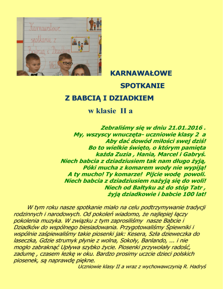 KARNAWAŁOWE SPOTKANIE Z BABCIĄ I DZIADKIEM w klasie II a Zebraliśmy się w dniu 21.01.2016 . My, wszyscy wnuczęta- uczniowie klasy 2 a Aby dać dowód miłości swej dziś! Bo to wielkie święto, o którym pamięta każda Zuzia , Hania, Marcel i Gabryś. Niech babcia z dziadziusiem tak nam długo żyją, Póki mucha z komarem wody nie wypiją! A ty mucho! Ty komarze! Pijcie wodę powoli. Niech babcia z dziadziusiem nażyją się do woli! Niech od Bałtyku aż do stóp Tatr , żyją dziadkowie i babcie 100 lat! W tym roku nasze spotkanie miało na celu podtrzymywanie tradycji rodzinnych i narodowych. Od pokoleń wiadomo, że najlepiej łączy pokolenia muzyka. W związku z tym zaprosiliśmy nasze Babcie i Dziadków do wspólnego biesiadowania. Przygotowaliśmy Śpiewniki i wspólnie zaśpiewaliśmy takie piosenki jak: Kesera, Szła dzieweczka do laseczka, Gdzie strumyk płynie z wolna, Sokoły, Banlando, ... i nie mogło zabraknąć Upływa szybko życie. Piosenki przywołały radość, zadumę , czasem łezkę w oku. Bardzo prosimy uczcie dzieci polskich piosenek, są naprawdę piękne. Uczniowie klasy II a wraz z wychowawczynią R. Hadryś Krótka fotorelacja. Szkoda, że zdjęcia nie wydają głosu:), ale my mamy dla siebie filmiki. Zaprosiliśmy już Gości na następny rok:)