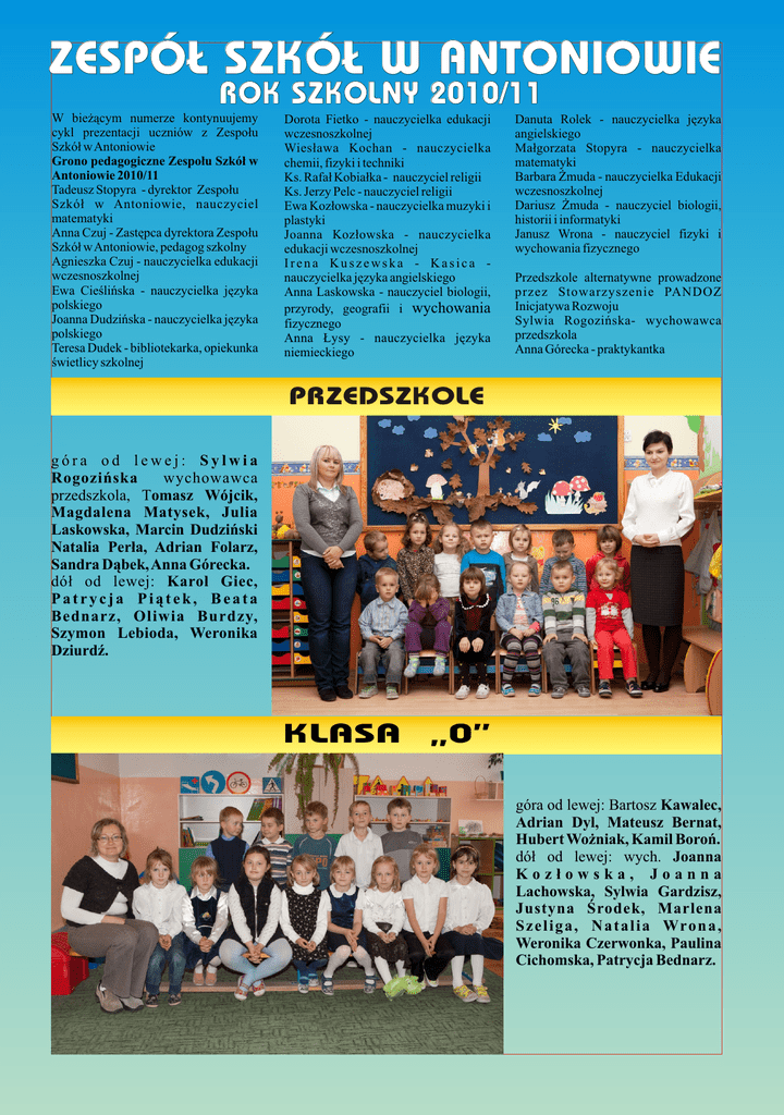 ZESPÓŁ SZKÓŁ W ANTONIOWIE ROK SZKOLNY 2010/11 W bieżącym numerze kontynuujemy cykl prezentacji uczniów z Zespołu Szkół w Antoniowie Grono pedagogiczne Zespołu Szkół w Antoniowie 2010/11 Tadeusz Stopyra - dyrektor Zespołu Szkół w Antoniowie, nauczyciel matematyki Anna Czuj - Zastępca dyrektora Zespołu Szkół w Antoniowie, pedagog szkolny Agnieszka Czuj - nauczycielka edukacji wczesnoszkolnej Ewa Cieślińska - nauczycielka języka polskiego Joanna Dudzińska - nauczycielka języka polskiego Teresa Dudek - bibliotekarka, opiekunka świetlicy szkolnej Dorota Fietko - nauczycielka edukacji wczesnoszkolnej Wiesława Kochan - nauczycielka chemii, fizyki i techniki Ks. Rafał Kobiałka - nauczyciel religii Ks. Jerzy Pelc - nauczyciel religii Ewa Kozłowska - nauczycielka muzyki i plastyki Joanna Kozłowska - nauczycielka edukacji wczesnoszkolnej Irena Kuszewska - Kasica nauczycielka języka angielskiego Anna Laskowska - nauczyciel biologii, przyrody, geografii i wychowania fizycznego Anna Łysy - nauczycielka języka niemieckiego Danuta Rolek - nauczycielka języka angielskiego Małgorzata Stopyra - nauczycielka matematyki Barbara Żmuda - nauczycielka Edukacji wczesnoszkolnej Dariusz Żmuda - nauczyciel biologii, historii i informatyki Janusz Wrona - nauczyciel fizyki i wychowania fizycznego Przedszkole alternatywne prowadzone przez Stowarzyszenie PANDOZ Inicjatywa Rozwoju Sylwia Rogozińska- wychowawca przedszkola Anna Górecka - praktykantka PRZEDSZKOLE góra od lewej: Sylwia Rogozińska wychowawca przedszkola, Tomasz Wójcik, Magdalena Matysek, Julia Laskowska, Marcin Dudziński Natalia Perła, Adrian Folarz, Sandra Dąbek, Anna Górecka. dół od lewej: Karol Giec, Patrycja Piątek, Beata Bednarz, Oliwia Burdzy, Szymon Lebioda, Weronika Dziurdź. KLASA „0” góra od lewej: Bartosz Kawalec, Adrian Dyl, Mateusz Bernat, Hubert Wożniak, Kamil Boroń. dół od lewej: wych. Joanna Kozłowska, Joanna Lachowska, Sylwia Gardzisz, Justyna Środek, Marlena S z e l i g a , N a t a l i a Wro n a , Weronika Czerwonka, Paulina Cichomska, Patrycja Bednarz.