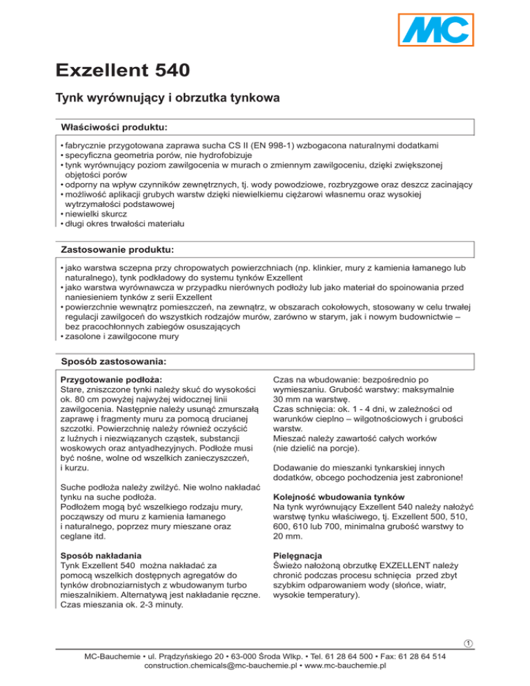 Exzellent 540 Tynk wyrównujący i obrzutka tynkowa Właściwości produktu: •fabrycznie przygotowana zaprawa sucha CS II (EN 998-1) wzbogacona naturalnymi dodatkami •specyficzna geometria porów, nie hydrofobizuje •tynk wyrównujący poziom zawilgocenia w murach o zmiennym zawilgoceniu, dzięki zwiększonej objętości porów •odporny na wpływ czynników zewnętrznych, tj. wody powodziowe, rozbryzgowe oraz deszcz zacinający •możliwość aplikacji grubych warstw dzięki niewielkiemu ciężarowi własnemu oraz wysokiej wytrzymałości podstawowej •niewielki skurcz •długi okres trwałości materiału Zastosowanie produktu: •jako warstwa sczepna przy chropowatych powierzchniach (np. klinkier, mury z kamienia łamanego lub naturalnego), tynk podkładowy do systemu tynków Exzellent •jako warstwa wyrównawcza w przypadku nierównych podłoży lub jako materiał do spoinowania przed naniesieniem tynków z serii Exzellent •powierzchnie wewnątrz pomieszczeń, na zewnątrz, w obszarach cokołowych, stosowany w celu trwałej regulacji zawilgoceń do wszystkich rodzajów murów, zarówno w starym, jak i nowym budownictwie – bez pracochłonnych zabiegów osuszających •zasolone i zawilgocone mury Sposób zastosowania: Przygotowanie podłoża: Stare, zniszczone tynki należy skuć do wysokości ok. 80 cm powyżej najwyżej widocznej linii zawilgocenia. Następnie należy usunąć zmurszałą zaprawę i fragmenty muru za pomocą drucianej szczotki. Powierzchnię należy również oczyścić z luźnych i niezwiązanych cząstek, substancji woskowych oraz antyadhezyjnych. Podłoże musi być nośne, wolne od wszelkich zanieczyszczeń, i kurzu. Suche podłoża należy zwilżyć. Nie wolno nakładać tynku na suche podłoża. Podłożem mogą być wszelkiego rodzaju mury, począwszy od muru z kamienia łamanego i naturalnego, poprzez mury mieszane oraz ceglane itd. Sposób nakładania Tynk Exzellent 540 można nakładać za pomocą wszelkich dostępnych agregatów do tynków drobnoziarnistych z wbudowanym turbo mieszalnikiem. Alternatywą jest nakładanie ręczne. Czas mieszania ok. 2-3 minuty. Czas na wbudowanie: bezpośrednio po wymieszaniu. Grubość warstwy: maksymalnie 30 mm na warstwę. Czas schnięcia: ok. 1 - 4 dni, w zależności od warunków cieplno – wilgotnościowych i grubości warstw. Mieszać należy zawartość całych worków (nie dzielić na porcje). Dodawanie do mieszanki tynkarskiej innych dodatków, obcego pochodzenia jest zabronione! Kolejność wbudowania tynków Na tynk wyrównujący Exzellent 540 należy nałożyć warstwę tynku właściwego, tj. Exzellent 500, 510, 600, 610 lub 700, minimalna grubość warstwy to 20 mm. Pielęgnacja Świeżo nałożoną obrzutkę EXZELLENT należy chronić podczas procesu schnięcia przed zbyt szybkim odparowaniem wody (słońce, wiatr, wysokie temperatury). 1 MC-Bauchemie • ul. Prądzyńskiego 20 • 63-000 Środa Wlkp. • Tel. 61 28 64 500 • Fax: 61 28 64 514 [email protected] • www.mc-bauchemie.pl Dane Techniczne Exzellent 540: Parametr Jednostka miary Wartość Uwagi Uziarnienie mm 0-2,2 Gęstość kg/l ok. 1,4 Proporcje mieszania l ok. 5 ok. 5,5-6 na opakowanie 25 kg (jako tynk wyrównujący) na opakowanie (jako obrzutka) m² ok. 1 ok. 2,5 na opakowanie 25 kg przy grubości warstwy 20 mm na opakowanie 25 kg przy obrzutce na 100% powierzchni Wytrzymałość na rozciąganie przy zginaniu MPa ≥ 1 Po 28 dniach Zawartość porów powietrza w świeżej zaprawie: % ≥ 18 Temperatura podczas zastosowania °C ≥ + 5 - +30 temp. podłoża i powietrza Przewodnictwo cieplne ƛ W/m*K 0,47 wartość tabelaryczna Wydajność Właściwości produktu Exzellent 540: Certyfikat CE zgodny z EN 998-1 Sposób dostawy worek 25 kg 1 paleta (40 worków po 25 kg) Składowanie Przechowywać w oryginalnie zamkniętych opakowaniach przez 12 miesięcy w suchych pomieszczeniach. Chronić przed przemarzaniem i zawilgoceniem. Usuwanie odpadów W trosce o środowisko naturalne opakowania należy dokładnie opróżniać. Inne produkty z tej serii: Exzellent 500 tynk do nakładania maszynowego - szary Exzellent 510 tynk do nakładania ręcznego - szary Exzellent 520 obrzutka tynkarska Exzellent 600 tynk do nakładania maszynowego – biały Exzellent 610 tynk do nakładania ręcznego – biały Exzellent 700 tynk do nakładania maszynowego - barwny* Exzellent 750 tynk wygładzający biały + barwny * dostępny w 4 standardowych kolorach, inne kolory na specjalne zamówienie Uwaga! Wszelkie informacje zawarte w niniejszej karcie oparte są na naszym doświadczeniu i najlepszej wiedzy, jednakże nie mogą być traktowane jako prawnie wiążące. Należy bezwzględnie każdorazowo stosować się do prawodawstwa miejscowego, w zakresie przeznaczenia oraz zastosowania w obiektach budowlanych. Przy spełnieniu powyższych wymogów odpowiadamy za poprawność przekazanych informacji w ramach naszych Ogólnych Warunków Sprzedaży, Dostaw i Płatności. Wszelkie doradztwo ze strony naszych Współpracowników, odbiegające od treści naszych kart technicznych, jest wiążące jedynie w przypadku pisemnego ich potwierdzenia. W każdym przypadku należy stosować się do ogólnie obowiązujących zasad sztuki budowlanej. Wydanie 09/15. Niniejszy druk został zaktualizowany pod względem technicznym. Tym samym unieważnia się dotychczasowe wydania i nie wolno ich stosować. W przypadku wydania nowej karty, zaktualizowanej pod względem technicznym, niniejsze wydanie traci ważność. MC-Bauchemie • ul. Prądzyńskiego 20 • 63-000 Środa Wlkp. • Tel. 61 28 64 500 • Fax: 61 28 64 514 [email protected] • www.mc-bauchemie.pl 2