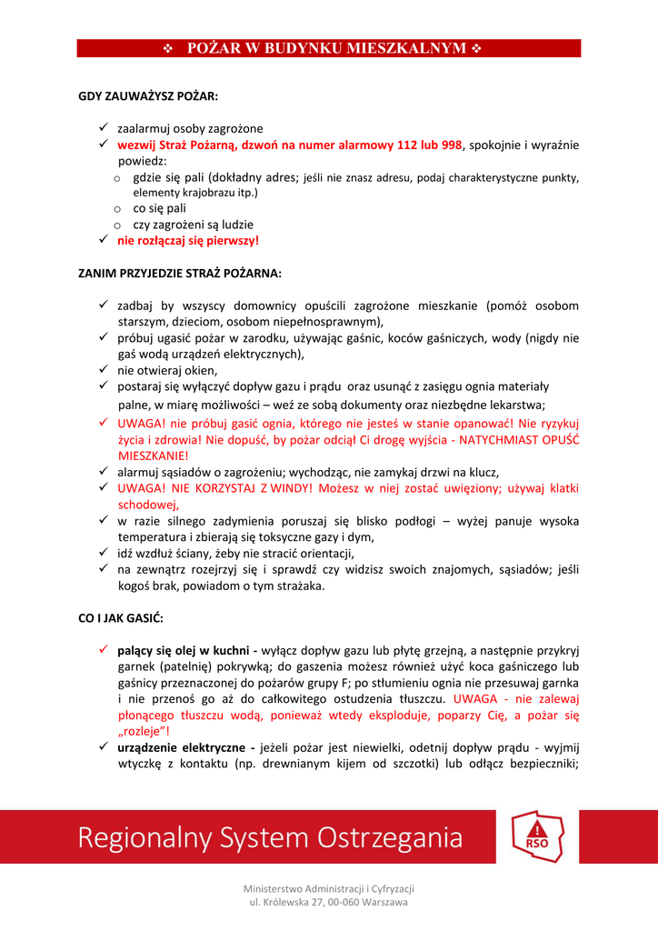 POŻAR W BUDYNKU MIESZKALNYM GDY ZAUWAŻYSZ POŻAR: zaalarmuj osoby zagrożone wezwij Straż Pożarną, dzwoń na numer alarmowy 112 lub 998, spokojnie i wyraźnie powiedz: o gdzie się pali (dokładny adres; jeśli nie znasz adresu, podaj charakterystyczne punkty, elementy krajobrazu itp.) o co się pali o czy zagrożeni są ludzie nie rozłączaj się pierwszy! ZANIM PRZYJEDZIE STRAŻ POŻARNA: zadbaj by wszyscy domownicy opuścili zagrożone mieszkanie (pomóż osobom starszym, dzieciom, osobom niepełnosprawnym), próbuj ugasić pożar w zarodku, używając gaśnic, koców gaśniczych, wody (nigdy nie gaś wodą urządzeń elektrycznych), nie otwieraj okien, postaraj się wyłączyć dopływ gazu i prądu oraz usunąć z zasięgu ognia materiały palne, w miarę możliwości – weź ze sobą dokumenty oraz niezbędne lekarstwa; UWAGA! nie próbuj gasić ognia, którego nie jesteś w stanie opanować! Nie ryzykuj życia i zdrowia! Nie dopuść, by pożar odciął Ci drogę wyjścia - NATYCHMIAST OPUŚĆ MIESZKANIE! alarmuj sąsiadów o zagrożeniu; wychodząc, nie zamykaj drzwi na klucz, UWAGA! NIE KORZYSTAJ Z WINDY! Możesz w niej zostać uwięziony; używaj klatki schodowej, w razie silnego zadymienia poruszaj się blisko podłogi – wyżej panuje wysoka temperatura i zbierają się toksyczne gazy i dym, idź wzdłuż ściany, żeby nie stracić orientacji, na zewnątrz rozejrzyj się i sprawdź czy widzisz swoich znajomych, sąsiadów; jeśli kogoś brak, powiadom o tym strażaka. CO I JAK GASIĆ: palący się olej w kuchni - wyłącz dopływ gazu lub płytę grzejną, a następnie przykryj garnek (patelnię) pokrywką; do gaszenia możesz również użyć koca gaśniczego lub gaśnicy przeznaczonej do pożarów grupy F; po stłumieniu ognia nie przesuwaj garnka i nie przenoś go aż do całkowitego ostudzenia tłuszczu. UWAGA - nie zalewaj płonącego tłuszczu wodą, ponieważ wtedy eksploduje, poparzy Cię, a pożar się „rozleje”! urządzenie elektryczne - jeżeli pożar jest niewielki, odetnij dopływ prądu - wyjmij wtyczkę z kontaktu (np. drewnianym kijem od szczotki) lub odłącz bezpieczniki; Ministerstwo Administracji i Cyfryzacji ul. Królewska 27, 00-060 Warszawa możesz ugasić pożar gaśnicą, kocem gaśniczym, wodą lub piaskiem. UWAGA – nie gaś wodą urządzeń elektrycznych! gdy zapaliło się na tobie ubranie – nie biegnij, spowoduje to zwiększenie płomienia; połóż się na ziemi i obracaj/turlaj się do chwili zduszenia ognia. człowiek, na którym pali się ubranie - najczęściej będzie biegł, uciekał, wtedy należy go przewrócić twarzą do ziemi, aby nie wdychał gorącego i toksycznego dymu; płonącą odzież ugasić kocem gaśniczym; jeśli go nie masz, użyj swojego ubrania lub innego dużego kawałka materiału, a także wody; gaszenie rozpocznij od głowy, przesuwając się w kierunku stóp. GDY POŻAR ODETNIE DROGĘ EWAKUACJI: idź do pokoju z oknem lub balkonem, znajdującego się jak najdalej od miejsca pożaru, zamknij za sobą drzwi (nie zamykaj ich na klucz) osłaniaj usta mokrym ręcznikiem lub innym materiałem, wzywaj pomoc, jeśli temperatura i zadymienie wzrastają: połóż się na balkonie lub pod oknem i przykryj szczelnie trudno palnym okryciem(mokry ręcznik, prześcieradło). GDY PALI SIĘ SĄSIEDNIE MIESZKANIE: jeśli to możliwe – ostrzeż zagrożone osoby i wyjdź z budynku, gdy zagrożenie jest duże, zostań w swoim mieszkaniu i zamknij drzwi wejściowe na klamkę, w miarę możliwości usuń materiały palne z balkonu, tj. rozwieszone pranie, papierowe opakowania itp., zamknij okna - do mieszkania może dostać się dym lub ogień, przygotuj zapas wody – napełnij wannę, wiadra, zlew w kuchni, zakręć zawór gazu, wyłącz wszystkie urządzenia zasilane energią elektryczną, zabezpiecz drzwi do mieszkania przed przedostawaniem się dymu do środka – w otwory i nieszczelności wciśnij mokry ręcznik; jeżeli poczujesz się zagrożony, wezwij pomoc przez otwarte okno lub z balkonu, staraj się być jak najdalej od miejsca, w którym są płomienie lub dym. GDY PALI SIĘ MIESZKANIE NA WYŻSZEJ KONDYGNACJI: zostań w mieszkaniu, chyba że strażacy każą Ci je opuścić; wychodząc z mieszkania, zamknij drzwi na klucz. Ministerstwo Administracji i Cyfryzacji ul. Królewska 27, 00-060 Warszawa POSTĘPOWANIE PO POŻARZE Nie wchodź do zniszczonego przez ogień budynku, zanim właściwe służby nie stwierdzą że jest bezpieczny, Zachowaj czujność i uwagę gdyż elementy konstrukcyjne budynku mogą być osłabione i wymagać naprawy Nie korzystaj z urządzeń elektrycznych przed sprawdzeniem instalacji przez elektryka Jeśli został wyłączony główny zawór gazu przed ponownym włączeniem wezwij administratora budynku lub pogotowie gazowe Wyrzuć produkty żywnościowe i napoje(w tym zawartość lodówki i zamrażarki) oraz lekarstwa które były narażone na działanie wysokiej temperatury i dymu. BĄDŹ PRZYGOTOWANY NA WYPADEK POŻARU : wyposaż swój dom w gaśnicę i koc gaśniczy (przechowuj je w miejscu łatwo dostępnym) w miarę możliwości zamontuj detektor dymu i czujnik czadu nie blokuj dróg ewakuacyjnych, nie ustawiaj przedmiotów utrudniających wyjście nie montuj stałych krat w oknach i na klatkach schodowych, jeśli Twoje mieszkanie musi być wyposażone w kraty- zakładaj takie które można otworzyć od wewnątrz, klucz przechowuj w miejscu znanym wszystkim domownikom zapoznaj rodzinę z usytuowaniem oraz sposobem wyłączenia głównych wyłączników prądu i gazu dokonuj regularnych przeglądów przewodów kominowych oraz dbaj o sprawność urządzeń elektrycznych i gazowych materiałów łatwopalnych i otwartego ognia używaj z zachowaniem ostrożności. Ministerstwo Administracji i Cyfryzacji ul. Królewska 27, 00-060 Warszawa Ministerstwo Administracji i Cyfryzacji ul. Królewska 27, 00-060 Warszawa