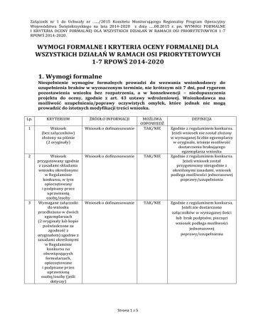Załącznik nr 1 do Uchwały nr .…../2015 Komitetu Monitorującego Regionalny Program Operacyjny Województwa Świętokrzyskiego na lata 2014-2020 z dnia …..08.2015 r. pn. WYMOGI FORMALNE I KRYTERIA OCENY FORMALNEJ DLA WSZYSTKICH DZIAŁAŃ W RAMACH OSI PRIORYTETOWYCH 1-7 RPOWŚ 2014-2020. WYMOGI FORMALNE I KRYTERIA OCENY FORMALNEJ DLA WSZYSTKICH DZIAŁAŃ W RAMACH OSI PRIORYTETOWYCH 1-7 RPOWŚ 2014-2020 1. Wymogi formalne Niespełnienie wymogów formalnych prowadzi do wezwania wnioskodawcy do uzupełnienia braków w wyznaczonym terminie, nie krótszym niż 7 dni, pod rygorem pozostawienia wniosku bez rozpatrzenia, a w konsekwencji – niedopuszczenia projektu do oceny, zgodnie z art. 43 ustawy wdrożeniowej. Wnioskodawca ma możliwość uzupełnienia/poprawy oczywistych omyłek, które jednak nie mogą prowadzić do istotnych modyfikacji treści wniosku. Lp. KRYTERIUM ŹRÓDŁO INFORMACJI 1 Wniosek (bez załączników) złożony na piśmie (2 oryginały) Wniosek o dofinansowanie MOŻLIWA ODPOWIEDŹ TAK/NIE 2 Wniosek przygotowany zgodnie z zasadami składania wniosku określonymi w Regulaminie konkursu, w tym opieczętowany i podpisany przez uprawnioną osobę/osoby Wymagane załączniki do wniosku przedłożono w dwóch egzemplarzach (2 oryginały lub kopie poświadczone za zgodność z oryginałem) zgodnie z zasadami określonymi w Regulaminie konkursu na obowiązujących formularzach, opieczętowane i podpisane przez uprawnioną osobę/osoby (jeśli dotyczy) Wniosek o dofinansowanie TAK/NIE Wniosek o dofinansowanie TAK/NIE 3 Strona 1 z 5 DEFINICJA Zgodnie z regulaminem konkursu. Jeżeli wniosek nie został złożony w wymaganej liczbie egzemplarzy w oryginale, istnieje możliwość dostarczenia brakującego egzemplarza wniosku Zgodnie z regulaminem konkursu. Jeżeli wniosek został przygotowany niezgodnie z określonymi zasadami, wniosek podlega możliwości jednorazowej poprawy/uzupełnienia Zgodnie z regulaminem konkursu. Jeżeli nie dostarczono załączników w wymaganej ilości lub brak podpisów, pieczęci wniosek podlega możliwości jednorazowej poprawy/uzupełnienia Załącznik nr 1 do Uchwały nr .…../2015 Komitetu Monitorującego Regionalny Program Operacyjny Województwa Świętokrzyskiego na lata 2014-2020 z dnia …..08.2015 r. pn. WYMOGI FORMALNE I KRYTERIA OCENY FORMALNEJ DLA WSZYSTKICH DZIAŁAŃ W RAMACH OSI PRIORYTETOWYCH 1-7 RPOWŚ 2014-2020. 2. Kryteria formalne Lp. KRYTERIUM ŹRÓDŁO INFORMACJI MOŻLIWA ODPOWIEDŹ TAK/NIE 1 Wniosek (bez załączników) wypełniony i przesłany w systemie e – Generator 2014-2020 e-Generator 2014-2020 2 Wniosek (bez załączników) złożony na piśmie (2 oryginały) tożsamy z wersją elektroniczną Wniosek o dofinansowanie, e-Generator 2014-2020 (suma kontrolna) TAK/NIE Zgodnie z regulaminem konkursu. Jeżeli wniosek w wersji papierowej nie jest tożsamy z wersją elektroniczną (różna suma kontrolna), wniosek zostaje odrzucony na etapie oceny formalnej - CZĘŚĆ A Karty oceny formalnej 3 Wniosek złożony w odpowiedzi na właściwe ogłoszenie konkursowe Wniosek o dofinansowanie* TAK/NIE 4 Wniosek złożony w terminie określonym w konkursie Pieczęć wpływu TAK/NIE 5 Wniosek złożony do właściwej instytucji Pieczęć wpływu TAK/NIE 6 Wnioskodawca/partnerzy uprawniony/uprawnieni jest/są do składania wniosku/otrzymania wsparcia Wniosek o dofinansowanie, dokumenty rejestrowe wnioskodawcy TAK/NIE 7 Wnioskodawca /partnerzy nie podlegają wykluczeniu z ubiegania się o dofinansowanie na Wniosek o dofinansowanie, oświadczenie wnioskodawcy TAK/NIE/NIE DOTYCZY Zgodnie z regulaminem konkursu. Jeżeli wniosek dotyczy innego działania, niż to, na które ogłoszono konkurs, wniosek zostaje odrzucony na etapie oceny formalnej - CZĘŚĆ A Karty oceny formalnej Zgodnie z regulaminem konkursu. Jeżeli wniosek wpłynął po terminie lub przed terminem określonym w ogłoszeniu, wniosek zostaje odrzucony na etapie oceny formalnej – CZĘŚĆ A Karty oceny formalnej Zgodnie z regulaminem konkursu. Jeżeli wniosek został złożony w innym miejscu niż wskazane w ogłoszeniu konkursowym, wniosek zostaje odrzucony na etapie oceny formalnej - CZĘŚĆ A Karty oceny formalnej Zgodnie z regulaminem konkursu. Jeżeli wnioskodawca/partner nie jest uprawniony do wsparcia, wniosek zostaje odrzucony na etapie oceny formalnej – CZĘŚĆ A Karty oceny formalnej Zgodnie z regulaminem konkursu. Jeżeli wnioskodawca/partnerzy podlegają wykluczeniu, wniosek zostaje odrzucony na etapie Strona 2 z 5 DEFINICJA Zgodnie z regulaminem konkursu. Wniosek złożony w formie papierowej a nie przesłany w systemie e-Generator 2014-2020, wniosek zostaje odrzucony na etapie oceny formalnej - CZĘŚĆ A Karty oceny formalnej Załącznik nr 1 do Uchwały nr .…../2015 Komitetu Monitorującego Regionalny Program Operacyjny Województwa Świętokrzyskiego na lata 2014-2020 z dnia …..08.2015 r. pn. WYMOGI FORMALNE I KRYTERIA OCENY FORMALNEJ DLA WSZYSTKICH DZIAŁAŃ W RAMACH OSI PRIORYTETOWYCH 1-7 RPOWŚ 2014-2020. podstawie: oceny formalnej - CZĘŚĆ A Karty oceny formalnej - art. 207 ust. 4 ustawy z dnia 27 sierpnia 2009 r. o finansach publicznych (t.j. Dz. U. z 2013 r. poz. 885 z późn. zm.); - art. 12 ust. 1 pkt 1 ustawy z dnia 15 czerwca 2012 r. o skutkach powierzania wykonywania pracy cudzoziemcom przebywającym wbrew przepisom na terytorium Rzeczypospolitej Polskiej (Dz. U. poz. 769); Kryterium nie stosuje się do podmiotów wymienionych w art. 207 ust 7 ustawy z dnia 27 sierpnia 2009 r. o finansach publicznych (t.j. Dz. U. z 2013 r. poz. 885 z późn. zm.); - art. 9 ust. 1 pkt 2a ustawy z dnia 28 października 2002 r. o odpowiedzialności podmiotów zbiorowych za czyny zabronione pod groźbą kary (t.j. Dz. U. z 2014 r. poz. 1417). 8 Wnioskodawca /partnerzy nie jest/są przedsiębiorstwem znajdującym się w trudnej sytuacji w rozumieniu art.2 ust18 Rozporządzenia Komisji (UE) nr 651/14 Wniosek o dofinansowanie, oświadczenie wnioskodawcy TAK/N