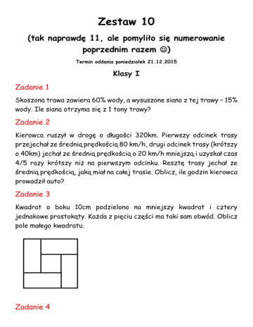 Zestaw 10 (tak naprawdę 11, ale pomyliło się numerowanie poprzednim razem ) Termin oddania poniedziałek 21.12.2015 Klasy I Zadanie 1 Skoszona trawa zawiera 60% wody, a wysuszone siano z tej trawy – 15% wody. Ile siana otrzyma się z 1 tony trawy? Zadanie 2 Kierowca ruszył w drogę o długości 320km. Pierwszy odcinek trasy przejechał ze średnią prędkością 80 km/h, drugi odcinek trasy (krótszy o 40km) jechał ze średnią prędkością o 20 km/h mniejszą i uzyskał czas 4/5 razy krótszy niż na pierwszym odcinku. Resztę trasy jechał ze średnią prędkością, jaką miał na całej trasie. Oblicz, ile godzin kierowca prowadził auto? Zadanie 3 Kwadrat o boku 10cm podzielono na mniejszy kwadrat i cztery jednakowe prostokąty. Każda z pięciu części ma taki sam obwód. Oblicz pole małego kwadratu. Zadanie 4 Wykaż, że liczba 102004+2 dzieli się przez 6. Klasy II Zadanie 1 Udowodnij, że jeśli a jest liczbą całkowitą, to liczba (2a+1)2-1 jest podzielna przez 8. Zadanie 2 Gdy beczka jest w 30 % pusta, to zawiera o 30 litrów wody więcej , niż jest w 30 % napełniona. Jaka jest pojemność beczki? Zadanie 3 Agnieszka i Dorota mieszkają na dwóch krańcach Warszawy – Tarchominie i Ursynowie. Agnieszka postanowiła pojechać na rowerze do Doroty. Po przejechaniu części drogi- odcinek, który już pokonała ma się tak do pozostałej części jak 2:3. Gdyby przejechała jeszcze 9 km, to ten stosunek wyniósłby 7:3. Jak daleko od siebie mieszkają dziewczęta ? Zadanie 4. Długości podstaw trapezu równoramiennego są równe 5 cm i 3 cm. Oblicz obwód tego trapezu, wiedząc, że jego przekątna zawarta jest w dwusiecznej kąta przy dłuższej podstawie. Klasy III Zadanie 1 Ile przekątnych ma siedemnastokąt foremny? Zadanie 2 Zmieniono zasady Ligi Mistrzów i od teraz każdy klub gra z każdym. Ile zostanie rozegranych spotkań, jeśli zgłosiły się 32 zespoły? Zadanie 3 Dwa krany napełniają basen w ciągu 15 godzin. Po 5 godzinach ich wspólnej pracy włączono dodatkowo jeszcze trzy identyczne krany. Ile łącznie będzie trwało napełnianie basenu? Zadanie 4 Ile lat ma siostra, jeśli 8 lat temu była dwa razy młodsza od brata, a teraz jej wiek stanowi 2/3 wieku brata?