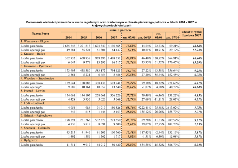 Porównanie wielkości przewozów w ruchu regularnym oraz czarterowym w okresie pierwszego półrocza w latach 2004 - 2007 w krajowych portach lotniczych suma: I półrocze Nazwa Portu 2004 1. Warszawa – Okęcie Liczba pasażerów Liczba operacji pax 2. Kraków – Balice Liczba pasażerów Liczba operacji pax 3. Katowice – Pyrzowice Liczba pasażerów Liczba operacji pax 4. Wrocław – Strachowice Liczba pasażerów Liczba operacji* 5. Poznań – Ławica Liczba pasażerów Liczba operacji pax 6. Łódź – Lublinek Liczba pasażerów Liczba operacji pax 7. Gdańsk – Rębiechowo Liczba pasażerów Liczba operacji pax 8. Szczecin – Goleniów Liczba pasażerów Liczba operacji pax 9. Bydgoszcz Liczba pasażerów 2005 2006 2007 2 635 848 3 221 813 3 693 340 4 196 665 49 884 55 324 61 304 64 437 zm. 07/06 zm. 06/05 zm. 05/04 zm. 07/04 udział w rynku I połowa 2007 13,63% 5,11% 14,64% 10,81% 22,23% 10,91% 59,21% 29,17% 48,88% 51,23% 302 932 6 047 668 938 9 779 979 296 1 408 352 13 295 16 717 43,81% 25,74% 46,40% 120,82% 35,95% 61,72% 364,91% 176,45% 16,40% 13,29% 173 905 3 361 458 380 5 231 583 172 6 654 794 125 8 486 36,17% 27,53% 27,22% 163,58% 27,20% 55,64% 356,64% 152,48% 9,25% 6,75% 159 644 9 688 188 883 10 161 338 438 10 052 593 241 13 640 75,29% 35,69% 79,18% -1,07% 18,32% 4,88% 271,60% 40,79% 6,91% 10,84% 154 061 4 428 144 107 3 936 258 661 5 026 356 226 5 669 37,72% 12,79% 79,49% -6,46% 27,69% -11,11% 131,22% 28,03% 4,15% 4,51% 4 054 842 986 615 91 919 1 446 150 526 2 153 63,76% 9222,41% -75,68% 3613,02% 48,89% 135,12% -26,96% 155,70% 1,75% 1,71% 198 591 4 736 281 263 5 818 532 372 8 091 773 650 9 600 45,32% 18,65% 89,28% 39,07% 41,63% 22,85% 289,57% 102,70% 9,01% 7,63% 43 215 1 492 41 946 1 586 91 205 1 562 100 760 1 717 10,48% 9,92% 117,43% -1,51% -2,94% 6,30% 133,16% 15,08% 1,17% 1,37% 11 711 9 917 64 912 80 420 23,89% 554,55% -15,32% 586,70% 0,94% Liczba operacji pax 10. Rzeszów Liczba pasażerów Liczba operacji pax 11. Zielona Góra Liczba pasażerów Liczba operacji pax 12. Szczytno Liczba pasażerów Liczba operacji pax Suma Liczba pasażerów Liczba operacji pax 7,23% 1,17% -9,51% -7,15% 257,99% 43,29% 1,49% 1,16% 100,00% 2,50% -17,87% 662,32% -77,08% 28,41% 43,52% 0,05% 0,34% - 0,00% 0,00% 33,46% 35,61% 130,63% 17,66% 13,01% 51,24% 100,00% 100,00% 1 370 527 1 340 1 469 9,63% 35 795 1 021 32 391 948 100 687 1 387 128 142 1 463 27,27% 5,48% 3 097 301 0 69 3 880 526 3 977 432 0 0 0 0 0 0 0 0 - 3 722 853 5 048 624 6 737 882 8 586 084 83 170 93 994 110 596 125 783 27,43% 13,73% 154,27% -61,53% 210,85% 46,31% - *w przypadku PL Wrocław -Strachowice zestawiono łączną ilość operacji Uwaga: dane nie uwzgledniaja pasażaerów w ruchu tranzytowym oraz G.A. Źródło: Opracowanie ULC na podstawie informacji uzyskanych z portów lotniczych, Warszawa, Lipiec 2007 -