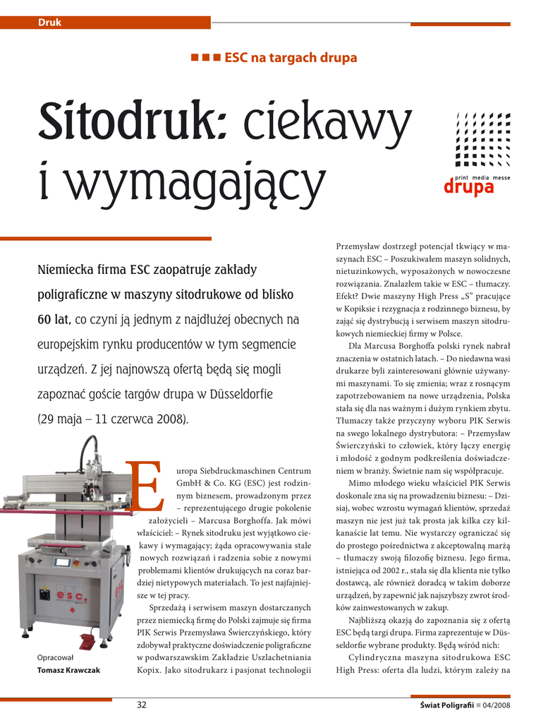 Druk r r r ESC na targach drupa Sitodruk: ciekawy i wymagający Niemiecka firma ESC zaopatruje zakłady poligraficzne w maszyny sitodrukowe od blisko 60 lat, co czyni ją jednym z najdłużej obecnych na europejskim rynku producentów w tym segmencie urządzeń. Z jej najnowszą ofertą będą się mogli zapoznać goście targów drupa w Düsseldorfie (29 maja – 11 czerwca 2008). Opracował Tomasz Krawczak uropa Siebdruckmaschinen Centrum GmbH & Co. KG (ESC) jest rodzinnym biznesem, prowadzonym przez – reprezentującego drugie pokolenie założycieli – Marcusa Borghoffa. Jak mówi właściciel: – Rynek sitodruku jest wyjątkowo ciekawy i wymagający; żąda opracowywania stale nowych rozwiązań i radzenia sobie z nowymi problemami klientów drukujących na coraz bardziej nietypowych materiałach. To jest najfajniejsze w tej pracy. Sprzedażą i serwisem maszyn dostarczanych przez niemiecką firmę do Polski zajmuje się firma PIK Serwis Przemysława Świerczyńskiego, który zdobywał praktyczne doświadczenie poligraficzne w podwarszawskim Zakładzie Uszlachetniania Kopix. Jako sitodrukarz i pasjonat technologii 32 Przemysław dostrzegł potencjał tkwiący w maszynach ESC – Poszukiwałem maszyn solidnych, nietuzinkowych, wyposażonych w nowoczesne rozwiązania. Znalazłem takie w ESC – tłumaczy. Efekt? Dwie maszyny High Press „S” pracujące w Kopiksie i rezygnacja z rodzinnego biznesu, by zająć się dystrybucją i serwisem maszyn sitodrukowych niemieckiej firmy w Polsce. Dla Marcusa Borghoffa polski rynek nabrał znaczenia w ostatnich latach. – Do niedawna wasi drukarze byli zainteresowani głównie używanymi maszynami. To się zmienia; wraz z rosnącym zapotrzebowaniem na nowe urządzenia, Polska stała się dla nas ważnym i dużym rynkiem zbytu. Tłumaczy także przyczyny wyboru PIK Serwis na swego lokalnego dystrybutora: – Przemysław Świerczyński to człowiek, który łączy energię i młodość z godnym podkreślenia doświadczeniem w branży. Świetnie nam się współpracuje. Mimo młodego wieku właściciel PIK Serwis doskonale zna się na prowadzeniu biznesu: – Dzisiaj, wobec wzrostu wymagań klientów, sprzedaż maszyn nie jest już tak prosta jak kilka czy kilkanaście lat temu. Nie wystarczy ograniczać się do prostego pośrednictwa z akceptowalną marżą – tłumaczy swoją filozofię biznesu. Jego firma, istniejąca od 2002 r., stała się dla klienta nie tylko dostawcą, ale również doradcą w takim doborze urządzeń, by zapewnić jak najszybszy zwrot środków zainwestowanych w zakup. Najbliższą okazją do zapoznania się z ofertą ESC będą targi drupa. Firma zaprezentuje w Düsseldorfie wybrane produkty. Będą wśród nich: Cylindryczna maszyna sitodrukowa ESC High Press: oferta dla ludzi, którym zależy na Świat Poligrafii r 04/2008 Druk wysokiej precyzji druku. Realizację najbardziej wymagających zleceń w doskonałej jakości gwarantuje nowoczesna technologia w połączeniu z elektroniczną kontrolą pracy, automatycznym pasowaniem i niezależnie regulowaną siłą docisku rakla. Urządzenie pracujące z prędkością do 3300 ark./godz. cechuje bardzo krótki czas narządu oraz łatwa i wygodna obsługa za pośrednictwem panelu dotykowego. High Press jest wyposażony w uniwersalny samonakładak z możliwością podawania arkuszy pojedynczo lub strumieniowo. Linia do automatycznego mycia i odwarstwiania siatek ESC nadaje nowy sens hasłu „czas to pieniądz”, oszczędzając także środki myjące i energię oraz chroniąc środowisko. Charakteryzuje się kompaktową budową, posiada komory myjące o długości zredukowanej do 500 mm, wykonane z materiału odpornego na rozpuszczalniki. Wyposażono ją w 24 dysze myjące na sektor, sterowane jednym napędem, dzięki czemu skutecznie domywa nawet trudne do usunięcia zabrudzenia. Nadaje się do rozbudowy o wysokowydajne systemy filtrujące. Maszyny sitodrukowe AT-P z dotykowym panelem kontrolnym obsługują materiały sztywne i elastyczne w sitodruku graficznym i przemysłowym. Urządzenia pracują z formatami od 400×600 do 700×1600 mm i podłożami do 300 mm. Zastosowano w nich innowacyjne, elektropneumatyczne sterowanie, które zapewnia idealnie płynny ruch głowicy drukującej oraz bardzo krótki czas narządu. Rakiel pracuje w zakresie od 0 do 835 mm/sek; maszyna wykonuje maksymalnie 800 cykli na godzinę. Maszyny sitodrukowe do wydruków na materiałach płaskich PAB obsługują formaty od 345×495 mm oraz okrągłe o średnicy do 150 mm. Wyposażone w elektro-pneumatyczny napęd oraz wygodny panel sterujący, umożliwiają precyzyjny i wydajny druk m.in. na częściach maszyn, skrzyniach i kontenerach na butelki o maks. wysokości podłoża 300 mm. Płynnie regulowana prędkość rakla w przedziale 100-500 mm/sek., 720 cykli/godz. Półautomat sitodrukowy AT-PTT z innowacyjnym rozwiązaniem do druku na trudnych materiałach: dwoma wysuwanymi blatami. Sterowanie elektro-pneumatyczne, standardowa 04/2008 r Świat Poligrafii grubość podłoży do 300 mm, płynnie regulowana prędkość rakla (50-675 mm/sek.) oraz 735 cykli/godz. Ploter Flora F1 180 UV-BA drukujący w czterech kolorach z tuszami UV w rozdzielczości do 600 dpi, na różnych typach paneli i materiałach z roli, PVC, banerach, pleksiglasie, drewnie, metalu itd. Wysokiej jakości druk może być wykonany zarówno na ciemnych, jak i transparentnych podłożach. Maksymalna szerokość druku wynosi 1830 mm na podłożach do grubości 25 mm. Precyzyjne prowadzenie głowicy oraz podsys na blacie pozwalają perfekcyjnie prowadzić proces druku. Dużej pojemności pojemniki na tusz (każdy kolor 2000 ml) pozwalają przedłużyć cykl druku. Podczas targów drupa do Państwa dyspozycji na stoisku ESC H3 C14 będą Marcus Borboff oraz Helmut Plail. W dniach 1-4 czerwca na pytania zwiedzających będzie odpowiadał Przemysław Świerczyński. SERDECZNIE ZAPRASZAMY! drupa, hala 03, stanowisko C14 [email protected