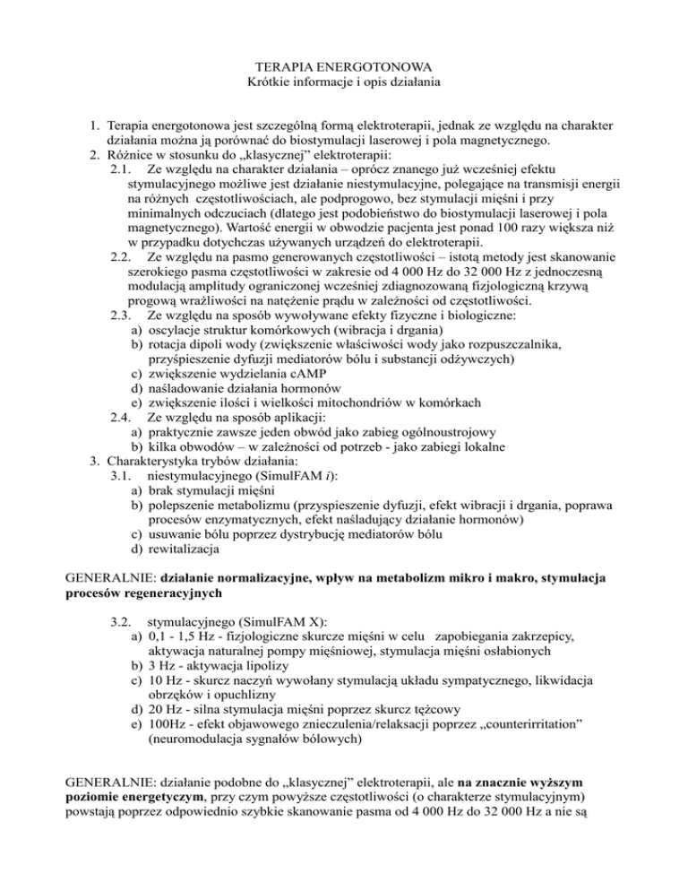 TERAPIA ENERGOTONOWA Krótkie informacje i opis działania 1. Terapia energotonowa jest szczególną formą elektroterapii, jednak ze względu na charakter działania moŜna ją porównać do biostymulacji laserowej i pola magnetycznego. 2. RóŜnice w stosunku do „klasycznej” elektroterapii: 2.1. Ze względu na charakter działania – oprócz znanego juŜ wcześniej efektu stymulacyjnego moŜliwe jest działanie niestymulacyjne, polegające na transmisji energii na róŜnych częstotliwościach, ale podprogowo, bez stymulacji mięśni i przy minimalnych odczuciach (dlatego jest podobieństwo do biostymulacji laserowej i pola magnetycznego). Wartość energii w obwodzie pacjenta jest ponad 100 razy większa niŜ w przypadku dotychczas uŜywanych urządzeń do elektroterapii. 2.2. Ze względu na pasmo generowanych częstotliwości – istotą metody jest skanowanie szerokiego pasma częstotliwości w zakresie od 4 000 Hz do 32 000 Hz z jednoczesną modulacją amplitudy ograniczonej wcześniej zdiagnozowaną fizjologiczną krzywą progową wraŜliwości na natęŜenie prądu w zaleŜności od częstotliwości. 2.3. Ze względu na sposób wywoływane efekty fizyczne i biologiczne: a) oscylacje struktur komórkowych (wibracja i drgania) b) rotacja dipoli wody (zwiększenie właściwości wody jako rozpuszczalnika, przyśpieszenie dyfuzji mediatorów bólu i substancji odŜywczych) c) zwiększenie wydzielania cAMP d) naśladowanie działania hormonów e) zwiększenie ilości i wielkości mitochondriów w komórkach 2.4. Ze względu na sposób aplikacji: a) praktycznie zawsze jeden obwód jako zabieg ogólnoustrojowy b) kilka obwodów – w zaleŜności od potrzeb - jako zabiegi lokalne 3. Charakterystyka trybów działania: 3.1. niestymulacyjnego (SimulFAM i): a) brak stymulacji mięśni b) polepszenie metabolizmu (przyspieszenie dyfuzji, efekt wibracji i drgania, poprawa procesów enzymatycznych, efekt naśladujący działanie hormonów) c) usuwanie bólu poprzez dystrybucję mediatorów bólu d) rewitalizacja GENERALNIE: działanie normalizacyjne, wpływ na metabolizm mikro i makro, stymulacja procesów regeneracyjnych 3.2. a) b) c) d) e) stymulacyjnego (SimulFAM X): 0,1 - 1,5 Hz - fizjologiczne skurcze mięśni w celu zapobiegania zakrzepicy, aktywacja naturalnej pompy mięśniowej, stymulacja mięśni osłabionych 3 Hz - aktywacja lipolizy 10 Hz - skurcz naczyń wywołany stymulacją układu sympatycznego, likwidacja obrzęków i opuchlizny 20 Hz - silna stymulacja mięśni poprzez skurcz tęŜcowy 100Hz - efekt objawowego znieczulenia/relaksacji poprzez „counterirritation” (neuromodulacja sygnałów bólowych) GENERALNIE: działanie podobne do „klasycznej” elektroterapii, ale na znacznie wyŜszym poziomie energetyczym, przy czym powyŜsze częstotliwości (o charakterze stymulacyjnym) powstają poprzez odpowiednio szybkie skanowanie pasma od 4 000 Hz do 32 000 Hz a nie są generowane przez urządzenie. 4. MoŜliwe obszary zastosowań: a) reumatologia i rehabilitacja (przewlekłe schorzenia stawów, zwłaszcza choroba zwyrodnieniowa, zespół bolesnego barku i ramienia, bóle kręgosłupa, stymulacja mięśni osłabionych) b) ortopedia i medycyna sportowa (stany pooperacyjne, po rekonstrukcjach, przyśpieszenie procesów gojenia się ran i zrostu kości, zaniki chrząstki i tkanki łącznej, obrzęki) c) neurologia (migreny, stany poudarowe, stwardnienie rozsiane, poraŜenia spastyczne i wiotkie) d) diabetologia i nefrologia (zapobieganie i leczenie neuropatii) e) ginekologia i urologia (torbiele jajników, przewlekły ból miedniczny, nietrzymanie moczu) f) dermatologia (owrzodzenia, oparzenia, otwarte rany) g) medycyna estetyczna (obrzęki, opuchlizny, zmarszczki, cellulit, lipoliza, przyspieszenie gojenia się po zabiegach, bmme twarzy, stóp, biustu) h) biologicznie modulowany masaŜ energotonowy – ujędrniający – drenaŜ limfatyczny – uczynniający pompę mięśniową – przeciwbólowy – rozluźniający)