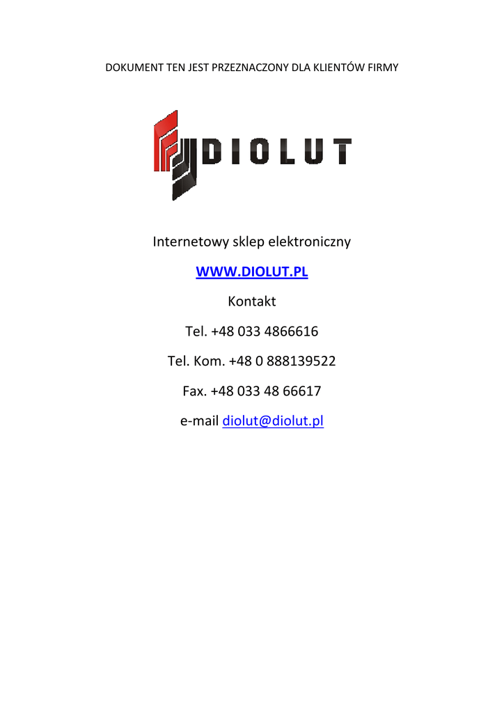 DOKUMENT TEN JEST PRZEZNACZONY DLA KLIENTÓW FIRMY Internetowy sklep elektroniczny WWW.DIOLUT.PL Kontakt Tel. +48 033 4866616 Tel. Kom. +48 0 888139522 Fax. +48 033 48 66617 e e-mail [email protected] UT 90B Miernik cyfrowy. Spis treści Wstęp.......................................................................................................................................... 1 Zawartość opakowania ............................................................................................................... 2 Bezpieczeństwo .......................................................................................................................... 2 Zasady bezpiecznego uŜytkowania ............................................................................................ 2 Międzynarodowe symbole elektryczne ...................................................................................... 3 Opis miernika ............................................................................................................................. 3 Przełącznik obrotowy................................................................................................................. 3 Przyciski funkcyjne .................................................................................................................... 4 Symbole na wyświetlaczu .......................................................................................................... 4 Pomiary ...................................................................................................................................... 4 A Pomiary napięcia AC/DC ................................................................................................... 4 B Pomiary prądu AC/DC ....................................................................................................... 5 C Testowanie diód oraz ciągłości obwodu............................................................................ 5 C-1 Ciągłość obwodu ............................................................................................................. 6 D Pomiary rezystancji ............................................................................................................ 6 E Funkcja ładowania .............................................................................................................. 6 Przycisk LOW imp................................................................................................................. 7 Specyfikacja ogólna ................................................................................................................... 7 Dokładność pomiarów................................................................................................................ 8 A Napięcie DC ....................................................................................................................... 8 Napięcie AC ........................................................................................................................... 8 C Prąd DC .............................................................................................................................. 8 D Prąd AC .............................................................................................................................. 9 E Rezystancja ......................................................................................................................... 9 F Diody i Test ciągłości obwodu............................................................................................ 9 Czynności obsługowe................................................................................................................. 9 A. Uwagi ogólne. ................................................................................................................... 9 B. Wymiana bezpieczników................................................................................................. 10 Wstęp Instrukcja zawiera informacje jak bezpiecznie posługiwać się miernikiem. Przeczytaj ją uwaŜnie, zwróć uwagę na OstrzeŜenia i Uwagi. OstrzeŜenie Aby uniknąć poraŜenia prądem lub uszkodzenia ciała zapoznaj się z działami „Bezpieczeństwo ” oraz „Zasady bezpiecznego uŜytkowania”. Miernik cyfrowy UT90B zlicza do 1999 jest 3 1/2 znakowym, solidnym, ergonomicznym i trwałym miernikiem. Posiada ochronę przed przeciąŜeniem.. Mierzy: napięcie AC/DC, prąd AC/DC, rezystancję, diody, ciągłość obwodu. MoŜe być ładowany 220V AC lub 12 – 36V AC/DC lub po przez baterie słoneczne. UmoŜliwia to uŜywanie miernika bez baterii. Posiada duŜy wyświetlacz LCD, w pełni zabezpieczony przed przeciąŜeniem oraz nowoczesny wygląd. 1 Zawartość opakowania Sprawdź zawartość opakowania, jeŜeli jest niekompletnie skontaktuj się ze sprzedawcą. Zawartość: - instrukcja - przewody testera - pokrowiec Bezpieczeństwo Miernik jest zgodny ze standardem IEC61010: stopień zanieczyszczenia 2, kategoria przepięcia (CAT. II 1000V, CAT. III 600V) posiada podwójne izolowanie. Aby uniknąć uszkodzenia miernika uŜywaj go zgodnie z zaleceniami w instrukcji. OstrzeŜenia w instrukcji odnoszą się do czynności które mogą stanowić zagroŜenie dla uŜytkownika lub powodować uszkodzenie miernika lub testowanego urządzenia. Uwagi odnoszą się do informacji na które uŜytkownik powinien zwrócić szczególną uwagę. Zasady bezpiecznego uŜytkowania Aby uniknąć poraŜenia prądem elektrycznym lub innych uszkodzeń ciała, naleŜy uwaŜnie przeczytać i przestrzegać poniŜszych zasad: • • • • • • • • • • • • • • • • • Przed uŜyciem sprawdź obudową miernika czy, nie ma jakichś uszkodzeń mechanicznych i czy jest zamknięta i skręcona wkrętami. Sprawdź przewody pomiarowe czy nie mają uszkodzonej izolacji i czy są sprawne. Nie uŜywaj nigdy miernika, gdy w obwodach mierzonych 