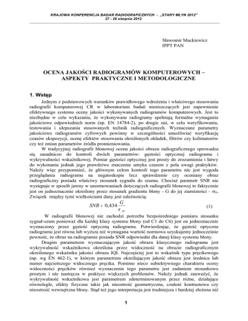 KRAJOWA KONFERENCJA BADAŃ RADIOGRAFICZNYCH - „STARY MŁYN 2012” 27 - 29 sierpnia 2012 Sławomir Mackiewicz IPPT PAN OCENA JAKOŚCI RADIOGRAMÓW KOMPUTEROWYCH – ASPEKTY PRAKTYCZNE I METODOLOGICZNE 1. Wstęp Jednym z podstawowych warunków prawidłowego wdrożenia i właściwego stosowania radiografii komputerowej CR w laboratorium badań nieniszczących jest zapewnienie efektywnego systemu oceny jakości wykonywanych radiogramów komputerowych. Jest to niezbędne w celu wykazania, że wykonywane radiogramy spełniają formalne wymagania jakościowe odpowiednich norm (np. EN 14784-2), po drugie zaś, w celu weryfikowania, testowania i ulepszania stosowanych technik radiograficznych. Wyznaczane parametry jakościowe radiogramów cyfrowych powinny w szczególności umożliwiać weryfikację czasów ekspozycji, ocenę efektów stosowania określonych okładek, filtrów czy kolimatorów czy też zmian parametrów źródła promieniowania. W tradycyjnej radiografii błonowej ocena jakości obrazu radiograficznego sprowadza się zasadniczo do kontroli dwóch parametrów: gęstości optycznej radiogramu i wykrywalności wskaźnikowej. Pomiar gęstości optycznej jest prosty do zrozumienia i łatwy do wykonania jednak jego prawdziwe znaczenie umyka czasem z pola uwagi praktyków. Należy więc przypomnieć, że głównym celem kontroli tego parametru nie jest wygoda przeglądania radiogramu na negatoskopie lecz sprawdzenie czy oceniany obraz radiograficzny posiada właściwy stosunek sygnału do szumu. Chociaż parametr SNR nie występuje w sposób jawny w unormowaniach dotyczących radiografii błonowej to faktycznie jest on jednoznacznie określony przez stosunek gradientu błony - G do jej ziarnistości - σD. Związek między tymi wielkościami dany jest zależnością: SNR = 0,434 G σD (1) W radiografii błonowej nie zachodzi potrzeba bezpośredniego pomiaru stosunku sygnał-szum ponieważ dla każdej klasy systemu błony (od C1 do C6) jest on jednoznacznie wyznaczony przez gęstość optyczną radiogramu. Potwierdzając, że gęstość optyczna radiogramu jest równa lub wyższa niż wymagana wartość normowa uzyskujemy jednocześnie pewność, że obraz na radiogramie posiada SNR odpowiedni dla danej klasy systemu błony. Drugim parametrem wyznaczającym jakość obrazu klasycznego radiogramu jest wykrywalność wskaźnikowa określona przez widoczność na obrazie radiograficznym określonego wskaźnika jakości obrazu IQI. Najczęściej jest to wskaźnik typu pręcikowego (np. wg EN 462-1), w którym parametrem określającym jakość obrazu jest średnica lub numer najcieńszego widocznego pręcika. Pomimo nieco subiektywnego charakteru oceny widoczności pręcików również wyznaczenie tego parametru jest zadaniem stosunkowo prostym i nie nastręcza w praktyce większych problemów. Należy jednak zauważyć, że wykrywalność wskaźnikowa jest parametrem zdeterminowanym przez różne, działające równolegle, efekty fizyczne takie jak nieostrość geometryczna, czułość kontrastowa czy nieostrość wewnętrzna błony. Stąd też jego interpretacja jest trudniejsza i bardziej złożona niż 1 KRAJOWA KONFERENCJA BADAŃ RADIOGRAFICZNYCH - „STARY MŁYN 2012” 27 - 29 sierpnia 2012 gęstości optycznej, która jednoznacznie łączy się ze stosunkiem sygnał-szum i ekspozycją radiogramu. Parametry jakościowe radiogramów komputerowych, które powinny być kontrolowane przez użytkowników zostały określone w normie EN 14784-2. Zostały one zdefiniowane w dużym stopniu w oparciu o zasady sformułowane wcześniej w radiografii błonowej. W szczególności norma EN 14784-2 wymaga sprawdzania jakości obrazu za pomocą wskaźników IQI typu pręcikowego (wg EN 462-1) w taki sam sposób jak ma to miejsce w radiografii błonowej. Parametrem, który ma kontrolować stosunek sygnał-szum radiogramu komputerowego jest minimalna wartość intensywności sygnału PSL czyli minimalna wartość stopnia szarości pikseli na ocenianym radiogramie. Dodatkowo norma EN 14784-2 wprowadza wymóg kontrolowania nieostrości obrazu za pomocą wskaźnika IQI typu podwójny pręcik. W artykule omówiono parametry jakościowe radiogramów komputerowych z perspektywy użytkownika, który ma je prawidłowo wyznaczyć, porównać z wymaganiami i interpretować w kategoriach parametrów stosowanej techniki radiograficznej. Zwrócono uwagę na zjawiska fizyczne i procesy przetwarzania obrazu w systemach CR, które mają decydujący wpływ na wartości tych parametrów. Ograniczono się jedynie do analizy parametrów określających jakość radiogramów produkcyjnych wykonywanych w ramach normalnego użytkowania systemów CR. Parametry funkcjonalne systemów CR wyznaczane w ramach testów klasyfikacyjnych lub nadzoru nad wyposażeniem stanowią osobny temat i nie zostały tutaj uwzględnione. 2. Nieostrość systemu Nieostrość systemu w rozumieniu normy EN 14784 jest miarą możliwości uwidocznienia na radiogramie komputerowym drobnych szczegółów obrazu tworzonego przez promieniowanie na powierzchni systemu detekcyjnego pyty IP. W tym sensie jest to pojęcie bliskie nieostrości wewnętrznej systemu błona-okładki stosowanemu w radiografii konwencjonalnej. Konieczność stosowania takiego parametru w radiografii komputerowej wynika z faktu, że systemy CR oparte na pamięciowych płytach luminoforowych charakteryzują się znacznie większą nieostrością wewnętrzną niż błony radiograficzne. W przypadku tych ostatnich nieostrość wewnętrzna nie jest osobno kontrolowana ponieważ z reguły jest ona mniejsza lub co najwyżej porównywalna z występującą równolegle nieostrością geometryczną. Podstawową przyczyną zwiększonej nieostrości systemów CR jest rozpraszanie wiązki laserowej w warstwie luminoforowej płyty IP podczas jej odczytu w czytniku CR. wiązka laserowa rozmiar ziarna luminofor podłoże Rys. 1. Rozpraszanie wiązki laserowej w warstwie luminoforu płyty IP. 2 K