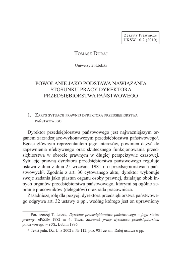 Zeszyty Prawnicze UKSW 10.2 (2010) Tomasz Duraj Uniwersytet Łódzki POWOŁANIE JAKO PODSTAWA NAWIĄZANIA STOSUNKU PRACY DYREKTORA PRZEDSIĘBIORSTWA PAŃSTWOWEGO 1.Zarys sytuacji prawnej dyrektora przedsiębiorstwa państwowego Dyrektor przedsiębiorstwa państwowego jest najważniejszym organem zarządzająco-wykonawczym przedsiębiorstwa państwowego1. Będąc głównym reprezentantem jego interesów, powinien dążyć do zapewnienia efektywnego oraz skutecznego funkcjonowania przedsiębiorstwa w obrocie prawnym w długiej perspektywie czasowej. Sytuację prawną dyrektora przedsiębiorstwa państwowego reguluje ustawa z dnia z dnia 25 września 1981 r. o przedsiębiorstwach państwowych2. Zgodnie z art. 30 cytowanego aktu, dyrektor wykonuje swoje zadania jako piastun organu osoby prawnej, działając obok innych organów przedsiębiorstwa państwowego, którymi są ogólne zebranie pracowników (delegatów) oraz rada pracownicza. Zasadniczą rolę dla pozycji dyrektora przedsiębiorstwa państwowego odgrywa art. 32 ustawy o pp., według którego jest on uprawniony 1 Por. szerzej T. Liszcz, Dyrektor przedsiębiorstwa państwowego – jego status prawny, «PiZS» 1982 nr 4; Tejże, Stosunek pracy dyrektora przedsiębiorstwa państwowego w PRL, Lublin 1986. Tekst jedn. Dz. U. z 2002 r. Nr 112, poz. 981 ze zm. Dalej ustawa o pp. 2 200 Tomasz Duraj [2] do zarządzania przedsiębiorstwem i reprezentowania go na zewnątrz. Działając zgodnie z przepisami prawa, dyrektor podejmuje decyzje samodzielnie i ponosi za nie odpowiedzialność. Dyrektor przedsiębiorstwa państwowego nie jest jednak jedynym organem zarządzającym i reprezentującym przedsiębiorstwo w obrocie prawnym. Ustawa z dnia 25 września 1981 roku o samorządzie załogi przedsiębiorstwa państwowego3 przyznaje bowiem organom samorządowym szereg istotnych kompetencji o charakterze stanowiącym, pozwalających na ich uczestnictwo w procesie zarządzania przedsiębiorstwem państwowym (art. 10 i 24 cytowanej ustawy). Na gruncie prawa przedsiębiorstw państwowych obowiązuje podstawowa zasada tzw. domniemania kompetencji decyzyjnych dyrektora przedsiębiorstwa4. Oznacza ona, iż dyrektor może podejmować wiążące rozstrzygnięcia we wszystkich sprawach dotyczących przedsiębiorstwa państwowego, które nie zostały w sposób wyraźny zastrzeżone konkretnym przepisem prawa do właściwości stanowiących organów samorządu załogi czy też organu założycielskiego. W tym właśnie zakresie dyrektor, zgodnie z brzmieniem art. 32 ust. 2 ustawy o pp., podejmuje decyzje samodzielnie ponosząc za nie odpowiedzialność. W sytuacji zaistnienia wątpliwości, co do tego czy podmiotem właściwym do rozstrzygnięcia danej sprawy jest organ samorządu załogi, czy też dyrektor przedsiębiorstwa państwowego, przyjmuje się domniemanie kompetencji dyrektora, albowiem jego uprawnienia w zakresie zarządzania przedsiębiorstwem – w przeciwieństwie do kompetencji organów samorządowych – nie zostały określone wyczerpująco, lecz opierają się na generalnej formule, wynikającej z art. 32 ustawy o pp.5. Dz. U. Nr 24, poz. 123 ze. zm. Dalej ustawa o szpp. 3 Por. np. A. Kidyba, Dyrektor jako organ przedsiębiorstwa państwowego, Warszawa 1993, s. 158-160; A. Walaszek-Pyzioł, Organy przedsiębiorstwa państwowego a zasada jednoosobowego kierownictwa, «Krakowskie Studia Prawnicze» 1985, s. 62; G. Bieniek, Przedsiębiorstwa państwowe – przepisy i komentarz, Warszawa 1997, s. 112-113. 4 Por. np. G. Bieniek, Przedsiębiorstwa państwowe, cit., s. 112; Z. Kubot, Odpowiedzialność dyrektora przedsiębiorstwa państwowego, Wrocław 1995, s. 38; 5 [3] Powołanie jako podstawa nawiązania stosunku pracy 201 W literaturze przedmiotu przyjmuje się, iż sposób wyznaczania kompetencji dyrektora pozwala uznać, że w przedsiębiorstwach państwowych nadal znajduje zastosowanie zmodyfikowana zasada jednoosobowego kierownictwa6. O utrzymaniu tej zasady świadczą liczne przepisy przyznające dyrektorowi przedsiębiorstwa samodzielną i względnie niezależną pozycję zarówno wobec organów samorządu załogi, jak i organu założycielskiego. Jej gwarancją w stosunku do ogólnego zebrania i rady pracowniczej są przysługujące dyrektorowi przedsiębiorstwa państwowego kompetencje w zakresie wstrzymania wykonania niezgodnych z przepisami prawa uchwał organów samorządu załogi (art. 41 ustawy o szpp.) oraz zaskarżenia uchwał rady pracowniczej, które istotnie naruszają interes ogólnospołeczny (art. 44 ust. 2 ustawy o szpp.). Ponadto samodzielna pozycja dyrektora przedsiębiorstwa państwowego została również zaakcentowana w przepisach regulujących tryb rozstrzygania sporów między nim a radą pracowniczą, które w ostatecznym rozrachunku mogą trafić na drogę sądową. Z kolei gwarancją niezależności dyrektora przedsiębiorstwa państwowego wobec organu założycielskiego jest przyjęta w art. 58 ust. 2 ustawy o pp. zasada ograniczająca prawo władczego wkraczania tego organu w sprawy przedsiębiorstwa jedynie do sytuacji wyraźnie przewidzianych przepisami rangi ustawowej. Zgodnie zaś z art. 63 ust. 1 cytowanej ustawy, dyrektorowi przyznano prawo wniesienia sprzeciwu w stosunku do decyzji podjętych wobec przedsiębiorstwa przez organ założycielski, który ostatecznie może być rozstrzygany w postępowaniu sądowym. Wyrazem zasady jednoosobowego kierownictwa jest zagwarantowanie dyrektorowi przedsiębiorstwa państwowego szerokich uprawnień do samodzielnego wydawania decyzji, zwłaszcza w zakresie B. Ziemianin, Aktualne problemy współdziałania dyrektora z organami samorządu załogi, [w:] Status prawny dyrektora przedsiębiorstwa państwowego – Materiały na konferencję naukową, Poznań 1988, s. 42. 6 Zob np. Z. Kubot, op. cit., s. 38-39; A. Kidyba, W kwestii obowiązywania zasady jednoosobowego kierownictwa przedsiębiorstwem państwowym, «Organizacja-MetodyTechnika» 1986 nr 6, s. 9-10; W. Hoff, 