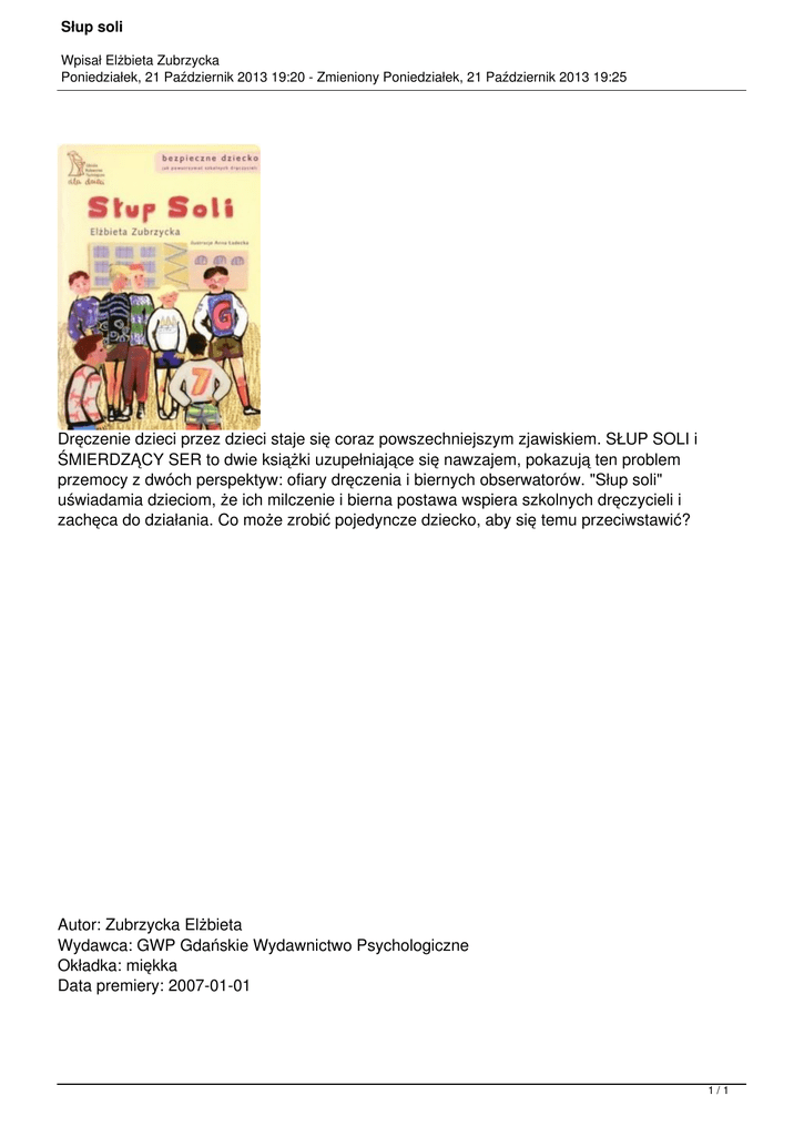 Słup soli Wpisał Elżbieta Zubrzycka Poniedziałek, 21 Październik 2013 19:20 - Zmieniony Poniedziałek, 21 Październik 2013 19:25 Dręczenie dzieci przez dzieci staje się coraz powszechniejszym zjawiskiem. SŁUP SOLI i ŚMIERDZĄCY SER to dwie książki uzupełniające się nawzajem, pokazują ten problem przemocy z dwóch perspektyw: ofiary dręczenia i biernych obserwatorów. "Słup soli" uświadamia dzieciom, że ich milczenie i bierna postawa wspiera szkolnych dręczycieli i zachęca do działania. Co może zrobić pojedyncze dziecko, aby się temu przeciwstawić? Autor: Zubrzycka Elżbieta Wydawca: GWP Gdańskie Wydawnictwo Psychologiczne Okładka: miękka Data premiery: 2007-01-01 1/1