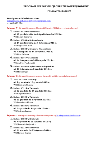 PROGRAM PEREGRYNACJI OBRAZU ŚWIETEJ RODZINY POLSKA POŁUDNIOWA Koordynator: Włodzimierz Stec [email protected] tel. 608 650 676 Rejon nr 7 - Delegat Rejonowy: Marian Wójtowicz ([email protected]) 1. Rada nr 15268 w Rzeszowie od 17 października do 24 października 2015 r.; WR Lucjan Kosturek 2. Rada nr 15588 w Dobrzechowie od 24 października do 7 listopada 2015 r.; WR Bogusław Kucab 3. Rada nr 16038 w Głogowie Małopolskim od 7 listopada do 14 listopada 2015 r.; WR Piotr Golema 4. Rada nr 15767 w Łańcucie od 14 listopada do 28 listopada 2015 r.; WR Andrzej Piechowski 5. Rada nr 15561 w Sędziszowie Małopolskim od 28 listopada do 5 grudnia 2015 r.; WR Marek Pająk Rejon nr 8 - Delegat Rejonowy: Antoni Kamiński ([email protected]) 1. Rada nr 15726 w Dębicy od 5 grudnia do 12 grudnia 2015 r.; WR Stanisław Chmura 2. Rada nr 15915 w Tarnowie od 12 grudnia do 19 grudnia 2015 r.; WR Krzysztof Pikul 3. Rada nr 16100 w Tarnowie od 19 grudnia do 2 stycznia 2016 r.; WR Franciszek Florek 4. Rada nr 16181 w Tarnowie od 2 stycznia do 9 stycznia 2016 r.; WR Tadeusz Rzońca Rejon nr 1 - Delegat Rejonowy: Sławomir Wójtowicz ([email protected]) 1. Rada nr 14000 w Krakowie od 9 stycznia do 16 stycznia 2016 r.; WR Sławomir Wójtowicz 2. Rada nr 15128 w Krakowie od 16 stycznia do 23 stycznia 2016 r.; WR Mariusz Doniec 3. Rada nr 14001 w Ludźmierzu od 23 stycznia do 30 stycznia 2016 r.; WR Paweł Put Rejon nr 20 - Delegat Rejonowy: Sławomir Korczyński ([email protected]) 1. Rada nr 15114 w Olkuszu od 30 stycznia do 6 lutego 2016 r.; WR Jerzy Zembura 2. Rada nr 15111 w Sławkowie od 6 lutego do 13 lutego 2016 r.; WR Maksym Pięta 3. Rada nr 15114 w Dąbrowie Górniczej od 13 lutego do 20 lutego 2016 r.; WR Marek Będkowski 4. Rada nr 15249 w Sosnowcu od 20 lutego do 27 lutego 2016 r.; WR Piotr Kiełtyka 5. Rada nr 15523 w Czeladzi: od 27 lutego do 5 marca 2016 r.; WR Janusz Glinka Rejon nr 5 - Delegat Rejonowy: Roman Wycisk ([email protected]) 1. Rada nr 14983 w Tychach: od 5 marca do 12 marca 2016 r.; WR Tomasz Kostyra 2. Rada nr 14428 w Bielsku-Białej: od 12 marca do 19 marca 2016 r.; WR Kazimierz Nowakowski 3. Rada nr 15500 w Wodzisławiu Śląskim od 19 marca do 2 kwietnia 2016 r.; WR Tadeusz Tyc Rejon nr 17 - Delegat Rejonowy: Andrzej Stefaniuk ([email protected]) 1. Rada nr 15160 w Rudzie Śląskiej: od 2 kwietnia do 9 kwietnia 2016 r.; WR Michał Tworuszka 2. Rada nr 15649 w Rudzie Śląskiej: od 9 kwietnia do 16 kwietnia 2016 r.; WR Marian Duda Rejon nr 12 - Delegat Rejonowy: Dariusz Wolniak ([email protected]) 1. Rada nr 15416 w Chmielniku od 16 kwietnia do 23 kwietnia 2016 r.; WR Stanisław Ściana 2. Rada nr 16266 w Rembieszycach od 23 kwietnia do 30 kwietnia 2016 r.; WR Robert Wolski 3. Rada nr 16128 w Domaszewicach od 30 kwietnia do 7 maja 2016 r.; WR Antoni Kamiński 4. Rada nr 16263 w Łosieniu od 7 czerwca do 14 maja 2016 r.; WR Dariusz Czarnecki 5. Rada nr 16101 we Włoszczowej od 14 maja do 21 maja 2016 r.; WR Hubert Kania Rejon nr 13 - Delegat Rejonowy: Stanisław Dziwiński ([email protected]) 1. Rada nr 14955 w Częstochowie od 21 maja do 4 czerwca 2016 r.; WR Andrzej Bera 2. Rada nr 15672 w Częstochowie od 4 czerwca do 11 czerwca 2016 r.; WR Andrzej Krzyżanowski 3. Rada nr 16300 w Częstochowie od 11 czerwca do 18 czerwca 2016 r.; WR Krzysztof Sztanderski 4. Rada nr 16031 w Działoszynie od 18 czerwca do 25 czerwca 2016 r.; WR Stanisław Godszling Rejon nr 21 - Delegat Rejonowy: Marcin Piętak ([email protected]) 1. Rada nr 16165 w Ostojowie od 25 czerwca do 2 lipca 2016 r.; WR Paweł Zaczek 2. Rada nr 15281 w Skarżysku - Kościelnym od 2 lipca do 9 lipca 2016 r.; WR Zbigniew Ścisłowicz 3. Rada nr 14577 w Skarżysku - Kamiennej od 9 lipca do 16 lipca 2016 r.; WR Krzysztof Randla 4. Rada nr 14023 w Starachowicach od 16 lipca do 6 sierpnia 2016 r.; WR Ryszard Nosowicz Rejon nr 3 - Delegat Rejonowy: Leszek Kucharski ([email protected]) 1. Rada nr 15299 w Suchedniowie od 6 sierpnia do 13 sierpnia 2016 r.; WR Tadeusz Barański 2. Rada nr 15015 w Starachowicach od 13 sierpnia do 20 sierpnia 2016 r.; WR Włodzimierz Majchrzyk 3. Rada nr 15894 w Starachowicach od 20 sierpnia do 27 sierpnia 2016 r.; WR Mariusz Zaborski Rejon nr 4 - Delegat Rejonowy: Rafał Tracz([email protected]) 1. Rada nr 15142 w Ostrowcu Świętokrzyskim od 27 sierpnia do 3 września 2016 r.; WR Piotr Taras 2. Rada nr 15460 w Ożarowie od 3 września do 10 września 2016 r.; WR Piotr Mazur 3. Rada nr 15239 w Tarnobrzegu od 10 września do 24 września 2016 r.; WR Rafał Szczypta 4. Rada nr 15759 w Stalowej Woli od 24 września do 1 października 2016 r.; WR Henryk Drzymała Rejon nr 16 - Delegat Rejonowy: Marcin Wojciechowski ([email protected]) 1. Rada nr 15267 w Tomaszowie Lubelskim od 1 października do 8 października 2016 r.; WR Marek Kiełbasa 2. Rada nr 15440 w Zamościu od 8 października do 15 października 2016 r.; WR Kazimierz Skiba 3. Rada nr 14332 w Lublinie od 15 października do 22 października 2016 r.; WR Krzysztof Maciejewski Rejon nr 2 - Delegat Rejonowy: Jan Malik ([email protected]) 1. Rada nr 15420 w Kozienicach od 22 października do 29 października 2016 r.; WR Jarosław Pawelec 2. Rada nr 15631 w Pionkach od 29 października do 5 listopada 2016 r.; WR Jacek Bartosiewicz 3. Rada nr 15814 w Radomiu od 5 listopada do 12 listopada 2016 r.; WR Paweł Gajda 4. Rada nr 15216 w Radomiu od 12 listopada do 19 listopada 2016 r.; WR Paweł Trojanowski 5. Rada nr 14004 w Radomiu od 19 listopada do 26 listopada 2016 r.; WR Marek Podlewski Rejon nr 11 - Delegat Rejonowy: Robert Sędkowski ([email protected]) 1. Rada nr 15650 w Węgrzynie od 26 listopada do 3 grudnia 2016 r.; WR Stefan Stanisławski 2. Rada nr 15195 w Opocznie od 3 grudnia do 10 grudnia 2016 r.; WR Grzegorz Więckowski 3. Rada nr 15391 w Końskich od 10 grudnia do 17 grudnia 2016 r.; WR Robert Frączyk