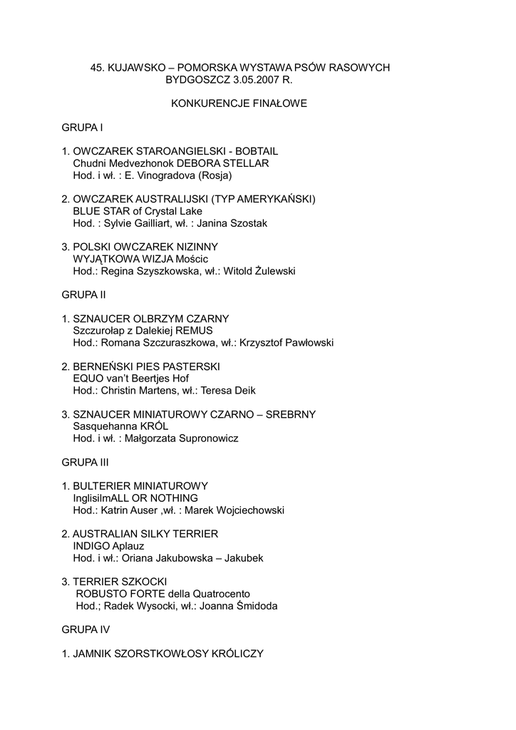 45. KUJAWSKO – POMORSKA WYSTAWA PSÓW RASOWYCH BYDGOSZCZ 3.05.2007 R. KONKURENCJE FINAŁOWE GRUPA I 1. OWCZAREK STAROANGIELSKI - BOBTAIL Chudni Medvezhonok DEBORA STELLAR Hod. i wł. : E. Vinogradova (Rosja) 2. OWCZAREK AUSTRALIJSKI (TYP AMERYKAŃSKI) BLUE STAR of Crystal Lake Hod. : Sylvie Gailliart, wł. : Janina Szostak 3. POLSKI OWCZAREK NIZINNY WYJĄTKOWA WIZJA Mościc Hod.: Regina Szyszkowska, wł.: Witold Żulewski GRUPA II 1. SZNAUCER OLBRZYM CZARNY Szczurołap z Dalekiej REMUS Hod.: Romana Szczuraszkowa, wł.: Krzysztof Pawłowski 2. BERNEŃSKI PIES PASTERSKI EQUO van’t Beertjes Hof Hod.: Christin Martens, wł.: Teresa Deik 3. SZNAUCER MINIATUROWY CZARNO – SREBRNY Sasquehanna KRÓL Hod. i wł. : Małgorzata Supronowicz GRUPA III 1. BULTERIER MINIATUROWY InglisilmALL OR NOTHING Hod.: Katrin Auser ,wł. : Marek Wojciechowski 2. AUSTRALIAN SILKY TERRIER INDIGO Aplauz Hod. i wł.: Oriana Jakubowska – Jakubek 3. TERRIER SZKOCKI ROBUSTO FORTE della Quatrocento Hod.; Radek Wysocki, wł.: Joanna Śmidoda GRUPA IV 1. JAMNIK SZORSTKOWŁOSY KRÓLICZY Magic Raibow PRIVELEGE Hod. i wł. : V.V. Ivanovy (Rosja) 2. JAMNIK SZORSTKOWŁOSY STANDARDOWY ex Sentia BRAZOS SKI ALMOND YOY hod.: Ina Małecka, wł.: Magdalena Kubicka 3. JAMNIK DŁUGOWŁOSY MINIATUROWY DANTE A. Światołdycz Hod.: Małgorzata Mysiara, wł.: Cezary Balbuza GRUPA V 1. SIBERIAN HUSKY Winterfrost’s PEGASO Hod.: Gaspar A., Vidal D., wł.: Ewa Górska 2. SZPIC MINIATUROWY (POMERANIAN) GROOVY LITTLE AMORIST von Palatina Aurora Hod. G. Nehrbass, wł.: Wioletta Koślicka – Depta 3. ALASKAN MALAMUTE SKYWALKER Sausimayok Hod. : J. Wisniewska, wł.: E. Girina, E. Chybotarieva (Rosja) GRUPA VI 1. BASSET HOUND Swede Sun’s HAROLD Hod.: Paula Sunebring (Szwecja), wł.: Tomasz Mroczek, Monika Cyperling 2. POSOKOWIEC BAWARSKI FIGO Koguci Pazur Hod.: Monika Kotowska, wł.: Monika i Radosław Kotowscy 3. DALMATYŃCZYK HAILY vom Magdeburger Domfelsen Hod.: Ilona Paul, wł.: Marion Sieger (Niemcy) GRUPA VII 1. WYŻEŁ WEIMARSKI KRÓTKOWŁOSY Ashlaren CAIPIROSKA Hod.: L. Knox, wł.: L. Knox , P. Wałkowska 2. WYŻEŁ NIEMIECKI KRÓTKOWŁOSY PERLA z Czarnego Dworu Hod. i wł.: Wojciech Burski 3. SETER ANGIELSKI CHUCK znad Cienistej Strugi Hod.: Halina Bociek, wł.: Anna Szlawska, Ewa Ławniczak GRUPA VIII 1. GOLDEN RETRIEVER ARNY z Krasinskych Strani Hod.: J. Roleckova, wł.: Ewa Szeligowska 2. COCKER SPANIEL AMERYKAŃSKI Marvellous MAJOR Hod.: Marja Valkeeniemi, wł.: Jaana Lepikkomaki (Finlandia) 3. SPRINGER SPANIEL ANGIELSKI Rowntree SWEET HARMONY Hod.: Ula Larsson, wł.: Iwona Staniszewska – Noga GRUPA IX 1. PUDEL MINIATUROWY Kudos LEXUS Hod.: Lindeman R., Nilsson M., wł.: Anna Reglińska 2. CHIŃSKI GRZYWACZ GINGERY SASQUEHANNA GOBLIN Hod. : Bisonette R., Butterklee A., M. Supronowicz, wł.: Małgorzata Supronowicz 3. CIHUAHUA KRÓTKOWŁOSY BAYARD TRUE BELIVER Hod.: Saenz K.M., Lanasa E., wł. Małgorzata Supronowicz GRUPA X 1. WHIPPET Frifart’s GAUTE Hod.: Monika Eggan, wł.: Ingrid, Kjell Olav Eggan (Norwegia) 2. CHART ROSYJSKI BORZOJ ALVARO Leśna Gala Hod. i wł.: Agnieszka Pająk 3. GREYHOUND Snatche’s ICE Hod. i wł.: Berit Peterson ( Szwecja) NAJPIĘKNIEJSZE SZCZENIĘ WYSTAWY 1. SIBERIAN HUSKY ADVENTURER Eskimoski Domek Hod. i wł.: Teresa Radomska 2. WYŻEŁ WEIMARSKI KRÓTKOWŁOSY PRYNA A-Awa Hod. : Andrzej Walczak, wł.: Katarzyna Ostrowska – Clark 3. AIREDALE TERRIER VANILLA Poezja Ruchu Hod.: Eliza Tomczak, wł.: Marta Bischoff NAJPIĘKNIEJSZY JUNIOR WYSTAWY 1. WYŻEŁ WEIMARSKI KRÓTKOWŁOSY IVETTE Imperium Star Hod.: Paulina Wałkowska, wł.: Paulina Wałkowska, Patrycja Rucińska 2. FOKSTERRIER KRÓTKOWŁOSY Starring BRIGGS Hod. Juha Palosaari, wł.: Małgorzata Supronowicz 3. JAMNIK SZORSTKOWŁOSY STANDARDOWY ex Sentia BRAZOS SKI ALMOND YOY hod.: Ina Małecka, wł.: Magdalena Kubicka NAJPIĘKNIEJSZY WETERAN WYSTAWY 1. BEARDED COLLIE ORSAY DE CHESTER (ur. 15.05.1998) Hod.: J.P. Bernardi, wł.: Ryszard Korpys 2. SIBERIAN HUSKY MY SWEET LORD of Baker Lake (ur. 18.07.1996) Hod.: Barba Lopez, wł.: Urszula Ryszewska 3. OWCZAREK SZETLANDZKI GOLDEN GIRL Vesca Montana (ur. 12.12.1996) Hod. i wł.: Anna Szulc NAJPIĘKNIEJSZY PIES RAS POLSKICH 1. GOŃCZY POLSKI PASJA z Doliny Łagiewniczanki Hod.: Sławomir Galant, wł.: Elżbieta Fer 2. CHART POLSKI LUK Full Speed Hod.: Damian Kuraś, wł.: Jan Sitarski 3. POLSKI OWCZAREK NIZINNY WYJĄTKOWA WIZJA Mościc Hod.: Regina Szyszkowska, wł.: Witold Żulewski LAUREATEM MEMORIAŁU im. MARII DUBROWINOWEJ ZOSTAŁ POLSKI OWCZAREK NIZINNY – WYJĄTKOWA WIZJA Mościc NAJPIĘKNIEJSZY PIES UŻYTKOWY 1. CHART AFGAŃSKI CO BĘDZIE TO BĘDZIE Zikkurat Hod.: Ewa Antczak, wł.: Marta Pacanowska 2. SZNAUCER OLBRZYM CZARNY Szczurołap z Dalekiej REMUS Hod.: Romana Szczuraszkowa, wł.: Krzysztof Pawłowski 3. BORDER COLLIE Oodnadatte TRUE DEAL Hod.: B.R. Hayes, wł.: Ewa Łukasik NAJPIĘKNIEJSZY PIES UŻYTKOWY RAS MYŚLIWSKICH 1. WYŻEŁ NIEMIECKI KRÓTKOWŁOSY LORA II z Czarnego Dworu Hod. i wł.: Wojciech Burski 2. BASSET HOUND Swede Sun’s LENA HOD.: Paula Sunebring (Szwecja), wł.: Tomasz Mroczek, Monika Cyperling 3. POSOKOWIEC BAWARSKI FIGO Koguci Pazur Hod.: Monika Kotowska, wł.: Monika i Radosław Kotowscy KONKURS „ MŁODY PREZENTER” Zwycięzca Grupy Młodszej Aleksandra Szydłowska z chartem rosyjskim borzojem VICTORY BLACK MAGIC Zwycięzca Grupy Starszej Agnieszka Dufrat z seterem irlandzkim HAWANA Rude Ziółko Zwycięzca Dnia: ALEKSANDRA SZYDŁOWSKA I CHART ROSYJSKI BORZOJ – VICTORY BLACK MAGIC NAJPIĘKNIEJSZY PIES 45. KUJAWSKO – POMORSKIEJ WYSTAWY PSÓW RASOWYCH BYDGOSZCZ 2007 – BEST IN SHOW 1. WYŻEŁ WEIMARSKI KRÓTKOWŁOSY Ashlaren CAIPIROSKA Hod.: L. Knox, wł.: L. Knox, Paulina Wałkowska 2. SIBERIAN HUSKY Winterfrost’s PEGASO Hod.: Gaspar A., Vidal D. , wł.: Ewa Górska 3. BASSET HOUND Swede Sun’s HAROLD Hod.: Paula Sunebring, wł.: Tomasz Mroczek, Monika Cyperling