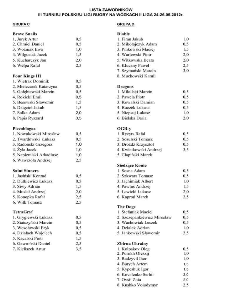 LISTA ZAWODNIKÓW III TURNIEJ POLSKIEJ LIGI RUGBY NA WÓZKACH II LIGA 24-26.05.2012r. GRUPA C GRUPA D Brave Snails 1. Jurek Artur 2. Chmiel Daniel 3. Woźniak Ewa 4. Wilgusiak Jacek 5. Kucharczyk Jan 6. Wełpa Rafał Diabły 1. Firan Jakub 2. Mikołajczyk Adam 3. Pinkowski Maciej 4. Warlewski Piotr 5. Witkowska Beata 6. Kluczny Paweł 7. Szymański Marcin 8. Muchowski Kamil Four Kings III 1. Wietrak Dominik 2. Mielczarek Katarzyna 3. Gołębiewski Marcin 4. Rokicki Emil 5. Besowski Sławomir 6. Dzięcioł Jakub 7. Solka Adam 8. Papis Ryszard Piecobiogaz 1. Nowakowski Mirosław 2. Twardowski Łukasz 3. Radoński Grzegorz 4. Żyła Jacek 5. Napieralski Arkadiusz 6. Wawrzoła Andrzej Saint Sinners 1. Jasiński Konrad 2. Dutkiewicz Łukasz 3. Siwy Adrian 4. Musiał Andrzej 5. Konopka Rafał 6. Wilk Tomasz TetraGryf 1. Gryglewski Łukasz 2. Siatczyński Marcin 3. Wesołowski Eryk 4. Działach Wojciech 5. Kacalski Piotr 6. Gawroński Daniel 7. Kieliszek Artur 0,5 0,5 1,0 1,5 2,0 2,5 0,5 0,5 0,5 0,5 1,5 1,5 2,0 3,5 0,5 0,5 1,0 1,0 1,0 Dragons 1. Mikulski Marcin 2. Pawela Piotr 3. Kowalski Damian 4. Buczek Łukasz 5. Niepsuj Łukasz 6. Bielska Daria OGR-y 1. Rycyrs Rafał 2. Sosulski Tomasz 3. Drożdż Krzysztof 4. Kwiatkowski Andrzej 5. Cłapiński Marek 1,0 0,5 1,5 2,0 2,0 2,5 3,0 0,5 0,5 0,5 0,5 1,0 2,0 0,5 0,5 0,5 3,5 2,5 0,5 0,5 1,5 2,0 2,5 2,5 0,5 0,5 0,5 0,5 1,5 2,5 3,5 Siedzące Konie 1. Sosna Adam 2. Szkwara Tomasz 3. Jachimiak Albert 4. Pawluś Andrzej 5. Lewicki Łukasz 6. Kaproń Marek 0,5 0,5 1,0 1,5 2,0 2,5 The Dogs 1. Stefaniak Maciej 2. Szczepankiewicz Mirosław 3. Wachowiak Leszek 4. Działek Adrian 5. Jankowski Sławomir 0,5 0,5 0,5 1,0 2,5 Zbirna Ukrainy 1. Kolpakov Oleg 2. Porokh Oleksij 3. Radzyvil Ihor 4. Burych Artem 5. Kypeshuk Igor 6. Kovalenko Serhii 7. Ovsii Zoia 8. Kushko Volodymyr 0,5 1,0 1,0 1,5 1,5 2,0 2,0 2,5