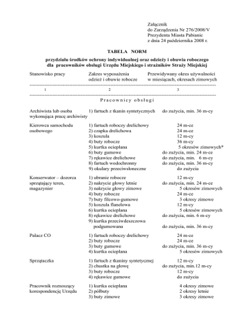 Załącznik do Zarządzenia Nr 276/2008/V Prezydenta Miasta Pabianic z dnia 24 października 2008 r. TABELA NORM przydziału środków ochrony indywidualnej oraz odzieży i obuwia roboczego dla pracowników obsługi Urzędu Miejskiego i strażników Straży Miejskiej Stanowisko pracy Zakres wyposażenia Przewidywany okres używalności odzież i obuwie robocze w miesiącach, okresach zimowych ----------------------------------------------------------------------------------------------------------------1 2 3 ----------------------------------------------------------------------------------------------------------------Pracownicy obsługi Archiwista lub osoba 1) fartuch z tkanin syntetycznych wykonująca pracę archiwisty do zużycia, min. 36 m-cy Kierowca samochodu osobowego 1) fartuch roboczy drelichowy 2) czapka drelichowa 3) koszula 4) buty robocze 5) kurtka ocieplana 6) buty gumowe 7) rękawice drelichowe 8) fartuch wodochronny 9) okulary przeciwsłoneczne 24 m-ce 24 m-ce 12 m-cy 36 m-cy 5 okresów zimowych* do zużycia, min. 24 m-ce do zużycia, min. 6 m-cy do zużycia, min. 36 m-cy do zużycia Konserwator – dozorca sprzątający teren, magazynier 1) ubranie robocze 2) nakrycie głowy letnie 3) nakrycie głowy zimowe 4) buty robocze 7) buty filcowo-gumowe 5) koszula flanelowa 6) kurtka ocieplana 8) rękawice drelichowe 9) kurtka przeciwdeszczowa podgumowana 12 m-cy do zużycia, min. 24 m-ce 5 okresów zimowych 24 m-ce 3 okresy zimowe 12 m-cy 5 okresów zimowych do zużycia, min. 6 m-cy Palacz CO 1) fartuch roboczy drelichowy 2) buty robocze 3) buty gumowe 4) kurtka ocieplana 24 m-ce 24 m-ce do zużycia, min. 36 m-cy 5 okresów zimowych Sprzątaczka 1) fartuch z tkaniny syntetycznej 2) chustka na głowę 3) buty robocze 4) rękawice gumowe 12 m-cy do zużycia, min.12 m-cy 12 m-cy do zużycia Pracownik roznoszący korespondencję Urzędu 1) kurtka ocieplana 2) półbuty 3) buty zimowe do zużycia, min. 36 m-cy 4 okresy zimowe 2 okresy letnie 3 okresy zimowe ----------------------------------------------------------------------------------------------------------------Strażnicy Straży Miejskiej Umundurowanie podstawowe 1) wiatrówka (kurtka letnia) 2) spodnie letnie 3) spodnie zimowe 4) koszula błękitna (długi rękaw) - 2 szt. 5) koszula błękitna (krótki rękaw) - 2 szt. 6) sweter (półgolf) 7) czapka służbowa 8) czapka służbowa zimowa 9) czapka służbowa letnia 10) kurtka 3/4 z podpinką 11) kurtka uniwersalna krótka z podpinką 12) spódnica letnia 13) spódnica zimowa 4 okresy letnie 2 okresy letnie 2 okresy zimowe 24 m-ce 24 m-ce 3 okresy zimowe 5 lat 5 okresów zimowych 3 okresy letnie 5 okresów zimowych 5 okresów zimowych 3 okresy letnie 3 okresy zimowe Umundurowanie uzupełniające 1) dystynkcje - 3 kpl. 2) ocieplacz (bezrękawnik) 3) krawat 4) spinka do krawata 5) pas główny (z osprzętem) 6) pasek do spodni 7) pas parciany 8) kamizelka taktyczna 9) kamizelka ostrzegawcza 10) ubiór specjalny 3-częściowy (spodnie, koszulka „polo”, bluza) 11) skarpety letnie - 4 pary 12) skarpety zimowe - 4 pary 13) rajstopy (damskie) - 4 szt. 14) obuwie letnie - 1 para 15) obuwie zimowe - 1 para 16) obuwie zimowe damskie (kozaki) 17) obuwie letnie damskie (półbuty) 18) obuwie całoroczne 19) rękawiczki 20) szalik do zużycia 5 lat 36 m-cy do zużycia do zużycia do zużycia do zużycia do zużycia do zużycia 3 lata 1 okres letni 1 okres zimowy 6 m-cy 2 okresy letnie 2 okresy zimowe 3 okresy zimowe 3 okresy zimowe 36 m-cy 2 okresy zimowe 3 okresy zimowe Umundurowanie specjalne 1) spodnie krótkie - 2 szt. 2 okresy letnie dla patrolu rowerowego 2) koszulka typu polo - 2 szt. 2 okresy letnie U mundurowanie wyjśc iowe S tra ży Miejsk iej (wyłącznie dla komendanta, zastępcy komendanta oraz pododdziału reprezentacyjnego) 1) marynarka gabardynowa 2) koszula biała z długim rękawem 3) koszula biała z krótkim rękawem 4) spodnie gabardynowe 5) sznur galowy do zużycia do zużycia do zużycia do zużycia do zużycia *) okres letni obejmuje okres od 1 kwietnia do 31 października, pozostały okres jest okresem zimowym.