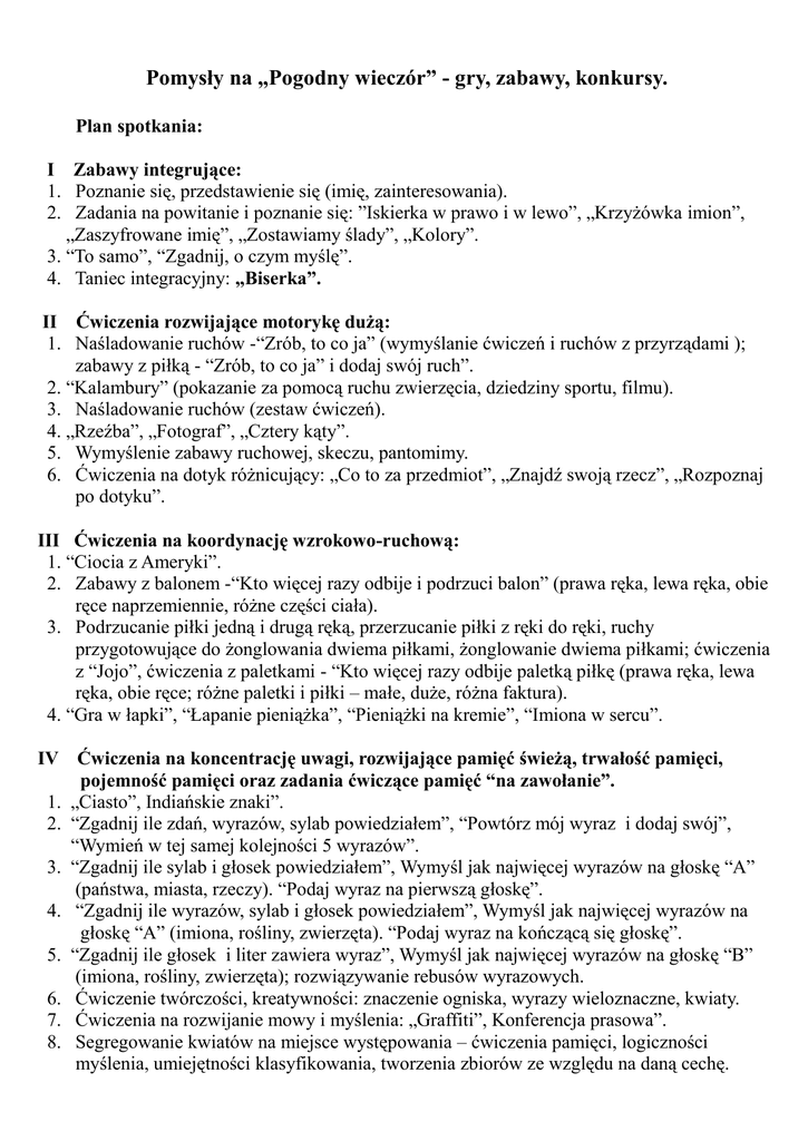 Pomysły na „Pogodny wieczór” - gry, zabawy, konkursy. Plan spotkania: I Zabawy integrujące: 1. Poznanie się, przedstawienie się (imię, zainteresowania). 2. Zadania na powitanie i poznanie się: ”Iskierka w prawo i w lewo”, „Krzyżówka imion”, „Zaszyfrowane imię”, „Zostawiamy ślady”, „Kolory”. 3. “To samo”, “Zgadnij, o czym myślę”. 4. Taniec integracyjny: „Biserka”. II Ćwiczenia rozwijające motorykę dużą: 1. Naśladowanie ruchów -“Zrób, to co ja” (wymyślanie ćwiczeń i ruchów z przyrządami ); zabawy z piłką - “Zrób, to co ja” i dodaj swój ruch”. 2. “Kalambury” (pokazanie za pomocą ruchu zwierzęcia, dziedziny sportu, filmu). 3. Naśladowanie ruchów (zestaw ćwiczeń). 4. „Rzeźba”, „Fotograf”, „Cztery kąty”. 5. Wymyślenie zabawy ruchowej, skeczu, pantomimy. 6. Ćwiczenia na dotyk różnicujący: „Co to za przedmiot”, „Znajdź swoją rzecz”, „Rozpoznaj po dotyku”. III Ćwiczenia na koordynację wzrokowo-ruchową: 1. “Ciocia z Ameryki”. 2. Zabawy z balonem -“Kto więcej razy odbije i podrzuci balon” (prawa ręka, lewa ręka, obie ręce naprzemiennie, różne części ciała). 3. Podrzucanie piłki jedną i drugą ręką, przerzucanie piłki z ręki do ręki, ruchy przygotowujące do żonglowania dwiema piłkami, żonglowanie dwiema piłkami; ćwiczenia z “Jojo”, ćwiczenia z paletkami - “Kto więcej razy odbije paletką piłkę (prawa ręka, lewa ręka, obie ręce; różne paletki i piłki – małe, duże, różna faktura). 4. “Gra w łapki”, “Łapanie pieniążka”, “Pieniążki na kremie”, “Imiona w sercu”. IV Ćwiczenia na koncentrację uwagi, rozwijające pamięć świeżą, trwałość pamięci, pojemność pamięci oraz zadania ćwiczące pamięć “na zawołanie”. 1. „Ciasto”, Indiańskie znaki”. 2. “Zgadnij ile zdań, wyrazów, sylab powiedziałem”, “Powtórz mój wyraz i dodaj swój”, “Wymień w tej samej kolejności 5 wyrazów”. 3. “Zgadnij ile sylab i głosek powiedziałem”, Wymyśl jak najwięcej wyrazów na głoskę “A” (państwa, miasta, rzeczy). “Podaj wyraz na pierwszą głoskę”. 4. “Zgadnij ile wyrazów, sylab i głosek powiedziałem”, Wymyśl jak najwięcej wyrazów na głoskę “A” (imiona, rośliny, zwierzęta). “Podaj wyraz na kończącą się głoskę”. 5. “Zgadnij ile głosek i liter zawiera wyraz”, Wymyśl jak najwięcej wyrazów na głoskę “B” (imiona, rośliny, zwierzęta); rozwiązywanie rebusów wyrazowych. 6. Ćwiczenie twórczości, kreatywności: znaczenie ogniska, wyrazy wieloznaczne, kwiaty. 7. Ćwiczenia na rozwijanie mowy i myślenia: „Graffiti”, Konferencja prasowa”. 8. Segregowanie kwiatów na miejsce występowania – ćwiczenia pamięci, logiczności myślenia, umiejętności klasyfikowania, tworzenia zbiorów ze względu na daną cechę. 9. Zwierzęta –wymień najwięcej nazw z pamięci. 10. Segregowanie zwierząt na miejsce występowania – ćwiczenia pamięci, logiczności myślenia, umiejętności klasyfikowania, tworzenia zbiorów ze względu na daną cechę. 11. Ułóż kilka zdań, historyjkę, opowiadanie z poznanymi nazwami roślin, zwierząt). 12. Własna opowieść, rymowanka, wiersz, piosenka. 13. Ćwiczenia na czytanie ze zrozumieniem – samodzielne ciche czytanie tekstu i wykonanie poleceń (pytania, zagadki, rebusy, krzyżówki). 14. Suwaki terapeutyczne - „Winda” (wymyślanie wyrazów dwusylabowych, trzysylabowych zaczynających się lub kończących się na podaną sylabę). V Arteterapia. 1. Samodzielne wykonanie pracy plastycznej. 2. Wymyślanie historyjek, opowiadań na temat wykonanych prac. VI Relaksacja. 1. Taniec medytacyjny: „Shimirili”. 2. Opowieści relaksacyjne: „Podwodna podróż”, Żaglówka”, „Wiosenny spacer”, „Kwiat jednej nocy”, „Domek w lesie”, „Ptak”, „Lot ptaków”, „Latawiec”, „Muzyka i ciało”, „Kraina fantazji”. 3. Bajki terapeutyczne: „Tomek i czarny kruk”. 4. Mandala – umiejętność koncentracji uwagi, wyciszenia i relaksacji. 5. Masażyki: „Rolnik”, „Rzeczka”, „Pogoda”. 6. Rysowane wierszyki na plecach: słońce, kwiat, drzewo. VII Ćwiczenia logorytmiczne: „Mała Miczitanka”, „Mama dała mi koronu”, „Wista”, „O Alele”, „Tumpalala”, „Ajelevi”, „Sabokodaja kadokade”. VIII Ćwiczenia rytmiczno-ruchowe, tańce integracyjne, zabawy inscenizowane ruchem, tańcem, scenki dramowe, pantomima, wspólne śpiewanie piosenek przy gitarze.
