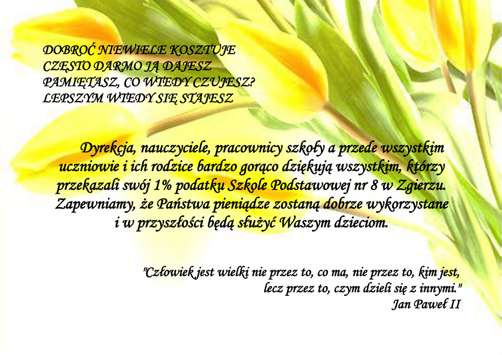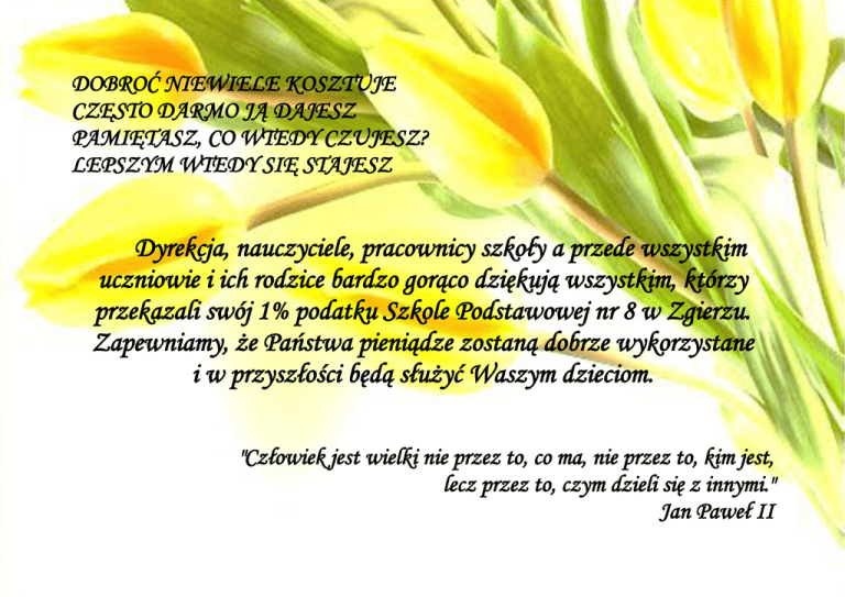 DOBROĆ NIEWIELE KOSZTUJE CZĘSTO DARMO JĄ DAJESZ PAMIĘTASZ, CO WTEDY CZUJESZ? LEPSZYM WTEDY SIĘ STAJESZ Dyrekcja, nauczyciele, pracownicy szkoły a przede wszystkim uczniowie i ich rodzice bardzo gorąco dziękują wszystkim, którzy przekazali swój 1% podatku Szkole Podstawowej nr 8 w Zgierzu. Zapewniamy, że Państwa pieniądze zostaną dobrze wykorzystane i w przyszłości będą służyć Waszym dzieciom. "Człowiek jest wielki nie przez to, co ma, nie przez to, kim jest, lecz przez to, czym dzieli się z innymi." Jan Paweł II