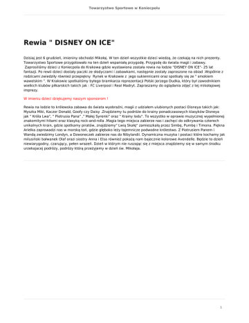 Towarzystwo Sportowe w Koniecpolu Rewia " DISNEY ON ICE" Dzisiaj jest 6 grudzień, imieniny obchodzi Mikołaj. W ten dzień wszystkie dzieci wiedzą, że czekają na nich prezenty. Towarzystwo Sportowe przygotowało na ten dzień wspaniałą przygodę. Przygodę do świata magii i zabawy. Zaprosiliśmy dzieci z Koniecpola do Krakowa gdzie wystawiona została rewia na lodzie "DISNEY ON ICE"- 25 lat fantazji. Po rewii dzieci dostały paczki ze słodyczami i zabawkami, następnie zostały zaproszone na obiad .Wspólnie z rodzicami zwiedziły również przepiękny Rynek w Krakowie z jego sukiennicami oraz spotkały się ze " smokiem wawelskim ". W Krakowie spotkaliśmy byłego bramkarza reprezentacji Polski Jerzego Dudka, który był zawodnikiem wielkich klubów piłkarskich takich jak : FC Liverpool i Real Madryt. Zapraszamy do oglądania zdjęć z tej mikołajowej imprezy. W imieniu dzieci dziękujemy naszym sponsorom ! Rewia na lodzie to królewska zabawa do świata wyobraźni, magii z udziałem ulubionych postaci Disneya takich jak: Myszka Miki, Kaczor Donald, Goofy czy Daisy .Znajdziemy tu podróże do krainy ponadczasowych klasyków Disneya jak " Króla Lwa", " Piotrusia Pana" ," Małej Syrenki" oraz " Krainy lodu". To wszystko w oprawie muzycznej wypełnionej znakomitymi hitami oraz klasyką rock-and-rolla .Magia tego miejsca zabierze nas i zachęci do odkrywania czterech unikalnych krain, gdzie spotkamy piratów, znajdziemy" Lwią Skałę" zamieszkałą przez Simbę, Pumbę i Timona. Piękna Arielka zaprowadzi nas w morską toń, gdzie głęboko leży tajemnicze podwodne królestwo. Z Piotrusiem Panem i Wandą zwiedzimy Londyn, a Dzwoneczek zabierze nas do Nibylandii. Dynamiczna muzyka i postaci które kochamy jak milusiński bałwanek Olaf orazi siostry Anna i Elsa również pokażą nam bajecznie kolorowe Avendelle. Będzie to dzień niewiarygodny, czarujący, pełen wrazeń. Dzień w którym nie ruszając się z miejsca znajdziemy się w samym środku urzekajacej podróży, podróży którą przeżyjemy w dzień św. Mikołaja. 1