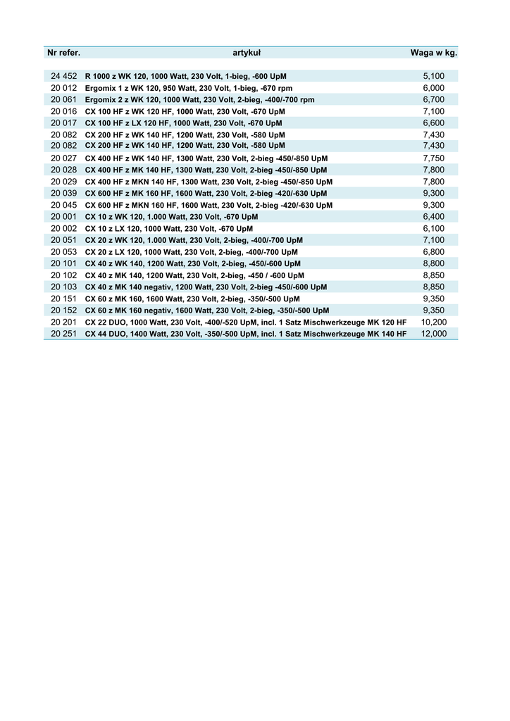 Nr refer. 24 452 20 012 20 061 20 016 20 017 20 082 20 082 20 027 20 028 20 029 20 039 20 045 20 001 20 002 20 051 20 053 20 101 20 102 20 103 20 151 20 152 20 201 20 251 artykuł R 1000 z WK 120, 1000 Watt, 230 Volt, 1-bieg, -600 UpM Ergomix 1 z WK 120, 950 Watt, 230 Volt, 1-bieg, -670 rpm Ergomix 2 z WK 120, 1000 Watt, 230 Volt, 2-bieg, -400/-700 rpm CX 100 HF z WK 120 HF, 1000 Watt, 230 Volt, -670 UpM CX 100 HF z LX 120 HF, 1000 Watt, 230 Volt, -670 UpM CX 200 HF z WK 140 HF, 1200 Watt, 230 Volt, -580 UpM CX 200 HF z WK 140 HF, 1200 Watt, 230 Volt, -580 UpM CX 400 HF z WK 140 HF, 1300 Watt, 230 Volt, 2-bieg -450/-850 UpM CX 400 HF z MK 140 HF, 1300 Watt, 230 Volt, 2-bieg -450/-850 UpM CX 400 HF z MKN 140 HF, 1300 Watt, 230 Volt, 2-bieg -450/-850 UpM CX 600 HF z MK 160 HF, 1600 Watt, 230 Volt, 2-bieg -420/-630 UpM CX 600 HF z MKN 160 HF, 1600 Watt, 230 Volt, 2-bieg -420/-630 UpM CX 10 z WK 120, 1.000 Watt, 230 Volt, -670 UpM CX 10 z LX 120, 1000 Watt, 230 Volt, -670 UpM CX 20 z WK 120, 1.000 Watt, 230 Volt, 2-bieg, -400/-700 UpM CX 20 z LX 120, 1000 Watt, 230 Volt, 2-bieg, -400/-700 UpM CX 40 z WK 140, 1200 Watt, 230 Volt, 2-bieg, -450/-600 UpM CX 40 z MK 140, 1200 Watt, 230 Volt, 2-bieg, -450 / -600 UpM CX 40 z MK 140 negativ, 1200 Watt, 230 Volt, 2-bieg -450/-600 UpM CX 60 z MK 160, 1600 Watt, 230 Volt, 2-bieg, -350/-500 UpM CX 60 z MK 160 negativ, 1600 Watt, 230 Volt, 2-bieg, -350/-500 UpM CX 22 DUO, 1000 Watt, 230 Volt, -400/-520 UpM, incl. 1 Satz Mischwerkzeuge MK 120 HF CX 44 DUO, 1400 Watt, 230 Volt, -350/-500 UpM, incl. 1 Satz Mischwerkzeuge MK 140 HF Waga w kg. 5,100 6,000 6,700 7,100 6,600 7,430 7,430 7,750 7,800 7,800 9,300 9,300 6,400 6,100 7,100 6,800 8,800 8,850 8,850 9,350 9,350 10,200 12,000