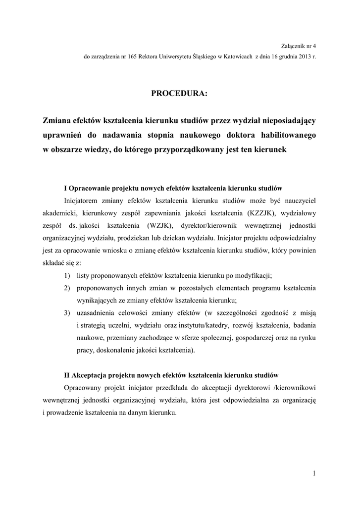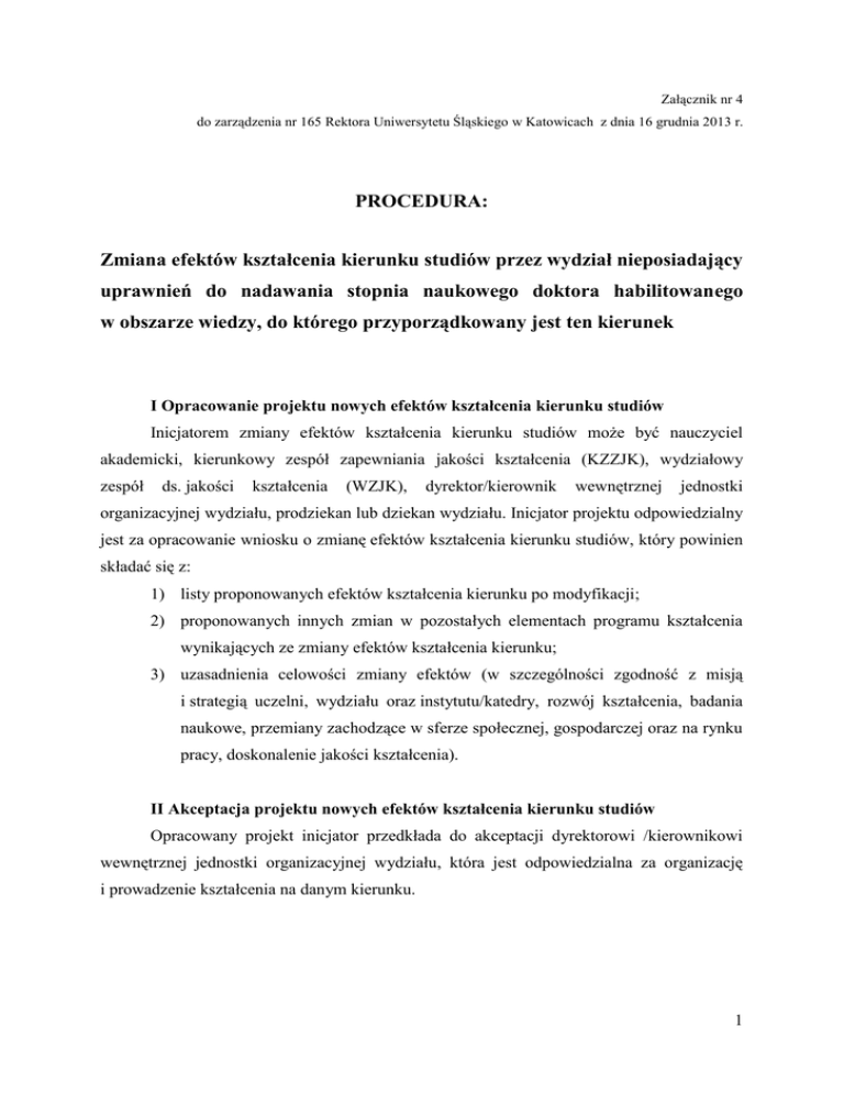 Załącznik nr 4 do zarządzenia nr 165 Rektora Uniwersytetu Śląskiego w Katowicach z dnia 16 grudnia 2013 r. PROCEDURA: Zmiana efektów kształcenia kierunku studiów przez wydział nieposiadający uprawnień do nadawania stopnia naukowego doktora habilitowanego w obszarze wiedzy, do którego przyporządkowany jest ten kierunek I Opracowanie projektu nowych efektów kształcenia kierunku studiów Inicjatorem zmiany efektów kształcenia kierunku studiów może być nauczyciel akademicki, kierunkowy zespół zapewniania jakości kształcenia (KZZJK), wydziałowy zespół ds. jakości kształcenia (WZJK), dyrektor/kierownik wewnętrznej jednostki organizacyjnej wydziału, prodziekan lub dziekan wydziału. Inicjator projektu odpowiedzialny jest za opracowanie wniosku o zmianę efektów kształcenia kierunku studiów, który powinien składać się z: 1) listy proponowanych efektów kształcenia kierunku po modyfikacji; 2) proponowanych innych zmian w pozostałych elementach programu kształcenia wynikających ze zmiany efektów kształcenia kierunku; 3) uzasadnienia celowości zmiany efektów (w szczególności zgodność z misją i strategią uczelni, wydziału oraz instytutu/katedry, rozwój kształcenia, badania naukowe, przemiany zachodzące w sferze społecznej, gospodarczej oraz na rynku pracy, doskonalenie jakości kształcenia). II Akceptacja projektu nowych efektów kształcenia kierunku studiów Opracowany projekt inicjator przedkłada do akceptacji dyrektorowi /kierownikowi wewnętrznej jednostki organizacyjnej wydziału, która jest odpowiedzialna za organizację i prowadzenie kształcenia na danym kierunku. 1 III Opracowanie szczegółowego projektu nowych efektów kształcenia kierunku oraz innych zmian w programie kształcenia przez kierunkowy zespół zapewniania jakości kształcenia W przypadku akceptacji projektu, dyrektor/kierownik wewnętrznej jednostki organizacyjnej wydziału przedstawia propozycję zmiany efektów kształcenia kierunku studiów kierunkowemu zespołowi zapewniania jakości kształcenia (KZZJK). KZZJK opracowuje szczegółowy projekt nowych efektów oraz innych zmian w programie kształcenia wynikających ze zmiany efektów, w szczególności ewentualnych zmian w kosztorysie kierunku studiów. W pracach KZZJK powinien uczestniczyć inicjator zmian w efektach kształcenia. W trakcie prac nad szczegółowym projektem efektów KZZJK przeprowadza konsultacje z nauczycielami akademickimi prowadzącymi zajęcia na kierunku (w szczególności z pracownikami zaliczonymi do minimum kadrowego kierunku), studentami kierunku oraz interesariuszami zewnętrznymi kierunku (w szczególności przedstawicielami potencjalnych pracodawców, absolwentami, reprezentantami stosownych organizacji lub stowarzyszeń związanych bezpośrednio z daną branżą gospodarki bądź dziedziną nauki). KZZJK przedstawia opracowany projekt nowych efektów kształcenia kierunku studiów oraz wszelkich innych zmian w programie kształcenia kierunku do akceptacji dyrektorowi/kierownikowi wewnętrznej jednostki organizacyjnej wydziału oraz radzie instytutu/ zebraniu pracowników wewnętrznej jednostki organizacyjnej wydziału. Jeśli z uwagi na specyfikę wydziału lub kierunku studiów nie można określić instytutu/katedry odpowiedzialnej za organizację i prowadzenie kształcenia na tworzonym kierunku, funkcję dyrektora/kierownika wewnętrznej jednostki organizacyjnej wydziału przejmuje dziekan, a funkcję rady instytutu/zebrania pracowników wewnętrznej jednostki organizacyjnej wydziału przejmuje rada wydziału. IV Zaopiniowanie projektu programu kształcenia przez radę wydziału i skierowanie pisma przewodniego do rektora Opracowany przez KZZJK projekt nowych efektów kształcenia oraz wszelkich innych zmian w programie kształcenia, po zaakceptowaniu go przez radę instytutu/zebranie pracowników wewnętrznej jednostki organizacyjnej wydziału, dyrektor/kierownik wewnętrznej jednostki organizacyjnej wydziału przekazuje dziekanowi celem przedłożenia radzie wydziału do zaopiniowania. Rada wydziału, po zasięgnięciu opinii wydziałowego zespołu ds. jakości kształcenia, podejmuje uchwałę w sprawie proponowanych nowych efektów kształcenia kierunku. 2 Po podjęciu przez radę wydziału stosownych uchwał dziekan kieruje: 1) do prorektora odpowiedzialnego za sprawy kształcenia, za pośrednictwem Działu Kształcenia, pismo przewodnie z wnioskiem o zmianę przez Senat UŚ efektów kształcenia kierunku wraz z uzasadnieniem merytorycznym i kompletem dokumentów (uchwały rady wydziału, projekt programu kształcenia wraz z załącznikami) w formie elektronicznej; 2) do prorektora odpowiedzialnego za sprawy finansów, za pośrednictwem Kwestora, projekt zmiany kosztów kierunku studiów w formie stacjonarnej wynikającej ze zmiany efektów kształcenia i możliwości jego sfinansowania przez podstawową jednostkę organizacyjną, bądź z wykorzystaniem zewnętrznych źródeł finansowych lub kosztorys studiów niestacjonarnych, zawierający kalkulację kosztów i wysokość opłat po wprowadzeniu zmian wynikających ze zmiany efektów kształcenia; jeśli wskutek zmiany efektów kształcenia koszty prowadzenia studiów nie ulegają zmianie, informację o tym przekazuje do prorektora odpowiedzialnego za sprawy finansów za pośrednictwem Kwestora; nie później niż: 1) do 22 stycznia jeśli nowe efekty kształcenia obejmą studentów rozpoczynających cykl studiów od 1 października tego roku; 2) do 21 listopada jeśli nowe efekty kształcenia obejmą studentów rozpoczynających cykl studiów po przyjęciu na studia rekrutacji zimowej. Ostateczną dokumentację w formie papierowej i elektronicznej należy dostarczyć do Działu Kształcenia i Kwestora co najmniej tydzień przed posiedzeniem Senatu UŚ, na którym odbędzie się głosowanie nad wnioskiem. Jeśli kierunek studiów prowadzony jest wspólnie przez co najmniej dwa wydziały, wyżej wymienione uchwały mus