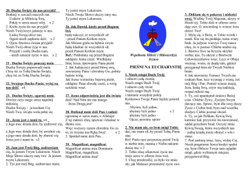 20. Duchu Święty do nas przyjdź! Dotknij w sercach naszych ran. Uzdrów je Miłością Swą, Pokój w serca nasze wlej. x 2 2. Królu życia do nas przyjdź! Niech Twój krzyż jaśnieje w nas. Łaską Swoją ulecz nas, Ogień niech zapłonie dziś. x 2 3. Ojcze Stwórco świata przyjdź! Niech Twój obraz żyje w nas. Przyjdź i ześlij Ducha nam, - niech umocni życie w nas. x 2 21 . Duchu Święty pouczaj mnie Duchu Święty poprowadź mnie Chcę iść za Tobą Duchu Święty, chcę iść za Tobą Duchu Święty. 22. Swojego Ducha Panie, wylej na nas dziś! x4 23. Duchu Święty, ogarnij mnie, Otwórz oczy mego serca napełnij miłością Duchu Święty - ja kocham Cię Niech Twa święta wola pełni się Ty jesteś mym Lekarzem. Niech Twoje Słowo uleczy rany me, Ty jesteś mym Lekarzem. 26. Jak Dawid, kiedy przed Bogiem był, będę tańczyć ze wszystkich sił - przed Panem Królem mym. Jak Miriam grała na bębnie swym będę klaskać ze wszystkich sił, przed Panem Królem mym. Ref.: Pokłońmy się przed Bogiem oddajmy Jemu cześć. Wielbijmy Imię Jezus, śpiewajmy Panu pieśń. 2. Jak Judejczycy przed bitwą swą, zawierzmy Panu i chwalmy Go, pobity będzie wróg. Jak Jozue wznieśmy bojową pieśń, oddajmy Panu chwałę cześć, a wróg ucieknie wnet. 27. Jezus odpowiedzią jest dla świata dziś! Nad Nim nie ma innego – Jezus Drogą jest! 28. Dotknął mnie dziś Pan i radość ogromną w sercu mam, o Alleluja! 24 . Jezus jest z nami tu x4 Z tej radości chcę śpiewać i klaskać w a Jego moc działa dziś, by uzdrowić cię, dłonie swe. Więc wszyscy razem chwalmy Go za a Jego moc działa dziś, by uwolnić cię. to, że trzyma nas Ręką Swą! x2 a jego moc działa dziś, by zbawić cię. 2. Spotkał mnie dziś Pan… Jezus jest z nami tu. x2 29. Magnificat, magnificat, 25. Jam jest Twój Bóg, uzdrawiam Magnificat anima mea Dominum cię, Ja jestem Twym Lekarzem. Niech Magnificat, magnificat, Moje Słowo uleczy rany twe Ja jestem Magnificat anima mea! twym Lekarzem. 2. Tyś jest mój Bóg, uzdrawiasz mnie, 3. Zbliżam się w pokorze i niskości swej. Wielbię Twój Majestat, skryty w Hostii tej. Tobie dziś w ofierze serce daję swe. O, utwierdzaj w wierze Jezu dzieci Twe! 2. Mylą się, o Boże, w Tobie wzrok i smak. Kto się im poddaje, temu wiary brak. Ja jedynie wierzyć Twej nauce chcę, że w postaci Chleba utaiłeś się. 3. Bóstwo Swe na Krzyżu skryłeś Wspólnota Miłość i Miłosierdzie wobec nas. Tu ukryte z Bóstwem Jezusa Człowieczeństwo wraz. Lecz w Oboje wierząc, wiem, że dojdę tam, gdzieś PIEŚNI NA EUCHARYSTIĘ przygarnął łotra do Twych Niebios bram. 1. Niech zstąpi Duch Twój 4. Jak niewierny Tomasz Twych nie i odnowi całą ziemię. szukam Ran, lecz wyznaję z wiarą, żeś Niech zstąpi Duch Twój mój Bóg i Pan. Pomóż wierze mojej, i odnowi cały świat Jezu, łaską Swą, ożyw mą nadzieję, Niech zstąpi Duch Twój rozpal miłość mą. i nastanie wszędzie pokój 5. Ty, coś upamiętnił śmierci Bożej Królestwo Twoje Panie będzie pośród czas. Chlebie Żywy, Życiem Swym nas. darzący nas. Spraw, bym dla swej duszy Abyśmy byli jedno, Życie z Ciebie brał, bym nad wszelką abyśmy byli jedno x2 słodycz Ciebie poznać chciał. abyśmy byli jedno – 6. Ty, co jak Pelikan, Krwią Swą Ojcze, prosimy spraw karmisz lud, przywróć mi niewinność, oddal grzechów brud. Oczyść mnie 2. Nie mam nic, co bym mógł Tobie Krwią Swoją, która wszystkich nas dać, nie mam sił, by przed Tobą, Panie – jedną kroplą może obmyć z win i stać. zmaz. Ref: Puste ręce przynoszę przed Twój 7. Pod zasłoną teraz, Jezu, widzę Cię. w niebie tron, manną z Nieba nakarm Niech pragnienie Serca kiedyś spełni duszę mą. x 2 się, bym Oblicze Twoje tam oglądać 2. Tobie chcę ofiarować życie me. mógł, gdzie wybranym miejsce moje serce w ofierze Jezu weź. przygotował Bóg. 3. Chcę przekreślić, co było we mnie złe, jak Mateusz przemienić życie swe. 4. Jam niegodzien, Panie, tego coś mi dał, Tyś mnie tak biednego umiłować chciał. Nie mam nic swojego, wszystko z ręki Twej, ale mnie samego przyjąć chciej. x 2 1. Jestem jak pył ziemi, który niesie wiatr, jakby spadający z nieba w ziemię grad. Jestem jak rozbity przez wichurę dzban, gdy nie stoisz przy mnie Ty, mój Bóg i Pan. 2. Przeciw moim wrogom, Ty mi dajesz moc, z Tobą mi nie straszna nawet śmierć i noc. Czuję, żeś tu blisko, żeś mi pomóc chciał, choć nie jestem godzien tego, coś mi dał. Ref: Jezus jest we mnie, w moim sercu żyje. On jest mój, a ja Jego, wyłącznie – jedynie. Serce Jezusa w moim sercu bije Krew Przenajświętsza w moich - żyłach płynie. 7 . Uwielbiamy Cię Jezu, Baranku nasz! Uwielbiamy Cię Jezu, Baranku nasz! Uwielbiamy Cię Jezu, Baranku nasz! Uwielbiony bądź na wieki, Panie nasz! 8. Kocham Ciebie Jezu, wznoszę ręce dając cześć. Całym światem jesteś Mi, 5. O Panie, Ty nam dajesz Ciało swe i uwielbiam Twoje Imię, Panie. Krew. x 2 Do Ciebie więc idziemy wciąż radosną 9. Jest jedno Ciało, jest jeden Pan Jednoczy nas w Duchu byśmy razem nucąc pieśń: szli. Ref. Ty jesteś Bogiem wiernym na Usta głoszą chwałę Mu, w ręku Słowa wieczny czas. x 2 Jego miecz - w moc odziani tak 2. Przez dar Twojego Chleba, dobry idziemy, zdobywamy ziemię tę. Boże nasz. x 2 Rodzinę bratnią czynisz z nas, miłować Ref. Jesteśmy ludem Króla chwał, Jego świętym narodem, uczysz nas. wybranym pokoleniem, by objawiać 3. To Twoje miłowanie dało wolność Jego cześć. nam. x 2 Jesteśmy ludem Króla chwał, Jego Chwalimy święte Imię Twoje, jak świętym narodem - wielbimy Jezusa, uczyłeś nas. On jest Królem całej ziemi tej. 4. Tyś nam ukazał drogę, wiodącą na Twój szlak. x 2 *** Idziemy więc, by radość nieść tam, 10. Przyjdź Jezu, przyjdź, czekamy gdzie jej światu brak dziś do naszych serc, do naszych dni. / x2 6. O cuda, cuda dzisiaj niepojęte: Niech spłynie Twoja łaska i niech