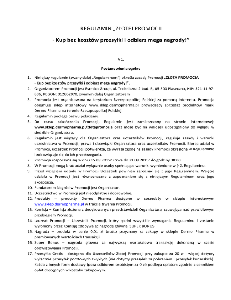REGULAMIN „ZŁOTEJ PROMOCJI ‐ Kup bez kosztów przesyłki i odbierz mega nagrody!” § 1. Postanowienia ogólne 1. Niniejszy regulamin (zwany dalej „Regulaminem”) określa zasady Promocji „ZŁOTA PROMOCJA ‐ Kup bez kosztów przesyłki i odbierz mega nagrody!”. 2. Organizatorem Promocji jest Estetica Group, ul. Techniczna 2 bud. B, 05‐500 Piaseczno, NIP: 521‐11‐97‐ 806, REGON: 012862070, zwanym dalej Organizatorem 3. Promocja jest organizowana na terytorium Rzeczpospolitej Polskiej za pomocą Internetu. Promocja obejmuje sklep internetowy www.sklep.dermopharma.pl prowadzący sprzedaż produktów marki Dermo Pharma na terenie Rzeczpospolitej Polskiej. 4. Regulamin podlega prawu polskiemu. 5. Do czasu zakończenia Promocji, Regulamin jest zamieszczony na stronie internetowej: www.sklep.dermopharma.pl/zlotapromocja oraz może być na wniosek udostępniony do wglądu w siedzibie Organizatora. 6. Regulamin jest wiążący dla Organizatora oraz uczestników Promocji, reguluje zasady i warunki uczestnictwa w Promocji, prawa i obowiązki Organizatora oraz uczestników Promocji. Biorąc udział w Promocji, uczestnik Promocji potwierdza, że wyraża zgodę na zasady Promocji określone w Regulaminie i zobowiązuje się do ich przestrzegania. 7. Promocja rozpoczyna się w dniu 15.08.2015r i trwa do 31.08.2015r do godziny 00:00. 8. W Promocji mogą brać udział wyłącznie osoby spełniające warunki wymienione w § 2. Regulaminu. 9. Przed wzięciem udziału w Promocji Uczestnik powinien zapoznać się z jego Regulaminem. Wzięcie udziału w Promocji jest równoznaczne z zapoznaniem się z niniejszym Regulaminem oraz jego akceptacją. 10. Fundatorem Nagród w Promocji jest Organizator. 11. Uczestnictwo w Promocji jest nieodpłatne i dobrowolne. 12. Produkty – produkty Dermo Pharma dostępne w sprzedaży w sklepie internetowym www.sklep.dermopharma.pl w trakcie trwania Promocji. 13. Komisja – Komisja złożona z dedykowanych przedstawicieli Organizatora, czuwająca nad prawidłowym przebiegiem Promocji. 14. Laureat Promocji – Uczestnik Promocji, który spełni wszystkie wymagania Regulaminu i zostanie wyłoniony przez Komisję zdobywając nagrodę główną: SUPER BONUS 15. Nagroda – produkt w cenie 0.01 zł brutto przyznany za zakupy w sklepie Dermo Pharma w premiowanych wartościach transakcji. 16. Super Bonus – nagroda główna za najwyższą wartościowo transakcję dokonaną w czasie obowiązywania Promocji. 17. Przesyłka Gratis ‐ dostępna dla Uczestników Złotej Promocji przy zakupie za 20 zł i więcej dotyczy wyłącznie przesyłek pocztowych zwykłych (nie dotyczy przesyłek za pobraniem i przesyłek kurierskich). Każda z innych form dostawy (poza odbiorem osobistym za 0 zł) podlega opłatom zgodnie z cennikiem opłat dostępnych w koszyku zakupowym. § 2. Uczestnicy Promocji 1. W Promocji może wziąć udział osoba (dalej: Uczestnik) spełniająca następujące warunki: a. jest pełnoletnią osobą fizyczną, b. osoby niepełnoletnie biorą udział w Promocji za pisemną zgodą rodzica lub opiekuna prawnego, c. posiada pełną zdolność do czynności prawnych, d. zamieszkuje na terytorium Rzeczpospolitej Polskiej, e. jest konsumentem w rozumieniu art. 22 kodeksu cywilnego, f. zarejestruje się w bazie sklepu i potwierdzi maila rejestracyjnego lub poprawnie zaloguje się w sklepie internetowym Dermo Pharma (dla osób, które wcześniej dokonały poprawnej rejestracji), g. dobrowolnie wyrazi zgodę na przetwarzanie danych osobowych (tj. imię i nazwisko, dokładną datę urodzenia, dane adresowe /ulica, numer domu i mieszkania, kod pocztowy, miejscowość/ oraz numer telefonu kontaktowego, e‐mail) przez Organizatora dla celów związanych z niniejszą Promocją, zgodnie z ustawą z dnia 29.08.1997 o ochronie danych osobowych. h. dokona zakupu w sklepie internetowym www.sklep.dermopharma.pl zgodnie z warunkami Promocji. 2. W Promocji nie mogą brać udziału: pracownicy Organizatora (co obejmuje osoby zatrudnione w tych podmiotach w okresie trwania Promocji na podstawie umowy o pracę lub współpracujące z tymi podmiotami na podstawie umów cywilnoprawnych), inne podmioty współpracujące przy organizacji Promocji, jak również członkowie ich rodzin (małżonkowie, dzieci i dzieci małżonków, rodzice, rodzeństwo, dziadkowie). Zgłoszenia osób nieuprawnionych do udziału w Promocji nie będą rozpatrywane. Organizator nie jest zobowiązany do pobierania i gromadzenia oświadczeń dotyczących tego zastrzeżenia, jednak może żądać złożenia takich oświadczeń. § 3. Zasady Promocji i Nagrody 1. W Promocji będą premiowane zakupy produktów Dermo Pharma dokonywane w sklepie internetowym www.sklep.dermopharma.pl w czasie od dnia 15 sierpnia 2015 r. do dnia 31 sierpnia 2015 r. 2. W celu wzięcia udziału w Promocji, uzyskania statusu Uczestnika Promocji i odebrania nagrody za zakupy oraz możliwości skorzystania z bezpłatnej przesyłki pocztowej, osoba spełniająca warunki, o których mowa w § 2 Regulaminu jest zobowiązana do: a. polubienie funpage Dermo Pharma na FB www.facebook.com/dermopharmapl b. dokonanie zakupu w premiowanych kwotach dowolnych produktów w sklepie internetowym Dermo Pharma po uprzednim poprawnym zalogowaniu do bazy sklepu. 3. Rodzaj przyznanej Nagrody zależy od wartości transakcji. 4. Premiowane wartości transakcji to: 20 zł, 40 zł, 60 zł, 80 zł brutto 5. Nagrody: a. przy zakupie w kwocie od 20,00 zł do 39,99 zł brutto ‐ Nagroda nr 1 to: złuszczająca maska na stopy z aktywnym kompleksem PediBio‐Fruit; b. przy zakupie w kwocie od 40,00 zł do 59,99 zł brutto ‐ Zestaw nagród nr 2 to: złuszczająca maska na stopy z aktywnym kompleksem PediBio‐Fruit, odżywcza maska kompres 4D na stopy; c. przy zakupie w kwocie od 60,00 zł do 79,99 zł brutto ‐ Zestaw nagród nr 3 to: złuszczająca maska na stopy z aktywnym kompleksem PediBio‐Fruit, odżywcza maska kompres 4D na stopy, regenerująca maska