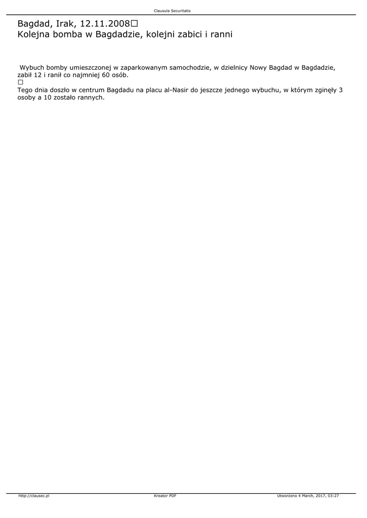 Clausula Securitatis Bagdad, Irak, 12.11.2008 Kolejna bomba w Bagdadzie, kolejni zabici i ranni Wybuch bomby umieszczonej w zaparkowanym samochodzie, w dzielnicy Nowy Bagdad w Bagdadzie, zabił 12 i ranił co najmniej 60 osób. Tego dnia doszło w centrum Bagdadu na placu al-Nasir do jeszcze jednego wybuchu, w którym zginęły 3 osoby a 10 zostało rannych. http://clausec.pl Kreator PDF Utworzono 4 March, 2017, 03:27