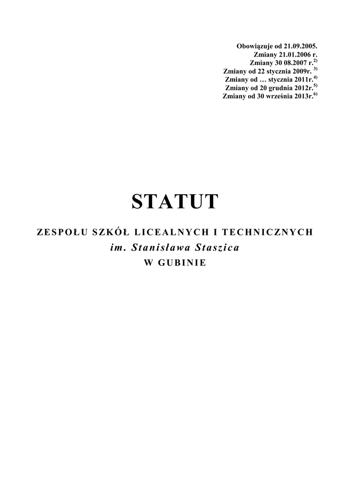 Obowiązuje od 21.09.2005. Zmiany 21.01.2006 r. Zmiany 30 08.2007 r.2) Zmiany od 22 stycznia 2009r. 3) Zmiany od … stycznia 2011r.4) Zmiany od 20 grudnia 2012r.5) Zmiany od 30 września 2013r.6) STATUT ZESPOŁU SZKÓŁ LICEALNYCH I TECHNICZNYCH im. Stanisława Staszica W GUBINIE Zespół Szkół Licealnych i Technicznych im. St. Staszica w Gubinie §1 1. ZESPÓŁ SZKÓŁ LICEALNYCH i TECHNICZNYCH im. Stanisława Staszica w Gubinie, zwany dalej „ZSLiT”, jest publiczną szkołą ponadgimnazjalną. ZSLiT mieści się w Gubinie przy ul. Racławickiej 1. 2. W skład ZSLiT wchodzą: a) szkoły: 5) Technikum nr 1 Działalność Technikum nr 1 określa Statut Technikum nr 1 4) Zasadnicza Szkoła Zawodowa nr 1 - 2-letnia - zawód: sprzedawca - 2 i 3-letnia - dla młodocianych pracujących - 2-letnia – zawód: kucharz małej gastronomii I Liceum Ogólnokształcące Działalność I Liceum Ogólnokształcącego określa Statut I Liceum Ogólnokształcącego 5) Zasadnicza Szkoła Zawodowa Specjalna nr 3 Działalność Zasadniczej Szkoły Zawodowej Specjalnej nr 3 określa Statut Zasadniczej Szkoły Zawodowej Specjalnej nr 3 Zasadnicza Szkoła Zawodowa Specjalna nr 4, dla upośledzonych umysłowo w stopniu lekkim 4) - 2-letnia z wydłużeniem – zawód: kucharz małej gastronomii - 3-letnia – zawód: pracownik pomocniczy obsługi hotelowej 5) Zasadnicza Szkoła Zawodowa nr 5 Działalność Zasadniczej Szkoły Zawodowej nr 5 określa Statut Zasadniczej Szkoły Zawodowej nr 5 6) Uzupełniające Liceum Ogólnokształcące Liceum Ogólnokształcące dla Dorosłych b) internat, 6) c) schronisko d) hala sportowa. 6) 3. Zespół prowadzi oddziały integracyjne. 4. Organem prowadzącym ZSLiT jest Powiat Krośnieński, a szkoła jest jednostką budżetową 5. Organem sprawującym nadzór nad ZSLiT jest Lubuski Kurator Oświaty w Gorzowie Wlkp, zwane dalej „organem nadzorującym”. Cele i zadania szkoły §2 ZSLiT realizuje cele i zadania określone w ustawie oraz przepisach wydanych na jej podstawie, a w szczególności: 1. Umożliwia zdobycie wiedzy i umiejętności niezbędnych do uzyskania świadectwa ukończenia szkoły: a) przygotowanie młodzieży do życia w świecie ludzi dorosłych pod względem wiedzy, umiejętności współżycia, 4) podejmowania decyzji i pełnienia różnych ról społecznych , b) wyposażenie uczniów w wiedzę ogólną, zawodową i umiejętności związane z określoną specjalnością, c) kształtowanie i utrwalanie w świadomości młodzieży właściwego stosunku do obowiązków, szacunku do pracy, fachowości i kompetencji. 2. Umożliwia absolwentom dokonanie świadomego wyboru dalszego kierunku kształcenia lub wykonywania wybranego zawodu poprzez: a) rozbudzanie potrzeby samodoskonalenia się, 4) b) ukazywanie konieczności pracy dla szkoły, społeczności lokalnej i Polski. 3. Kształtuje środowisko wychowawcze sprzyjające realizowaniu celów i zasad określonych w ustawie, stosownie do warunków szkoły i liczby uczniów poprzez: a) wpajanie norm i zasad moralnych regulujących społecznie pożądany charakter stosunków międzyludzkich, b) rozbudzanie pragnienia czynnego uczestnictwa w kulturze celem rozwijania postaw twórczych i własnej aktywności kulturalnej, c) przyzwyczajanie do dbałości o własne zdrowie, rozwój fizyczny i wyrabianie nawyku aktywnego spędzania czasu wolnego. 4. ZSLiT sprawuje opiekę nad uczniami odpowiednio do możliwości szkoły oraz ich potrzeb poprzez: 1 Statut po zmianach z listopada.2012r. Zespół Szkół Licealnych i Technicznych im. St. Staszica w Gubinie a) przeciwdziałanie wszelkim patologiom społecznym i przejawom naruszenia norm prawnych, b) zapobieganie nieprawidłowościom rozwoju somatycznego. 5. W celu zapewnienia bezpieczeństwa uczniom i pracownikom ZSLiT budynki i teren szkolny objęte zostają nadzorem 4) kamer CCTV. 6. Materiały monitoringu wizyjnego mogą zostać wykorzystane do prezentowania przykładów dobrej praktyki zacho4) wania uczniów jak również ustalania faktycznych sprawców działań niezgodnych z obowiązującym prawem. §3 Sposób realizacji celów i zadań, a w szczególności w zakresie: 4) 1. Umożliwienie uczniom podtrzymywania poczucia tożsamości narodowej, etnicznej, językowej i religijnej: a) pomoc w rozumieniu istoty i głębi patriotyzmu, tolerancji, pokoju i potrzeby ochrony środowiska, b) umożliwienie wymiany poglądów na interesujące młodzież tematy, c) organizowanie uroczystości szkolnych z okazji świąt państwowych, d) ukazywanie sylwetki patrona ZSLiT oraz wybitnych Polaków, e) stworzenie optymalnych warunków do nauki w szkole, f) kształtowanie pozytywnych motywacji do nauki. 2. Udzielanie uczniom pomocy pedagogicznej i psychologicznej: a) indywidualna pomoc nauczyciela, b) diagnozowanie i ustalanie form pracy z uczniem potrzebującym opieki indywidualnej przez Szkolną Komisję Opiekuńczo-Wychowawczą, c) współpraca z Poradnią Psychologiczno-Pedagogiczną, d) organizowanie spotkań z lekarzami, psychologami i innymi specjalistami. 3. Organizowanie opieki nad uczniami niepełnosprawnymi: a) indywidualny tok nauki, b) powołanie zespołu korekcyjno-kompensacyjnego, c) powołanie zespołów wyrównawczych. 4. Umożliwienie rozwijania zainteresowań uczniów: a) organizowanie kół zainteresowań, zespołów artystycznych, sportowych, rekreacyjnych, turystycznych oraz działalności rozrywkowej, b) organizowanie konkursów, olimpiad, zawodów, przeglądów, wystaw, c) korzystanie w sposób zorganizowany z kin, teatrów, muzeów itp., d) tworzenie warunków do rozwijania samorządnych form działalności uczniów. 5. Organizowanie nauczania w klasach integracyjnych: §4 1. Zasady sprawowania opieki nad uczniami przebywającymi w szkole podczas zajęć obowiązkowych, nadobowiązkowych i pozalekcyjnych: a) każdy nauczyciel odpowiada służbowo i prawnie za zdrowie i życie powierzonej jego opiece młodzieży, b) odpowiedzialność za ucznia na zajęci