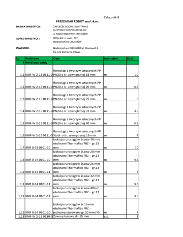 Załącznik 8 PRZEDMIAR ROBÓT wod.-kan. NAZWA INWESTYCJI : ZAPLECZE SOCJAL.-SANITARNE BUDYNKU GOSPODARCZEGO w NADLESNICTWIE CHOJNÓW ADRES INWESTYCJI : DZIALKA nr ewid, 262 Nadlesnictwo CHOJNÓW INWESTOR: Nadlesnictwo CHOJNÓWul. Klonowa13, 05-532 Baniocha Pilawa Lp. Podstawa 1 instalacja wody Opis Jedn.obm. Ilość Rurociągi z tworzyw sztucznych PP m 1,1 KNR-W 2-15 0111-01PN20 o śr. zewnętrznej 16 mm 10 Rurociągi z tworzyw sztucznych PP 1,2 KNR-W 2-15 0111-01PN20 o śr. zewnętrznej 20 mm m 4,5 Rurociągi z tworzyw sztucznych PP m 1,3 KNR-W 2-15 0111-02PN20 o śr. zewnętrznej 25 mm 5 Rurociągi z tworzyw sztucznych PP 1,4 KNR-W 2-15 0111-03PN20 o śr. zewnętrznej 32 mm m 3,5 Rurociągi z tworzyw sztucznych PP m 1,5 KNR-W 2-15 0111-04PN20 o śr. zewnętrznej 40 mm 3,5 1,6 1,7 1,8 1,9 1,1 1,11 Rurociągi z tworzyw sztucznych PP KNR-W 2-15 0111-01Stabi o śr. zewnętrznej 16 mm Izolacja rurociągów śr.zew 16 mm otulinami Thermaflex FRZ - gr.13 KNR 0-34 0101-10 mm Izolacja rurociągów śr.zew 20 mm otulinami Thermaflex FRZ - gr.13 KNR 0-34 0101-10 mm Izolacja rurociągów śr.zew 25 mm otulinami Thermaflex FRZ - gr.13 KNR 0-34 0101-11 mm Izolacja rurociągów śr.zew 32 mm otulinami Thermaflex FRZ - gr.13 KNR 0-34 0101-11 mm Izolacja rurociągów śr.zew 40mm otulinami Thermaflex FRZ - gr.13 KNR 0-34 0101-11 mm Izolacja rurociągów śr.16 mm otulinami Thermaflex FRZ 1,12 KNR 0-34 0101-10 jednowarstwowymi gr.20 mm (N) 1,13 KNR-W 2-15 0130-01Zawory kulowe dn.15 mm m 4 m 10 m 4,5 m 5 m 3,5 m 3,5 m szt. 4 2 Zawory przelotowe i zwrotne instalacji wodociągowych z rur 1,14 KNR-W 2-15 0130-04stalowych o śr. nominalnej 32 mm szt. Zawory ANTYSKAŻENIOWE EA o śr. 1,15 KNR-W 2-15 0130-04nominalnej 32 mm szt. 3 1 Zawory czerpalne z tworzyw 1,16 KNR-W 2-15 0136-03sztucznych o śr. nominalnej 25 mm szt. 1 Wodomierze skrzydełkowe 1,17 KNR-W 2-15 0140-02domowe o śr. nominalnej 20 mm kpl. 1 szt. szt. 8 10 kpl. 3 1,18 KNR-W 2-15 0132-01Zawór kulowy kątowy dn.15 mm 1,19 KNR-W 2-15 0116-07Dodatki za podejścia do baterii Podgrzewacz pojemnościowy SHU 1,2 KNR-W 2-15 0143-015Sli Stiebel eltron Płukanie instalacji wodociągowej w 1,21 KNR-W 2-15 0128-02budynkach niemieszkalnych Próba szczelności instalacji wodociągowych z rur z tworzyw sztucznych w budynkach niemieszkalnych (rurociąg o śr. do 1,22 KNR-W 2-15 0127-0363 mm) Razem dział instalacja wody 2 Kanalizacja sanitarna wewnętrzna Rurociągi z PVC/ HT o śr. 110 mm na ścianach w budynkach niemieszkalnych o połączeniach wciskowych - ściany z betonu 2,1 KNR-W 2-15 0208-03żwirowego z.o.2.5. 9901 Rurociągi z PVC kanalizacyjne o śr. 75 mm na ścianach w budynkach niemieszkalnych o połączeniach 2,2 KNR-W 2-15 0208-02wciskowych Rurociągi z PVC HT o śr. 50 mm na ścianach w budynkach niemieszkalnych o połączeniach 2,3 KNR-W 2-15 0208-01wciskowych Dodatki za wykonanie podejść odpływowych z PVC /HT o śr. 50 2,4 KNR-W 2-15 0211-01mm o połączeniach wciskowych Dodatki za wykonanie podejść odpływowych z PVC HT o śr. 110 2,5 KNR-W 2-15 0211-03mm Wpusty ściekowe z tworzywa 2,6 KNR-W 2-15 0218-01sztucznego o śr. 50 mm m 30,5 m 30,5 m 6 m 2,5 m 2 podej. 6 podej. 2 szt. 1 Czyszczaki z PVC kanalizacyjne o śr. 2,7 KNR-W 2-15 0222-02110 mm o połączeniach wciskowych szt. Rury wywiewne z blachy stalowej uszczelnione sznurem i zaprawą 2,8 KNR-W 2-15 0212-06cementową o śr. 100 mm Razem dział Kanalizacja sanitarna wewnętrzna 3 Kanalizacja sanitarna podposadzkowa 1 szt. 1 m 5 Ńrurociągi żeliwne kanalizacyjne o śr. 100 mm w gotowych wykopach, wewnątrz budynków uszczelnione 3,2 KNR-W 2-15 0201-08folią aluminiową m 5,5 Ńrurociągi żeliwne kanalizacyjne o śr. 70 mm w gotowych wykopach, wewnątrz budynków uszczelnione 3,1 KNR-W 2-15 0201-07folią aluminiową 3,3 KNR-W 2-15 0220-03Rewizja w posadzce o śr. 100 mm Razem dział Kanalizacja sanitarna podposadzkowa 4 Biały montaż Baterie umywalkowe KLUDI OBJEKTA MIX NEW DN10 4,1 KNR-W 2-15 0137-02332200575;05 CHROM szt. 1 szt. 2 Baterie zmywakowe stojące KLUDI szt. 4,2 KNR-W 2-15 0137-02OBJEKTA MIX NEW 338830575 1 Zlewozmywak ze stali nierdzewnej 4,3 KNR-W 2-15 0229-051- komorowy z ociekaczem FRANKE Umywalki pojedyncze porcelanowe z syfonem gruszkowym KOŁO NOVA 4,4 KNR-W 2-15 0230-02TOP Elementy montażowe Geberit Unifix do miski ustępowej montowane w ściance lekkiej 4,5 KNR 2-15/GEBERIT 0102-05 przycisk delta chrom GEBERIT 4,6 KNR 2-15/GEBERIT 0202-01 szt. 1 kpl. 2 kpl. kpl. 2 2 Urządzenia sanitarne na elemencie montażowym -KOŁO NOVA TOP 4,7 KNR 2-15/GEBERIT 0104-01 kpl. 2 Pisuary ALEX KOŁO pojedyncze z 4,8 KNR-W 2-15 0234-02zaworem spłukującym 2 Razem dział Biały montaż kpl. 5 przyłacze wodociągowe Przyłącze wodociągowe z rur ciśnieniowych PE łączonych metodą zgrzewania czołowego - rurociągi o śr.32 mm ( nakłady na 1 m przyłącza m 5,1 KNR-W 2-18 0808-01) Wykopy oraz przekopy wykonywane koparkami przedsiębiernymi 0.15 m3 na 5,2 KNR-W 2-01 0211-01odkład w gruncie kat.I-II m3 Zasypywanie wykopów spycharkami z przemieszczeniem gruntu na odl. do 10 m w gruncie 5,3 KNR-W 2-01 0222-01kat. I-III m3 Zagęszczenie nasypów ubijakami mechanicznymi; grunty sypkie kat. I5,4 KNR-W 2-01 0228-01III m3 Podłoża pod kanały i obiekty z m3 5,5 KNR-W 2-18 0511-02materiałów sypkich grub. 15 cm Razem dział przyłacze wodociągowe 6 przyłacze kanalizacyjne Wykopy oraz przekopy wykonywane koparkami przedsiębiernymi 0.15 m3 na 6,1 KNR-W 2-01 0211-01odkład w gruncie kat.I-II m3 Zasypywanie wykopów spycharkami z przemieszczeniem gruntu na odl. do 10 m w gruncie 6,2 KNR-W 2-01 0222-01kat. I-III m3 Zagęszczenie nasypów ubijakami mechanicznymi; grunty sypkie kat. I6,3 KNR-W 2-01 0228-01III m3 Podłoża pod kanały i obiekty z m3 6,4 KNR-W 2-18 0511-02materiałów sypkich grub. 15 cm Mechaniczne opuszczanie zbiorników żelbetowych w gruntach 6,5 KNR 2-02 1924-01 suchych kat.I-II m3 Studzienki kanalizacyjne systemowe "VAWIN" o śr 600mm 6,6 KNR-W 2-18 0517-02zamkn