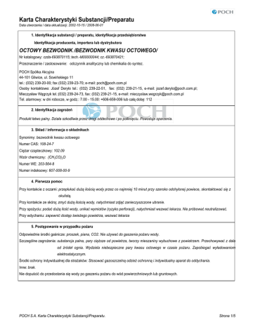 Karta Charakterystyki Substancji/Preparatu Data utworzenia / data aktualizacji: 2002-10-15 / 2008-06-01 1. Identyfikacja substancji / preparatu, identyfikacja przedsiębiorstwa Identyfikacja producenta, importera lub dystrybutora OCTOWY BEZWODNIK /BEZWODNIK KWASU OCTOWEGO/ Nr katalogowy: czda-693870115; tech.-M00000044; cz.-693870421; Przeznaczenie / zastosowanie: odczynnik analityczny lub chemikalia do syntez. POCH Spółka Akcyjna 44-101 Gliwice, ul. Sowińskiego 11 tel.: (032) 239-20-00; fax (032) 239-23-70; e-mail: [email protected] Osoby kontaktowe: Józef Deryło tel.: (032) 239-22-51, fax: (032) 239-21-15, e-mail: [email protected]; Mieczysław Węgrzyk tel.:(032) 239-24-73, fax: (032) 239-21-15, e-mail: [email protected] Tel. alarmowy: w dni robocze, w godz.: 7.00 - 15.00: +606-659-006 lub całą dobę: 112 2. Identyfikacja zagrożeń Produkt łatwo palny. Działa szkodliwie przez drogi oddechowe i po połknięciu. Powoduje oparzenia. 3. Skład / informacja o składnikach Synonimy: bezwodnik kwasu octowego Numer CAS: 108-24-7 Ciężar cząsteczkowy: 102.09 Wzór chemiczny: (CH3CO)2O Numer WE: 203-564-8 Numer indeksowy: 607-008-00-9 4. Pierwsza pomoc Przy kontakcie z oczami: przepłukać dużą ilością wody przez co najmniej 10 minut przy szeroko odchylonej powiece, skontaktować się z okulistą. Przy kontakcie ze skórą: zmyć dużą ilością wody, natychmiast zdjąć zanieczyszczone ubranie. Przy spożyciu: podać dużą ilość wody, unikać wymiotów (ryzyko perforacji), natychmiast wezwać lekarza. Nie próbować neutralizować. Przy wdychaniu: zapewnić dostęp świeżego powietrza, wezwać lekarza 5. Postępowanie w przypadku pożaru Odpowiednie środki gaśnicze: proszek, piana, CO2. Nie używać do gaszenia pożaru wody. Szczególne zagrożenia: substancja palna, pary cięższe od powietrza, tworzy mieszaniny wybuchowe z powietrzem. Przechowywać z dala od źródeł ognia. Wydziela niebezpieczne pary kwasu octowego w czasie pożaru. Zapobiegać wyładowaniom elektrostatycznym. Środki ochrony indywidualnej dla strażaków: Stosować gazoszczelną odzież ochronną i indywidualny aparat do oddychania. Inne: brak. Nie dopuścić do przedostania się wody po gaszeniu pożaru do wód powierzchniowych lub gruntowych. POCH S.A. Karta Charakterystyki Substancji/Preparatu. Strona 1/5 OCTOWY BEZWODNIK /BEZWODNIK KWASU OCTOWEGO/ 6. Postępowanie w przypadku niezamierzonego uwolnienia do środowiska Ostrożnie zebrać przy pomocy substancji absorbującej ciecze, przekazać do likwidacji. Oczyścić zanieczyszczony teren. Unikać kontaktu z substancją. Nie wdychać par. Zapewnić dopływ świeżego powietrza do zamkniętych pomieszczeń. Zmniejszenie szkodliwości: zneutralizować rozcieńczonym roztworem wodorotlenku sodu. Nie dopuścić do dostania się do wód, ścieków i gleby. 7. Postępowanie z substancją / preparatem i jej / jego magazynowanie Obchodzenie się z substancją: Zapewnić skuteczną wymianę powietrza (wentylacja). Postępować zgodnie z zasadami dobrej praktyki przemysłowej oraz ogólnymi zasadami bezpieczeństwa i higieny pracy z substancjami chemicznymi. Stosować środki ochrony osobistej zgodnie z pkt.8. Nie opróżniać do kanalizacji. Postępować zgodnie z zasadami obchodzenia się z substancjami żrącymi. Magazynowanie: szczelne opakowania. Suche, dobrze wentylowane pomieszczenie. Z dala od źródeł ognia i ciepła. Temperatura pokojowa (zalecana +15 do +25°C). Rozporządzenie Ministra Zdrowia z dnia 14 marca 2003 r. w sprawie sposobu oznakowania miejsc, rurociągów oraz pojemników i zbiorników służących do przechowywania lub zawierających substancje niebezpieczne lub preparaty niebezpieczne (Dz.U.03.61.552) 8. Kontrola narażenia i środki ochrony indywidualnej Paramerty kontroli (NDS, NDSCh, NDSP): Stosować odpowiednią wentylację wywiewną, miejscową i ogólną zapewniającą utrzymanie stężenia produktu w powietrzu poniżej określonych limitów. Zaleca się wyposażenie miejsca pracy w wodny natrysk do płukania oczu oraz prysznic. Środki ochrony indywidualnej powinny być tak zaprojektowane i wykonane aby wykluczały zagrożenie i inne niedogodności w przewidywanych warunkach użytkowania, chroniące przed chemikaliami. Środki ochrony indywidualnej: ochrona dróg oddechowych: konieczna gdy tworzą się pary/aerozole - maska przeciwgazowa ochrona oczu: konieczna - okulary ochronne typu gogle ochrona rąk: konieczna - rękawice ochronne odporne na działanie chemikaliów wykonane z gumy nitrylowej lub inne dopuszczone przez producenta rękawic do kontaktu z tym produktem. Czas wytrzymałości materiału określa producent rękawic. ochrona ciała: konieczna - ubranie ochronne środki ochronne i higieny: natychmiast zmienić zanieczyszczone ubranie. Wymyć ręce i twarz po pracy z tą substancją. Stosować krem ochronno-barierowy do skóry. Rozporządzenie Ministra Zdrowia z dnia 30 grudnia 2004 r. w sprawie bezpieczeństwa i higieny pracy związanej z występowaniem w miejscu pracy czynników chemicznych (Dz.U.05.11.86). Rozporządzenie Ministra Pracy i Polityki Społecznej z dnia 30 sierpnia 2007 (Dz. U. nr 161, poz. 1142) POCH S.A. Karta Charakterystyki Substancji/Preparatu. Strona 2/5 OCTOWY BEZWODNIK /BEZWODNIK KWASU OCTOWEGO/ 9. Właściwości fizyczne i chemiczne Forma: ciecz lepkość dynamiczna: (200): 0,91 mPa*s Kolor: bezbarwny lepkość kinematyczna: Zapach: ostry Ciśnienie par: 4 hPa (20°C) pH: około 3 (10 g/l H2O, 20°C) Gęstość: 1,08 g/cm3 (20°C) Temperatura topnienia: -73°C Ciężar nasypowy: nie dotyczy Temperatura wrzenia: 140°C Rozpuszczalność: Temperatura samozapłonu: 330°C w wodzie: rozpuszczalny (gwałtowna reakcja) Temperatura zapłonu: 49°C w rozpuszczalnikach organicznych: brak danych Granice wybuchowości: log P(w/o): dolna: 2% obj. górna: 10,2% obj. 10. Stabilność i reaktywność Warunki których należy unikać: ciepło. Materiały których należy unikać: amoniak, czynniki utlen