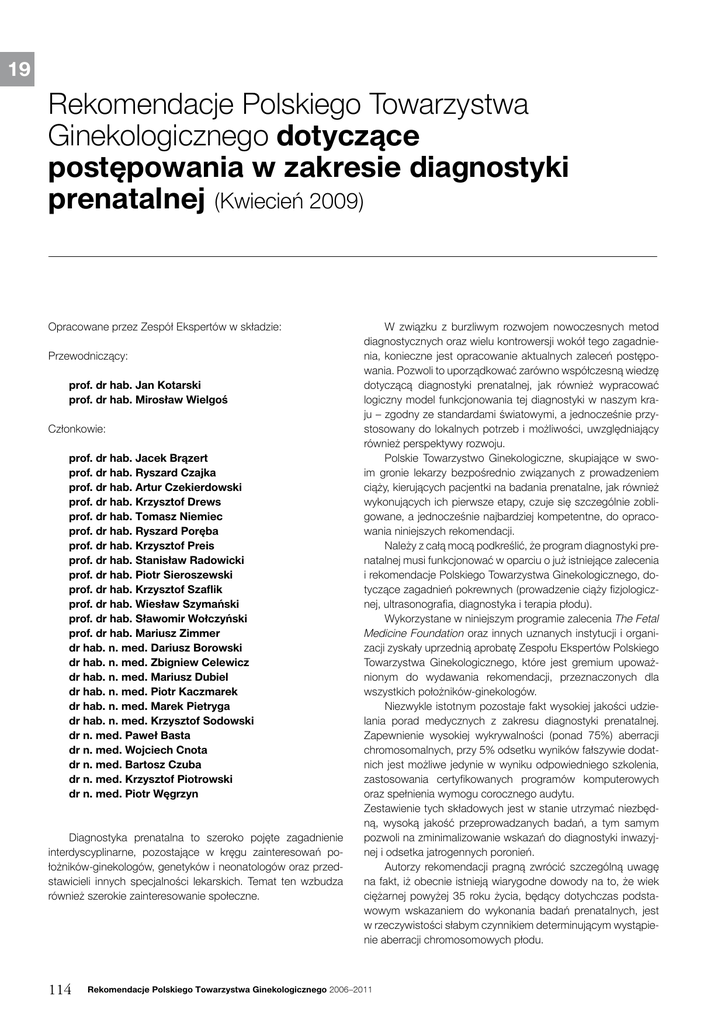 19 Rekomendacje Polskiego Towarzystwa Ginekologicznego dotyczące postępowania w zakresie diagnostyki prenatalnej (Kwiecień 2009) Opracowane przez Zespół Ekspertów w składzie: Przewodniczący: prof. dr hab. Jan Kotarski prof. dr hab. Mirosław Wielgoś Członkowie: prof. dr hab. Jacek Brązert prof. dr hab. Ryszard Czajka prof. dr hab. Artur Czekierdowski prof. dr hab. Krzysztof Drews prof. dr hab. Tomasz Niemiec prof. dr hab. Ryszard Poręba prof. dr hab. Krzysztof Preis prof. dr hab. Stanisław Radowicki prof. dr hab. Piotr Sieroszewski prof. dr hab. Krzysztof Szaflik prof. dr hab. Wiesław Szymański prof. dr hab. Sławomir Wołczyński prof. dr hab. Mariusz Zimmer dr hab. n. med. Dariusz Borowski dr hab. n. med. Zbigniew Celewicz dr hab. n. med. Mariusz Dubiel dr hab. n. med. Piotr Kaczmarek dr hab. n. med. Marek Pietryga dr hab. n. med. Krzysztof Sodowski dr n. med. Paweł Basta dr n. med. Wojciech Cnota dr n. med. Bartosz Czuba dr n. med. Krzysztof Piotrowski dr n. med. Piotr Węgrzyn Diagnostyka prenatalna to szeroko pojęte zagadnienie interdyscyplinarne, pozostające w kręgu zainteresowań po łożników-ginekologów, genetyków i neonatologów oraz przed stawicieli innych specjalności lekarskich. Temat ten wzbudza również szerokie zainteresowanie społeczne. 114 W związku z burzliwym rozwojem nowoczesnych metod diagnostycznych oraz wielu kontrowersji wokół tego zagadnie nia, konieczne jest opracowanie aktualnych zaleceń postępo wania. Pozwoli to uporządkować zarówno współczesną wiedzę dotyczącą diagnostyki prenatalnej, jak również wypracować logiczny model funkcjonowania tej diagnostyki w naszym kra ju – zgodny ze standardami światowymi, a jednocześnie przy stosowany do lokalnych potrzeb i możliwości, uwzględniający również perspektywy rozwoju. Polskie Towarzystwo Ginekologiczne, skupiające w swo im gronie lekarzy bezpośrednio związanych z prowadzeniem ciąży, kierujących pacjentki na badania prenatalne, jak również wykonujących ich pierwsze etapy, czuje się szczególnie zobli gowane, a jednocześnie najbardziej kompetentne, do opraco wania niniejszych rekomendacji. Należy z całą mocą podkreślić, że program diagnostyki pre natalnej musi funkcjonować w oparciu o już istniejące zalecenia i rekomendacje Polskiego Towarzystwa Ginekologicznego, do tyczące zagadnień pokrewnych (prowadzenie ciąży fizjologicz nej, ultrasonografia, diagnostyka i terapia płodu). Wykorzystane w niniejszym programie zalecenia The Fetal Medicine Foundation oraz innych uznanych instytucji i organi zacji zyskały uprzednią aprobatę Zespołu Ekspertów Polskiego Towarzystwa Ginekologicznego, które jest gremium upoważ nionym do wydawania rekomendacji, przeznaczonych dla wszystkich położników-ginekologów. Niezwykle istotnym pozostaje fakt wysokiej jakości udzie lania porad medycznych z zakresu diagnostyki prenatalnej. Zapewnienie wysokiej wykrywalności (ponad 75%) aberracji chromosomalnych, przy 5% odsetku wyników fałszywie dodat nich jest możliwe jedynie w wyniku odpowiedniego szkolenia, zastosowania certyfikowanych programów komputerowych oraz spełnienia wymogu corocznego audytu. Zestawienie tych składowych jest w stanie utrzymać niezbęd ną, wysoką jakość przeprowadzanych badań, a tym samym pozwoli na zminimalizowanie wskazań do diagnostyki inwazyj nej i odsetka jatrogennych poronień. Autorzy rekomendacji pragną zwrócić szczególną uwagę na fakt, iż obecnie istnieją wiarygodne dowody na to, że wiek ciężarnej powyżej 35 roku życia, będący dotychczas podsta wowym wskazaniem do wykonania badań prenatalnych, jest w rzeczywistości słabym czynnikiem determinującym wystąpie nie aberracji chromosomowych płodu. Rekomendacje Polskiego Towarzystwa Ginekologicznego 2006–2011 Rekomendacje PTG dotyczące postępowania w zakresie diagnostyki prenatalnej. Następstwem tego było wykonywanie niepotrzebnych w wielu przypadkach zabiegów inwazyjnych, obarczonych określonym ryzykiem ciężkich powikłań, z utratą ciąży włącz nie. W obecnej dobie szczególny nacisk należy zatem położyć na wykonywanie nowoczesnych badań nieinwazyjnych oraz dążyć do nadania im charakteru przesiewowego. W opinii Zespołu Ekspertów ośrodki i osoby, aspirujące do świadczenia usług w zakresie diagnostyki prenatalnej, mu szą bezwzględnie posiadać odpowiednie certyfikaty Polskiego Towarzystwa Ginekologicznego oraz zalecane przez to Towarzystwo certyfikaty Fetal Medicine Foundation. Ośrodki i osoby te muszą mieć ponadto pełną możliwość zapewnienia swoim potencjalnym pacjentkom kompleksowej opieki medycznej, obejmującej kwalifikacje do diagnostyki, jej wykonanie, specjalistyczne poradnictwo, jak również wszelkie formy opieki, będące naturalną i logiczną konsekwencją prowa dzenia niniejszej diagnostyki, uwzględniające świadomą wolę pacjentek. Zespół Ekspertów wyraża nadzieję, iż opracowane re komendacje, powstałe w oparciu o najnowsze osiągnięcia i trendy światowe, obejmą w pełni problematykę diagnostyki prenatalnej w naszym kraju. Jesteśmy głęboko przekonani, iż zalecenia te spotkają się ze zrozumieniem i życzliwym przy jęciem ze strony środowiska lekarskiego, jak również zyskają akceptację Ministerstwa Zdrowia oraz Narodowego Funduszu Zdrowia, stanowiąc podstawę funkcjonowania obowiązujących programów rządowych. Rekomendacje dotyczące diagnostyki prenatalnej Kwalifikacja do badań prenatalnych 1. Wszystkie kobiety ciężarne w Polsce, bez względu na wiek, powinny mieć zaproponowane przesiewowe badania prenatalne w kierunku najczęściej spotykanych wad rozwojo wych i aberracji chromosomowych. 2. Badania inwazyjne powinny być przeprowadzone po uprzednim wykonaniu badań przesiewowych. Wyjątkiem mogą być ciężarne powyżej 40 roku życia oraz ciężarne świadomie rezygnujące z etapu badań przesiewowych. 3. Badania przesiewowe określają ryzyko wystąpienia aber racj