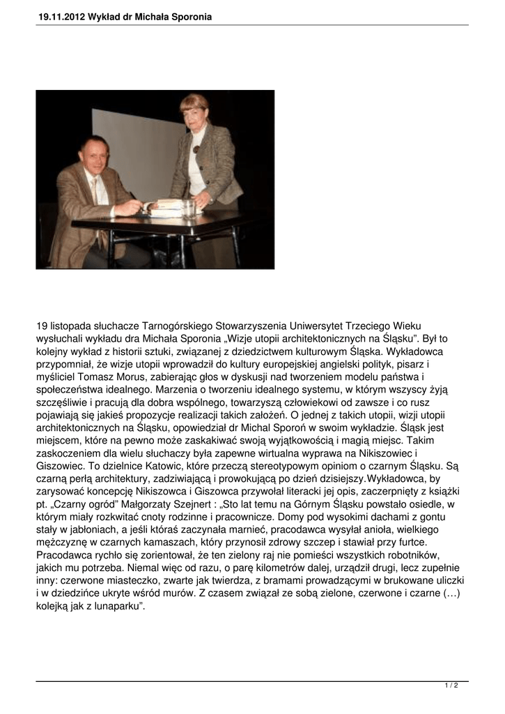 19.11.2012 Wykład dr Michała Sporonia 19 listopada słuchacze Tarnogórskiego Stowarzyszenia Uniwersytet Trzeciego Wieku wysłuchali wykładu dra Michała Sporonia „Wizje utopii architektonicznych na Śląsku”. Był to kolejny wykład z historii sztuki, związanej z dziedzictwem kulturowym Śląska. Wykładowca przypomniał, że wizje utopii wprowadził do kultury europejskiej angielski polityk, pisarz i myśliciel Tomasz Morus, zabierając głos w dyskusji nad tworzeniem modelu państwa i społeczeństwa idealnego. Marzenia o tworzeniu idealnego systemu, w którym wszyscy żyją szczęśliwie i pracują dla dobra wspólnego, towarzyszą człowiekowi od zawsze i co rusz pojawiają się jakieś propozycje realizacji takich założeń. O jednej z takich utopii, wizji utopii architektonicznych na Śląsku, opowiedział dr Michal Sporoń w swoim wykładzie. Śląsk jest miejscem, które na pewno może zaskakiwać swoją wyjątkowością i magią miejsc. Takim zaskoczeniem dla wielu słuchaczy była zapewne wirtualna wyprawa na Nikiszowiec i Giszowiec. To dzielnice Katowic, które przeczą stereotypowym opiniom o czarnym Śląsku. Są czarną perłą architektury, zadziwiającą i prowokującą po dzień dzisiejszy.Wykładowca, by zarysować koncepcję Nikiszowca i Giszowca przywołał literacki jej opis, zaczerpnięty z książki pt. „Czarny ogród” Małgorzaty Szejnert : „Sto lat temu na Górnym Śląsku powstało osiedle, w którym miały rozkwitać cnoty rodzinne i pracownicze. Domy pod wysokimi dachami z gontu stały w jabłoniach, a jeśli któraś zaczynała marnieć, pracodawca wysyłał anioła, wielkiego mężczyznę w czarnych kamaszach, który przynosił zdrowy szczep i stawiał przy furtce. Pracodawca rychło się zorientował, że ten zielony raj nie pomieści wszystkich robotników, jakich mu potrzeba. Niemal więc od razu, o parę kilometrów dalej, urządził drugi, lecz zupełnie inny: czerwone miasteczko, zwarte jak twierdza, z bramami prowadzącymi w brukowane uliczki i w dziedzińce ukryte wśród murów. Z czasem związał ze sobą zielone, czerwone i czarne (…) kolejką jak z lunaparku”. 1/2 19.11.2012 Wykład dr Michała Sporonia W który zbudowano polecenie „Giesches służącego szybko swoim określa opuścili wykładzie Anthona Erben”. najpierw na się początku obcy jako Historia Uthemanna dr im etnicznie osiedla, Sporoń – górnikom górnośląską Tajnego Śląsk, noszącego przypomniał splata sprowadzonym Radcy na kolonię parceli się historię zchałup historią o robotniczą. wymiarach zw ponad centralnych niemiecką rodu naczelnego Idealne 100 Giesche. 800 – nazwę na Niemiec, letniego osiedle 1200 dyrektora – metrów Gieschewald Giszowca, robotnicze którzy spółki na jednak iI Powstanie nowoczesne Zillmannów, budownictwa przynajmniej przemyślaną Giesche miasteczko postanowił Gieschewald familoków niemieckich domy detalem. infrastrukturę robotniczego. zbudowano wznieść – I,Michał Nikiszowiec mówiąc –minionego architektów. – Każdy drugą urządu, na językiem wzór domek kolonię, – iarchitektoniczne ciągu Ten Nikiszowca, nazwane chłopskich współczesnym, w pomysł handlowego, tym kolonii razem przez architektoniczny dzielnic zaprojektowano, wykładowcę było gospody wkomponowano to Katowic, to projekt niewielkie, iGiszowca to willi czerwoną miasta-ogrodu, Georga by rewolucja bergrata. był ale je inny, w utopią. Emila w bardzo różniący Zarząd dziedzinie którego się Jakie Michał poszukiwania ubiegając Pokazywał co realizacja dużym przekonać, odbiorcy. architektury utopii zaproszeniem podkreślając, ciekawe, są jest Sporoń, skrócie znaczenia Wykład dobrze obecne się świat jak że izwrócił marzeń o że architektury słuchaczy mamy sztuka mało ilustrując tytuł Śląska. czarna wszystkim doktora we iniemieckim także europejskiej znane wizje wiele owzorcową współczesnej postindustrialna stworzeniu utopia wykład do uwagę, Michała architektoniczne iGiszowca miejsc, wizje sztuki wspólnej znanego ciekawymi architektonicznych stolicy że współczesnej. Sporonia budowli, miejsca kulturze. wycieczki katowickiego wykorzystuje się kultury, przede zielonej, fotografiami. które zwrócił Swój w wykorzystały IGórniczego, mogą tu wszystkim magiczny wykład osiedla uwagę dawne, utopii czerwonej wyjaśnił Podkreślił, być Pokazywał dr na słuchaczy 1000-lecia. ciekawym zapomniane Michał zna hasło Śląsku tajemnicą i przykład, czarnej jak „miasto Sporoń utopii jak odwieczne irozwinął na bez doświadczeniem Studenci odczytywać utopii aktualność ijuż dlaczego alchemią, na wątpienia ogrodów”. podsumował często iurokliwe Śląsku Nikiszowca, pokazywał marzenia poznali Katowice pomysły. poszukiwań pewne bo mogli to –także taki dla współki doktor osię jest I„górniczy” słuchaczy stałe Trzeciego zapewne wpisany Uniwersytetu Wieku ten w kolejny program .Domowi już Trzeciego wykładów wykład dr. Wieku iwieku Michała działań dziedzictwem Tarnogórskiego Spornia oposzukiwania architekturze kulturowym, Stowarzyszeniajako że ten zainteresowanie Uniwersytet problem jest na Wydziałowi Tarnogórskie Janowi Hahnowi, Strategii Stowarzyszenie Kultury, Współpracy Promocji –kojarzy UTW, idziękuje Polsko Sportu. –początkowo za Niemieckiej pomoc przygotowaniu iświat Starostwu Powiatowemu wykładu panu Stanisława Szymczyk sekretarz Tarnogórskiego Stowarzyszenia –idealnego. UTW 2/2