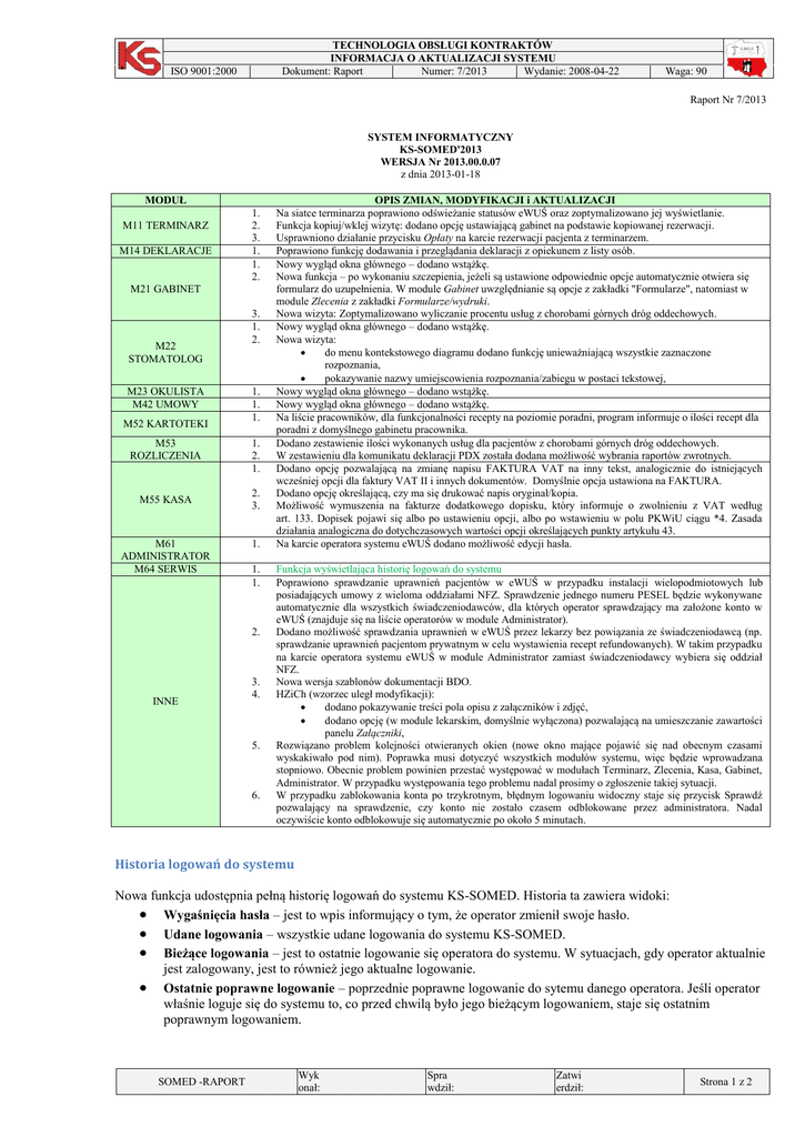 TECHNOLOGIA OBSŁUGI KONTRAKTÓW INFORMACJA O AKTUALIZACJI SYSTEMU Dokument: Raport Numer: 7/2013 Wydanie: 2008-04-22 ISO 9001:2000 Waga: 90 Raport Nr 7/2013 SYSTEM INFORMATYCZNY KS-SOMED'2013 WERSJA Nr 2013.00.0.07 z dnia 2013-01-18 MODUŁ M11 TERMINARZ M14 DEKLARACJE 1. 2. 3. 1. 1. 2. M21 GABINET M22 STOMATOLOG M23 OKULISTA M42 UMOWY M52 KARTOTEKI M53 ROZLICZENIA M55 KASA M61 ADMINISTRATOR M64 SERWIS 3. 1. 2. 1. 1. 1. 1. 2. 1. 2. 3. 1. 1. 1. 2. INNE 3. 4. 5. 6. OPIS ZMIAN, MODYFIKACJI i AKTUALIZACJI Na siatce terminarza poprawiono odświeżanie statusów eWUŚ oraz zoptymalizowano jej wyświetlanie. Funkcja kopiuj/wklej wizytę: dodano opcję ustawiającą gabinet na podstawie kopiowanej rezerwacji. Usprawniono działanie przycisku Opłaty na karcie rezerwacji pacjenta z terminarzem. Poprawiono funkcję dodawania i przeglądania deklaracji z opiekunem z listy osób. Nowy wygląd okna głównego – dodano wstążkę. Nowa funkcja – po wykonaniu szczepienia, jeżeli są ustawione odpowiednie opcje automatycznie otwiera się formularz do uzupełnienia. W module Gabinet uwzględnianie są opcje z zakładki "Formularze", natomiast w module Zlecenia z zakładki Formularze/wydruki. Nowa wizyta: Zoptymalizowano wyliczanie procentu usług z chorobami górnych dróg oddechowych. Nowy wygląd okna głównego – dodano wstążkę. Nowa wizyta: do menu kontekstowego diagramu dodano funkcję unieważniającą wszystkie zaznaczone rozpoznania, pokazywanie nazwy umiejscowienia rozpoznania/zabiegu w postaci tekstowej, Nowy wygląd okna głównego – dodano wstążkę. Nowy wygląd okna głównego – dodano wstążkę. Na liście pracowników, dla funkcjonalności recepty na poziomie poradni, program informuje o ilości recept dla poradni z domyślnego gabinetu pracownika. Dodano zestawienie ilości wykonanych usług dla pacjentów z chorobami górnych dróg oddechowych. W zestawieniu dla komunikatu deklaracji PDX została dodana możliwość wybrania raportów zwrotnych. Dodano opcję pozwalającą na zmianę napisu FAKTURA VAT na inny tekst, analogicznie do istniejących wcześniej opcji dla faktury VAT II i innych dokumentów. Domyślnie opcja ustawiona na FAKTURA. Dodano opcję określającą, czy ma się drukować napis oryginał/kopia. Możliwość wymuszenia na fakturze dodatkowego dopisku, który informuje o zwolnieniu z VAT według art. 133. Dopisek pojawi się albo po ustawieniu opcji, albo po wstawieniu w polu PKWiU ciągu *4. Zasada działania analogiczna do dotychczasowych wartości opcji określających punkty artykułu 43. Na karcie operatora systemu eWUŚ dodano możliwość edycji hasła. Funkcja wyświetlająca historię logowań do systemu Poprawiono sprawdzanie uprawnień pacjentów w eWUŚ w przypadku instalacji wielopodmiotowych lub posiadających umowy z wieloma oddziałami NFZ. Sprawdzenie jednego numeru PESEL będzie wykonywane automatycznie dla wszystkich świadczeniodawców, dla których operator sprawdzający ma założone konto w eWUŚ (znajduje się na liście operatorów w module Administrator). Dodano możliwość sprawdzania uprawnień w eWUŚ przez lekarzy bez powiązania ze świadczeniodawcą (np. sprawdzanie uprawnień pacjentom prywatnym w celu wystawienia recept refundowanych). W takim przypadku na karcie operatora systemu eWUŚ w module Administrator zamiast świadczeniodawcy wybiera się oddział NFZ. Nowa wersja szablonów dokumentacji BDO. HZiCh (wzorzec uległ modyfikacji): dodano pokazywanie treści pola opisu z załączników i zdjęć, dodano opcję (w module lekarskim, domyślnie wyłączona) pozwalającą na umieszczanie zawartości panelu Załączniki, Rozwiązano problem kolejności otwieranych okien (nowe okno mające pojawić się nad obecnym czasami wyskakiwało pod nim). Poprawka musi dotyczyć wszystkich modułów systemu, więc będzie wprowadzana stopniowo. Obecnie problem powinien przestać występować w modułach Terminarz, Zlecenia, Kasa, Gabinet, Administrator. W przypadku występowania tego problemu nadal prosimy o zgłoszenie takiej sytuacji. W przypadku zablokowania konta po trzykrotnym, błędnym logowaniu widoczny staje się przycisk Sprawdź pozwalający na sprawdzenie, czy konto nie zostało czasem odblokowane przez administratora. Nadal oczywiście konto odblokowuje się automatycznie po około 5 minutach. Historia logowań do systemu Nowa funkcja udostępnia pełną historię logowań do systemu KS-SOMED. Historia ta zawiera widoki: Wygaśnięcia hasła – jest to wpis informujący o tym, że operator zmienił swoje hasło. Udane logowania – wszystkie udane logowania do systemu KS-SOMED. Bieżące logowania – jest to ostatnie logowanie się operatora do systemu. W sytuacjach, gdy operator aktualnie jest zalogowany, jest to również jego aktualne logowanie. Ostatnie poprawne logowanie – poprzednie poprawne logowanie do sytemu danego operatora. Jeśli operator właśnie loguje się do systemu to, co przed chwilą było jego bieżącym logowaniem, staje się ostatnim poprawnym logowaniem. SOMED -RAPORT Wyk onał: Spra wdził: Zatwi erdził: Strona 1 z 2 ISO 9001:2000 TECHNOLOGIA OBSŁUGI KONTRAKTÓW INFORMACJA O AKTUALIZACJI SYSTEMU Dokument: Raport Numer: 7/2013 Wydanie: 2008-04-22 Waga: 90 Dwukrotne błędne logowanie – jest to zapis zdarzeń, gdy operator logując się do sytemu wpisał dwukrotnie błędne hasło. Trzykrotne błędne logowanie – jest to zapis zdarzeń, gdy operator logując się do sytemu wpisał trzykrotnie błędne hasło. Ostatnie błędne logowanie – kopia najnowszego wpisu z widoku Dwukrotne błędne logowanie lub Trzykrotne błędne logowanie. Ten widok ukazuje w szczególności zablokowane konta. Jasnym czerwonym kolorem wyróżniane są wpisy, które określają zablokowane konta, ale według systemu konta te powinny już automatycznie się odblokować, natomiast czerwony kolor określa konta, które według systemu są aktualnie zablokowane. Można je odblokować korzystając z przycisku 