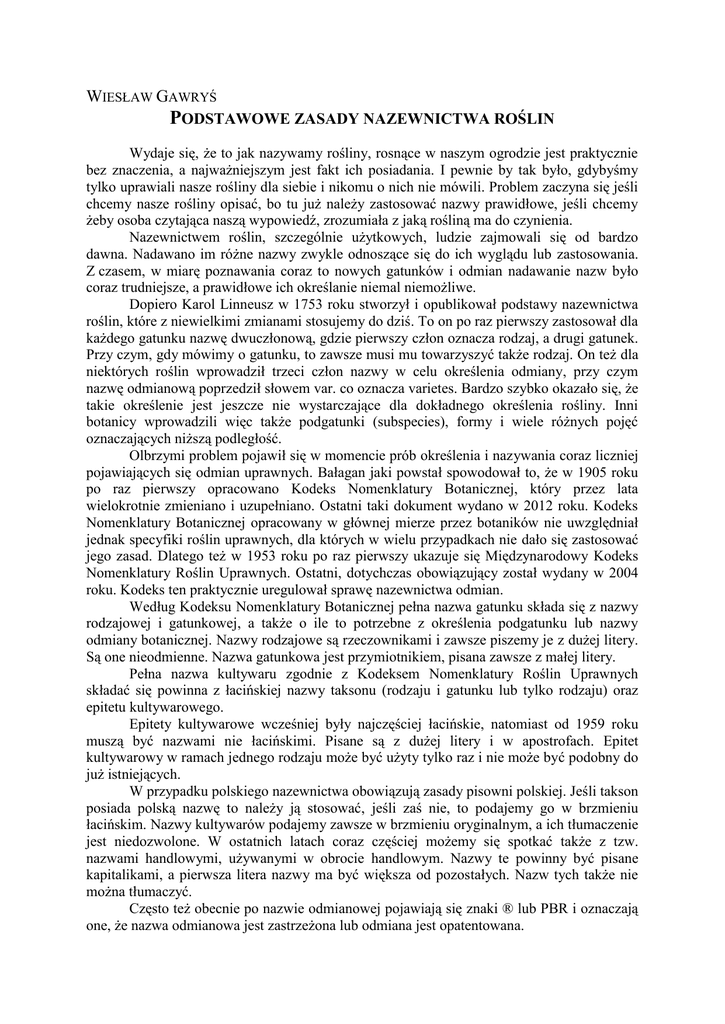 WIESŁAW GAWRYŚ PODSTAWOWE ZASADY NAZEWNICTWA ROŚLIN Wydaje się, że to jak nazywamy rośliny, rosnące w naszym ogrodzie jest praktycznie bez znaczenia, a najważniejszym jest fakt ich posiadania. I pewnie by tak było, gdybyśmy tylko uprawiali nasze rośliny dla siebie i nikomu o nich nie mówili. Problem zaczyna się jeśli chcemy nasze rośliny opisać, bo tu już należy zastosować nazwy prawidłowe, jeśli chcemy żeby osoba czytająca naszą wypowiedź, zrozumiała z jaką rośliną ma do czynienia. Nazewnictwem roślin, szczególnie użytkowych, ludzie zajmowali się od bardzo dawna. Nadawano im różne nazwy zwykle odnoszące się do ich wyglądu lub zastosowania. Z czasem, w miarę poznawania coraz to nowych gatunków i odmian nadawanie nazw było coraz trudniejsze, a prawidłowe ich określanie niemal niemożliwe. Dopiero Karol Linneusz w 1753 roku stworzył i opublikował podstawy nazewnictwa roślin, które z niewielkimi zmianami stosujemy do dziś. To on po raz pierwszy zastosował dla każdego gatunku nazwę dwuczłonową, gdzie pierwszy człon oznacza rodzaj, a drugi gatunek. Przy czym, gdy mówimy o gatunku, to zawsze musi mu towarzyszyć także rodzaj. On też dla niektórych roślin wprowadził trzeci człon nazwy w celu określenia odmiany, przy czym nazwę odmianową poprzedził słowem var. co oznacza varietes. Bardzo szybko okazało się, że takie określenie jest jeszcze nie wystarczające dla dokładnego określenia rośliny. Inni botanicy wprowadzili więc także podgatunki (subspecies), formy i wiele różnych pojęć oznaczających niższą podległość. Olbrzymi problem pojawił się w momencie prób określenia i nazywania coraz liczniej pojawiających się odmian uprawnych. Bałagan jaki powstał spowodował to, że w 1905 roku po raz pierwszy opracowano Kodeks Nomenklatury Botanicznej, który przez lata wielokrotnie zmieniano i uzupełniano. Ostatni taki dokument wydano w 2012 roku. Kodeks Nomenklatury Botanicznej opracowany w głównej mierze przez botaników nie uwzględniał jednak specyfiki roślin uprawnych, dla których w wielu przypadkach nie dało się zastosować jego zasad. Dlatego też w 1953 roku po raz pierwszy ukazuje się Międzynarodowy Kodeks Nomenklatury Roślin Uprawnych. Ostatni, dotychczas obowiązujący został wydany w 2004 roku. Kodeks ten praktycznie uregulował sprawę nazewnictwa odmian. Według Kodeksu Nomenklatury Botanicznej pełna nazwa gatunku składa się z nazwy rodzajowej i gatunkowej, a także o ile to potrzebne z określenia podgatunku lub nazwy odmiany botanicznej. Nazwy rodzajowe są rzeczownikami i zawsze piszemy je z dużej litery. Są one nieodmienne. Nazwa gatunkowa jest przymiotnikiem, pisana zawsze z małej litery. Pełna nazwa kultywaru zgodnie z Kodeksem Nomenklatury Roślin Uprawnych składać się powinna z łacińskiej nazwy taksonu (rodzaju i gatunku lub tylko rodzaju) oraz epitetu kultywarowego. Epitety kultywarowe wcześniej były najczęściej łacińskie, natomiast od 1959 roku muszą być nazwami nie łacińskimi. Pisane są z dużej litery i w apostrofach. Epitet kultywarowy w ramach jednego rodzaju może być użyty tylko raz i nie może być podobny do już istniejących. W przypadku polskiego nazewnictwa obowiązują zasady pisowni polskiej. Jeśli takson posiada polską nazwę to należy ją stosować, jeśli zaś nie, to podajemy go w brzmieniu łacińskim. Nazwy kultywarów podajemy zawsze w brzmieniu oryginalnym, a ich tłumaczenie jest niedozwolone. W ostatnich latach coraz częściej możemy się spotkać także z tzw. nazwami handlowymi, używanymi w obrocie handlowym. Nazwy te powinny być pisane kapitalikami, a pierwsza litera nazwy ma być większa od pozostałych. Nazw tych także nie można tłumaczyć. Często też obecnie po nazwie odmianowej pojawiają się znaki ® lub PBR i oznaczają one, że nazwa odmianowa jest zastrzeżona lub odmiana jest opatentowana.
