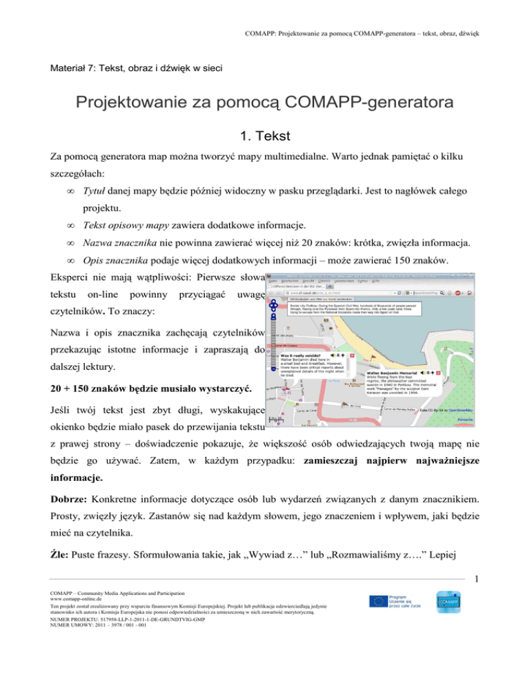 COMAPP: Projektowanie za pomocą COMAPP-generatora – tekst, obraz, dźwięk Materiał 7: Tekst, obraz i dźwięk w sieci Projektowanie za pomocą COMAPP-generatora 1. Tekst Za pomocą generatora map można tworzyć mapy multimedialne. Warto jednak pamiętać o kilku szczegółach: • Tytuł danej mapy będzie później widoczny w pasku przeglądarki. Jest to nagłówek całego projektu. • Tekst opisowy mapy zawiera dodatkowe informacje. • Nazwa znacznika nie powinna zawierać więcej niż 20 znaków: krótka, zwięzła informacja. • Opis znacznika podaje więcej dodatkowych informacji – może zawierać 150 znaków. Eksperci nie mają wątpliwości: Pierwsze słowa tekstu on-line powinny przyciągać uwagę czytelników. To znaczy: Nazwa i opis znacznika zachęcają czytelników przekazując istotne informacje i zapraszają do dalszej lektury. 20 + 150 znaków będzie musiało wystarczyć. Jeśli twój tekst jest zbyt długi, wyskakujące okienko będzie miało pasek do przewijania tekstu z prawej strony – doświadczenie pokazuje, że większość osób odwiedzających twoją mapę nie będzie go używać. Zatem, w każdym przypadku: zamieszczaj najpierw najważniejsze informacje. Dobrze: Konkretne informacje dotyczące osób lub wydarzeń związanych z danym znacznikiem. Prosty, zwięzły język. Zastanów się nad każdym słowem, jego znaczeniem i wpływem, jaki będzie mieć na czytelnika. Źle: Puste frazesy. Sformułowania takie, jak „Wywiad z…” lub „Rozmawialiśmy z….” Lepiej 1 COMAPP – Community Media Applications and Participation www.comapp-online.de Ten projekt został zrealizowany przy wsparciu finansowym Komisji Europejskiej. Projekt lub publikacja odzwierciedlają jedynie stanowisko ich autora i Komisja Europejska nie ponosi odpowiedzialności za umieszczoną w nich zawartość merytoryczną. NUMER PROJEKTU: 517958-LLP-1-2011-1-DE-GRUNDTVIG-GMP NUMER UMOWY: 2011 – 3978 / 001 - 001 COMAPP: Projektowanie za pomocą COMAPP-generatora – tekst, obraz, dźwięk zapisać tylko kluczowe informacje pozyskane od osoby, z którą przeprowadziliśmy wywiadu. 2. Obraz Dla obrazów/zdjęć, które będą widoczne na ekranie są inne wymagania w kwestii rozdzielczości niż dla obrazów oglądanych na papierze. Obrazy prezentowane na ekranie powinny być małe i zajmować niewiele miejsca. • W porównaniu z odbitkami, cyfrowe wersje zdjęć wrzucone na ekran są gorszej jakości. Z tego powodu, mała rozdzielczość jest wystarczająca. • Zazwyczaj zdjęcia będą oglądane na telefonach komórkowych, które obsługują jedynie mniejsze pliki. Dobrze jest korzystać z obrazów w rozdzielczości 800x600 pikseli. Zdjęcia powinny być zapisywane w formacie jpg, natomiast jedynie elementy graficzne, takie jak grafy pasków, powinny być zapisywane w formacie png. Do zamieszczenia w Internecie najbardziej odpowiednie są zdjęcia o wyraźnych kształtach i wysokim kontraście. Obetnij zdjęcia zanim je opublikujesz w sieci, aby widoczne były tylko najważniejsze elementy. 3. Dźwięk Wskazówki dotyczące zamieszczania klipów dźwiękowych w Internecie: • Wybierz jedynie najlepsze fragmenty z twojego materiału. Słuchacze internetowi są niecierpliwi. • Zwróć uwagę na modulację głosu: w programie do edycji dźwięku, powinieneś podnieść poziom głośności nagrań do 0 dB. • Poszczególne nagrania wraz z dźwiękami słyszalnymi w tle powinny być krótko ściszone na początku i na końcu ścieżki. Należy pamiętać o tym, że możemy jedynie publikować te teksty, obrazy i nagrania, na które mamy pozwolenie. To także odnosi się do materiałów, które nagraliście sami (obraz, dźwięk). Osoby widoczne za zdjęcia lub nagrane w wywiadach muszą wyrazić zgodę na publikację. 2 COMAPP – Community Media Applications and Participation www.comapp-online.de Ten projekt został zrealizowany przy wsparciu finansowym Komisji Europejskiej. Projekt lub publikacja odzwierciedlają jedynie stanowisko ich autora i Komisja Europejska nie ponosi odpowiedzialności za umieszczoną w nich zawartość merytoryczną. NUMER PROJEKTU: 517958-LLP-1-2011-1-DE-GRUNDTVIG-GMP NUMER UMOWY: 2011 – 3978 / 001 - 001
