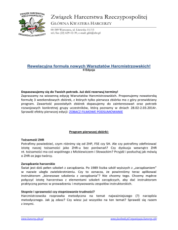 Związek Harcerstwa Rzeczypospolitej GŁÓWNA KWATERA HARCERZY 00-589 Warszawa, ul. Litewska 11/13 tel./fax (22) 629-12-39, e-mail: [email protected] Rewelacyjna formuła nowych Warsztatów Harcmistrzowskich! II Edycja Dopasowujemy się do Twoich potrzeb. Już dziś rezerwuj terminy! Zapraszamy na wiosenną edycję Warsztatów Harcmistrzowskich. Proponujemy nowatorską formułę 3 weekendowych zbiórek, z których tylko pierwsza zbiórka ma z góry przewidziany program. Zawartość pozostałych zbiórek dopasujemy do zainteresowań oraz potrzeb rozwojowych konkretnej grupy uczestników, którą poznamy w dniach 28.02-2.03.2014r. Sprawdź efekty pierwszej edycji: ZOBACZ FILMOWE PODSUMOWANIE Program pierwszej zbiórki: Tożsamość ZHR Potrafimy powiedzieć, czym różnimy się od ZHP, FSE czy SH. Ale czy potrafimy zdefiniować istotę naszej tożsamości jako ZHR-u bez porównań? Czy dyskusja wewnątrz ZHR nt. tożsamości ma coś wspólnego z Mickiewiczem i Słowackim? Przyjdź i posłuchaj jak mówią o ZHR-ze jego twórcy. Zarządzanie harcerskie Świat jest dziś pełen szkoleń z zarządzania. Po 1989 liczba szkół wyższych z „zarządzaniem” w nazwie uległa zwielokrotnieniu. Czy to oznacza, że powinniśmy teraz aplikować instruktorom „biznesowe szkolenia z zarządzania”? Nie chcemy tego. Chcemy mądrze połączyć istotę harcerstwa z elementami szkoleń zarządczych, aby dać instruktorom praktyczną pomoc w prowadzeniu i motywowaniu zespołów instruktorskich. Stopnie i sprawności czy stopniowanie trudności? Harcmistrzowska rozprawka metodyczna na temat najważniejszego (?) narzędzia metodycznego. Jak ją zdasz? Czy wiesz już wszystko na ten temat? Sprawdź się razem z innymi. www.harcerze.zhr.pl www.facebook.pl/organizacja.harcerzy.zhr Nowe metody ewangelizacji Z jednej strony jesteśmy częścią Kościoła i obserwujemy zmiany, które w nich zachodzą. Kościół dostosowuje się w formach do wyzwań XXI wieku. Czy my rozumiemy te zmiany? Czy wiemy na czym one polegają? Czy potrafimy wyciągać analogiczne wnioski dla harcerstwa w XXI wieku? Post-postmodernizm Postmodernizm to już historia. Przyspieszenie w rozwoju społeczeństw jest tak duże, że dziś socjologowie mówią już o post-postmodernizmie. Fachowo powiemy Ci o tym, co dziś dzieje się wokół Ciebie w społeczeństwie. Nauczymy Cię identyfikować zjawiska, zachowania procesy w społeczeństwie XXI wieku. Na bazie badań i wiedzy polskich naukowców metodycznie spróbujemy zbudować programową odpowiedź na te zjawiska. Co więcej: zweryfikujemy ją w praktyce. Ciekawe jak… Dawka atrakcyjnej kultury Obejrzymy razem film lub spektakl, a potem podyskutujemy o roli tego filmu w dzisiejszym świecie. Czy ten film to prowokacja, czy niesie ze sobą jednak jakieś przesłanie? Czy chcesz zobaczyć jak można zorganizować DKF z prawdziwego zdarzenia? Wyzwania obozowania Co roku jedziemy na obóz. Jak co roku trzeba zbilansować budżet, zebrać kadrę, znaleźć miejsce, przygotować sprzęt, zdobyć niezbędne zgody, napisać plan: kwaterka, wyjazd, prace pionierskie, wędrówki, sprawności puszczańskie, grafik służb, ogniska, harce, biegi, przyrzeczenia, stopnie i sprawności, Trzy pióra, depionierka, powrót… Rozliczenie. Ale czy potrafimy radzić sobie z nowymi wyzwaniami? Trzech komendantów i dwóch kwatermistrzów na jednym obozie – niestety nie można całego urlopu poświęcić dla harcerstwa. Kadra musi płacić – mimo że to ciężka 24 godzinna służba – np. opiekunowie szóstek na Kolonii. Stary i przegniły sprzęt – można napisać taki budżet, by po akcji kupić np. dwa duże namioty. Czy musimy co roku „jechać na obóz”? Co w dobie tabletów, komórek i google.maps jest istotą dzisiejszego obozowania? Czy jesteś na tyle sprawny, aby chronić Prezydenta? Nie chcemy, aby harcmistrz oznaczał w języku młodych harcerzy „pan z brzuszkiem w mundurze”. W związku z tym chcemy zaproponować Ci test sprawnościowy oraz program rozwojowy, który umożliwi Ci dostanie się do Biura Ochrony Rządu. Nie narzekaj, że „młodzież siedzi dziś przed komputerem”. Pokaż chłopakom w swoim środowisku, że w razie czego nadal możesz dać im łupnia. Przykład własny? - gdzieś to słyszałem… Jeśli chcesz dowiedzieć się o innych tematach, które przewidujemy na następne zbiórki napisz. Odpowiemy na wszystkie pytania albo podamy namiary na osoby z Twojego otoczenia, które brały udział. One szczerze powiedzą Ci, czy warto do nas dołączyć. www.harcerze.zhr.pl www.facebook.pl/organizacja.harcerzy.zhr Formuła warsztatów 1) Każde zajęcia będą rozpoczynały się od przekazania konkretnej dawki wiedzy czy umiejętności. Dyskusja jest tylko sposobem pogłębienia zrozumienia. A końcowym elementem będą zadania wdrożeniowe. Podstawa to jednak solidna dawka wiedzy od eksperta. Jeśli mamy takiego w naszych szeregach, to wykorzystamy. Jeśli nie, zaprosimy ludzi z zewnątrz: naukowców, urzędników, polityków, dziennikarzy, biskupów, trenerów sportowych itp. A kogo Ty chciałbyś widzieć w roli eksperta? 2) „Rzeczywiście tak jak księżyc, ludzie znają Cię tylko z jednej… jesiennej [harcerskiej] strony.” Warsztaty to czas na spotkanie i poznanie innych ludzi. Skauting to ponoć największa „mafia przyjaciół” na świecie. Chcemy to realizować w ramach naszych warsztatów. W związku z tym chcemy odwiedzać domy naszych harcmistrzów. Zjedz z nim śniadanie, poznaj jego dzieci, zobacz czyje zdjęcia wiszą u niego na ścianie, zobacz, jakie książki przeważają u niego w bibliotece, podyskutuj o tematach z warsztatów. A może on też weźmie w nich udział? Zanosimy braterstwo pod nasze strzechy. 3) Dla kogo warsztaty? a. Podharcmistrzowie, którzy myślą o rozwoju b. Podharcmistrzowie z otwartymi próbami na harcmistrza c. Harcmistrzowie, którzy nie brali udziału w warsztatach na tym poziomie 4) Chcemy rozwijać instruktor