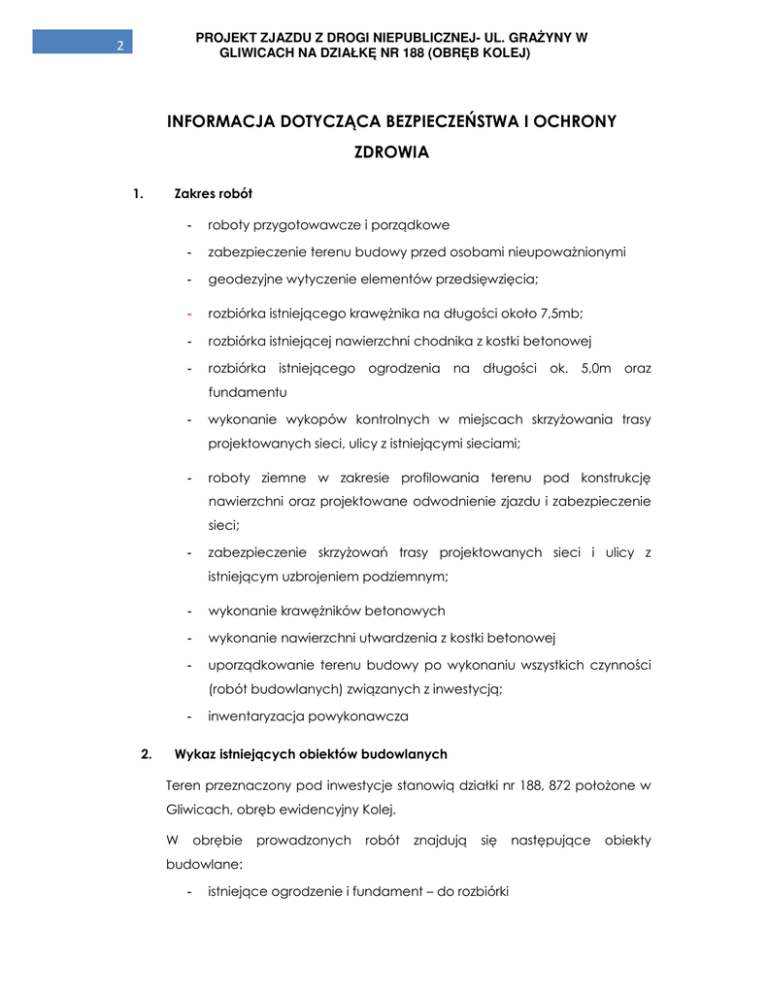 PROJEKT ZJAZDU Z DROGI NIEPUBLICZNEJ- UL. GRAŻYNY W GLIWICACH NA DZIAŁKĘ NR 188 (OBRĘB KOLEJ) 2 INFORMACJA DOTYCZĄCA BEZPIECZEŃSTWA I OCHRONY ZDROWIA 1. Zakres robót - roboty przygotowawcze i porządkowe - zabezpieczenie terenu budowy przed osobami nieupowaŜnionymi - geodezyjne wytyczenie elementów przedsięwzięcia; - rozbiórka istniejącego krawęŜnika na długości około 7,5mb; - rozbiórka istniejącej nawierzchni chodnika z kostki betonowej - rozbiórka istniejącego ogrodzenia na długości ok. 5,0m oraz fundamentu - wykonanie wykopów kontrolnych w miejscach skrzyŜowania trasy projektowanych sieci, ulicy z istniejącymi sieciami; - roboty ziemne w zakresie profilowania terenu pod konstrukcję nawierzchni oraz projektowane odwodnienie zjazdu i zabezpieczenie sieci; - zabezpieczenie skrzyŜowań trasy projektowanych sieci i ulicy z istniejącym uzbrojeniem podziemnym; - wykonanie krawęŜników betonowych - wykonanie nawierzchni utwardzenia z kostki betonowej - uporządkowanie terenu budowy po wykonaniu wszystkich czynności (robót budowlanych) związanych z inwestycją; 2. inwentaryzacja powykonawcza Wykaz istniejących obiektów budowlanych Teren przeznaczony pod inwestycje stanowią działki nr 188, 872 połoŜone w Gliwicach, obręb ewidencyjny Kolej. W obrębie prowadzonych robót znajdują się budowlane: - istniejące ogrodzenie i fundament – do rozbiórki następujące obiekty PROJEKT ZJAZDU Z DROGI NIEPUBLICZNEJ- UL. GRAŻYNY W GLIWICACH NA DZIAŁKĘ NR 188 (OBRĘB KOLEJ) 3 3. - budowa kanalizacji - istniejący gazociąg – do zabezpieczenia - istniejące instalacje elektryczne – do zabezpieczenia - istniejąca teletechnika– do zabezpieczenia Wskazanie elementów zagospodarowania mogących stwarzać zagroŜenie Na działce Gestora drogi występują elementy mogące stwarzać zagroŜenie bezpieczeństwa i zdrowia ludzi: • pojazdy na ul. GraŜyny; • budowa projektowanego obiektu - drogi gminnej; • istniejące uzbrojenie terenu (sieć gazowa, teletechniczna, elektroenergetyczna, kanalizacja). 4. Wskazanie dotyczące przewidywanych zagroŜeń występujących podczas realizacji robót budowlanych - Wykonywanie robót ziemnych i drogowych sprzętem mechanicznym w bezpośredniej strefie ruchu drogowego pieszego i samochodowego - wykonywanie wykopów, roboty w wykopach – moŜliwość zasypania pracowników w wyniku zawalenia się ścian wykopu; - wpadnięcie do wykopu (obsunięcie się ziemi z krawędzi wykopu lub poślizgnięcie się); - uderzenie pracownika w wykopie spadającą bryłą ziemi, kamieniem lub innym przedmiotem; - obsunięcie skarpy nasypu, upadek z wysokości ponad 0,5m; Roboty w rejonie istniejącego uzbrojenia prowadzić ze szczególną ostroŜności, w razie jakichkolwiek wątpliwości skontaktować się z dysponentami sieci lub projektantem. PROJEKT ZJAZDU Z DROGI NIEPUBLICZNEJ- UL. GRAŻYNY W GLIWICACH NA DZIAŁKĘ NR 188 (OBRĘB KOLEJ) 4 5. Wskazanie sposobu prowadzenia instruktaŜu pracowników przed przystąpieniem do realizacji robót szczególnie niebezpiecznych - oznakować i zabezpieczyć teren przed dostępem osób postronnych w tym zabezpieczyć przejścia i przejazdy dla mieszkańców terenów przyległych; - Wykonawca sprowadzi na budowę odpowiednie zabezpieczenia i rusztowanie - wykonać umocnienie ścian wykopów (typ konstrukcji dostosować do głębokości, rodzaju gruntu, czasu utrzymania wykopu, obciąŜeń transportem, składowaniem materiałów i innych obciąŜeń w sąsiedztwie wykopów); - Pracowników naleŜy wyposaŜyć w środki ochrony osobistej - Przeprowadzić instruktaŜ na temat pierwszej pomocy oraz wyposaŜyć budowę w środki do jej udzielenia - Pracownicy obsługujący urządzenia powinni być przeszkoleni posiadać instrukcję obsługi maszyn - NaleŜy ustalić strefę niebezpieczną pracy sprzętu i odpowiednio ja oznakować - Pracownicy obsługujący urządzenia techniczne musza posiadać odpowiednie kwalifikacje do obsługi i konserwacji sprzętu - zadbać o dobrą komunikację na terenie budowy (wyznaczenie dojścia pracowników, dostawy i miejsca składowania materiałów budowlanych, zejścia do wykopów oraz uwzględnić moŜliwość ewentualnej ewakuacji osób zagroŜonych lub poszkodowanych); - naleŜy zapewnić stały dostęp pracowników do telefonu alarmowego, wykazu numerów telefonów i adresów najbliŜszego punktu opieki lekarskiej, straŜy poŜarnej, policji, a takŜe apteczki; - na budowie powinny znajdować się podręczne środki gaśnicze (gaśnice proszkowe, węŜe gaśnicze, hydranty, koce gaśnicze itp.). PROJEKT ZJAZDU Z DROGI NIEPUBLICZNEJ- UL. GRAŻYNY W GLIWICACH NA DZIAŁKĘ NR 188 (OBRĘB KOLEJ) 5 6. Wskazanie środków technicznych i organizacyjnych, zapobiegających niebezpieczeństwom wynikającym z wykonania robót budowlanych Roboty nawierzchniowe w sąsiedztwie jezdni ul. GraŜyny naleŜy oznakować zgodnie z instrukcją oznakowania i zabezpieczenia robót prowadzonych w pasie drogowym oraz wyposaŜyć pracowników w kamizelki ostrzegawcze. Uwaga! Wymienione roboty naleŜy wykonywać przez wykwalifikowany personel i pod nadzorem osób posiadających odpowiednie kwalifikacje i uprawnienia budowlane, z zachowaniem odpowiednich przepisów budowy oraz przepisów i instrukcji bezpieczeństwa pracy przy wykonywaniu robót budowlanych i remontowych. Osoba będąca autorem planu BIOZ opracowanego na podstawie niniejszej „Informacji dotyczącej Bezpieczeństwa i Ochrony Zdrowia” powinna zweryfikować listę rodzajów robót budowlanych w oparciu o zakładany harmonogram prowadzenia robót i potwierdzić lub wykluczyć zaistnienie wymienionych zagroŜeń, a takŜe uzupełnić powyŜsze informacje o niewymienione zagroŜenia przewidywane przez nadzór budowy. Materiały uŜyte do prac winny odpowiadać wymaganiom ochrony p.poz., posiadać aktualne świadectwa dopuszczenia lub aprobaty I.T.B. i C.N.B.O.P. W trakcie robót ziemnych i na wysokości- zachować szczególn