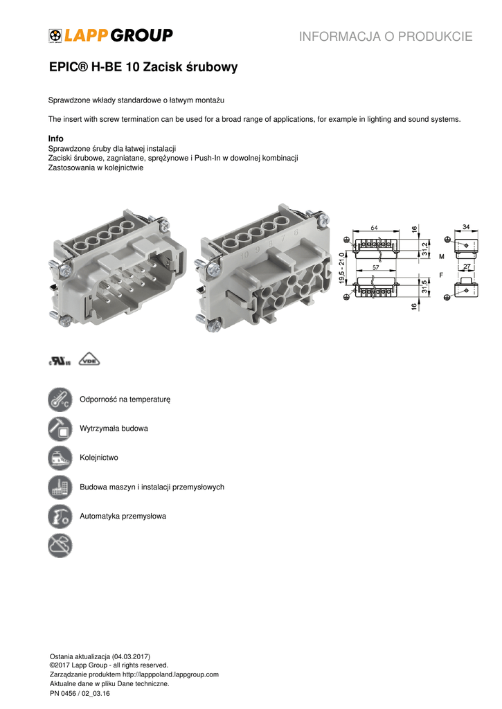 INFORMACJA O PRODUKCIE EPIC® H-BE 10 Zacisk śrubowy Sprawdzone wkłady standardowe o łatwym montażu The insert with screw termination can be used for a broad range of applications, for example in lighting and sound systems. Info Sprawdzone śruby dla łatwej instalacji Zaciski śrubowe, zagniatane, sprężynowe i Push-In w dowolnej kombinacji Zastosowania w kolejnictwie Odporność na temperaturę Wytrzymała budowa Kolejnictwo Budowa maszyn i instalacji przemysłowych Automatyka przemysłowa Ostania aktualizacja (04.03.2017) ©2017 Lapp Group - all rights reserved. Zarządzanie produktem http://lapppoland.lappgroup.com Aktualne dane w pliku Dane techniczne. PN 0456 / 02_03.16 INFORMACJA O PRODUKCIE EPIC® H-BE 10 Zacisk śrubowy Korzyści Standardowe wkłady z zaciskami śrubowymi, zagniatanymi, sprężynowymi i Push-In Sprawdzoną serię EPIC® H-BE wyróżniają: możliwość zastosowania w instalacjach o podwyższonym napięciu oraz wysoki stopień niezawodności Zastosowania w kolejnictwie - Ochrona przeciwpożarowa pojazdów kolejowych: Test według EN 45545-2. Zestawy wymagań R22 i R23. Poziomy zagrożenia HL1, HL2 i HL4 Testy zastosowania wg UL w szafach sterowniczych zgodnie z UL 508 / UL 2237 Zakres zastosowania Budowa maszyn Przemysł tworzyw sztucznych Instalacje estradowe Zastosowanie w kolejnictwie/budowa pojazdów Dane techniczne Klasyfikacja: ETIM 5.0 Class-ID: EC000438 Opis klasy ETIM 5.0: Wkład stykowy do złącz przemysłowych Napięcie pracy: IEC: 500 VUL: 600 VCSA: 600 V Napięcie impulsowe: 6 kV Prąd roboczy: IEC: 16 A UL: 16 A CSA: 16 A Stopień zanieczyszczenia: 3 Flammability: UL94 V-0 Rezystancja styków: < 2 mOm Styki: Stop miedzi, twardy, srebrzony Liczba styków: 10 + PE Podłączanie żyły: Zacisk śrubowy: 0,5–2,5 mm² Długość odizolowania żyły [mm]: 8 Materiał: PC: poliwęglan Liczba operacji załącz/rozłącz: 100 Certyfikaty: Certyfikowana kontrola produkcji: Nr ewid. VDE: B437 Testy UL: Nr akt UL: E75770 i E483837 Zakres temperatury: -40°C do +100°C, krótkotrwale do +125°C Wskazówka Fotografie nie mogą być używane do wymiarowania oraz nie stanowią szczegółowego odwzorowania przedstawionych produktów. * Podane ceny to ceny netto bez podatku VAT i dodatkowych opłat. Sprzedaż klientom biznesowym. Ostania aktualizacja (04.03.2017) ©2017 Lapp Group - all rights reserved. Zarządzanie produktem http://lapppoland.lappgroup.com Aktualne dane w pliku Dane techniczne. PN 0456 / 02_03.16 Powered by TCPDF (www.tcpdf.org) Opis produktu Typ styku Ochrona żyły giętkiej, wielodrutowej Liczba styków roboczych 10192000 EPIC® H-BE 10 SS Męski Tak 1 - 10 10193000 EPIC® H-BE 10 BS Żeński Tak 1 - 10 H-BE 10 Zacisk śrubowy ® 10192100 EPIC H-BE 10 SS Męski 1 - 10 10193100 EPIC® H-BE 10 BS Żeński 1 - 10 EPIC® H-BE 10 Zacisk śrubowy Ostania aktualizacja (04.03.2017) ©2017 Lapp Group - all rights reserved. Zarządzanie produktem http://lapppoland.lappgroup.com Aktualne dane w pliku Dane techniczne. PN 0456 / 02_03.16 INFORMACJA O PRODUKCIE Powered by TCPDF (www.tcpdf.org) Numer katalogowy