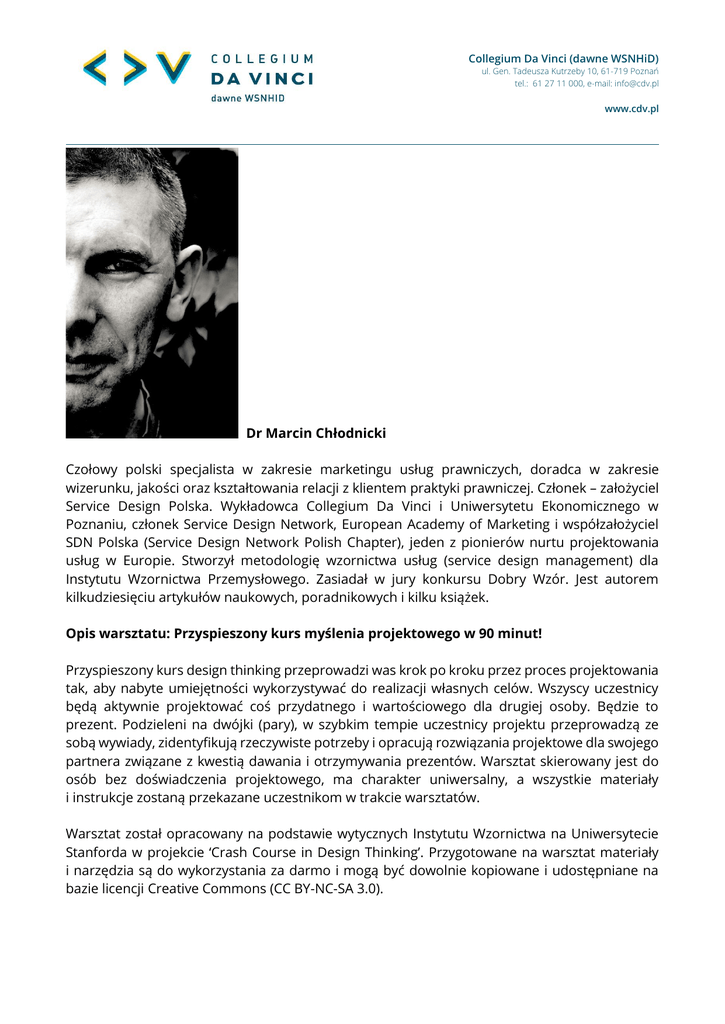 Collegium Da Vinci (dawne WSNHiD) ul. Gen. Tadeusza Kutrzeby 10, 61-719 Poznań tel.: 61 27 11 000, e-mail: [email protected] www.cdv.pl Dr Marcin Chłodnicki Czołowy polski specjalista w zakresie marketingu usług prawniczych, doradca w zakresie wizerunku, jakości oraz kształtowania relacji z klientem praktyki prawniczej. Członek – założyciel Service Design Polska. Wykładowca Collegium Da Vinci i Uniwersytetu Ekonomicznego w Poznaniu, członek Service Design Network, European Academy of Marketing i współzałożyciel SDN Polska (Service Design Network Polish Chapter), jeden z pionierów nurtu projektowania usług w Europie. Stworzył metodologię wzornictwa usług (service design management) dla Instytutu Wzornictwa Przemysłowego. Zasiadał w jury konkursu Dobry Wzór. Jest autorem kilkudziesięciu artykułów naukowych, poradnikowych i kilku książek. Opis warsztatu: Przyspieszony kurs myślenia projektowego w 90 minut! Przyspieszony kurs design thinking przeprowadzi was krok po kroku przez proces projektowania tak, aby nabyte umiejętności wykorzystywać do realizacji własnych celów. Wszyscy uczestnicy będą aktywnie projektować coś przydatnego i wartościowego dla drugiej osoby. Będzie to prezent. Podzieleni na dwójki (pary), w szybkim tempie uczestnicy projektu przeprowadzą ze sobą wywiady, zidentyfikują rzeczywiste potrzeby i opracują rozwiązania projektowe dla swojego partnera związane z kwestią dawania i otrzymywania prezentów. Warsztat skierowany jest do osób bez doświadczenia projektowego, ma charakter uniwersalny, a wszystkie materiały i instrukcje zostaną przekazane uczestnikom w trakcie warsztatów. Warsztat został opracowany na podstawie wytycznych Instytutu Wzornictwa na Uniwersytecie Stanforda w projekcie ‘Crash Course in Design Thinking’. Przygotowane na warsztat materiały i narzędzia są do wykorzystania za darmo i mogą być dowolnie kopiowane i udostępniane na bazie licencji Creative Commons (CC BY-NC-SA 3.0).