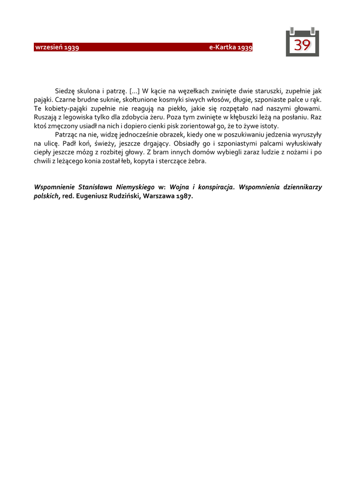 wrzesień 1939 e-Kartka 1939 Siedzę skulona i patrzę. [...] W kącie na węzełkach zwinięte dwie staruszki, zupełnie jak pająki. Czarne brudne suknie, skołtunione kosmyki siwych włosów, długie, szponiaste palce u rąk. Te kobiety-pająki zupełnie nie reagują na piekło, jakie się rozpętało nad naszymi głowami. Ruszają z legowiska tylko dla zdobycia żeru. Poza tym zwinięte w kłębuszki leżą na posłaniu. Raz ktoś zmęczony usiadł na nich i dopiero cienki pisk zorientował go, że to żywe istoty. Patrząc na nie, widzę jednocześnie obrazek, kiedy one w poszukiwaniu jedzenia wyruszyły na ulicę. Padł koń, świeży, jeszcze drgający. Obsiadły go i szponiastymi palcami wyłuskiwały ciepły jeszcze mózg z rozbitej głowy. Z bram innych domów wybiegli zaraz ludzie z nożami i po chwili z leżącego konia został łeb, kopyta i sterczące żebra. Wspomnienie Stanisława Niemyskiego w: Wojna i konspiracja. Wspomnienia dziennikarzy polskich, red. Eugeniusz Rudziński, Warszawa 1987.