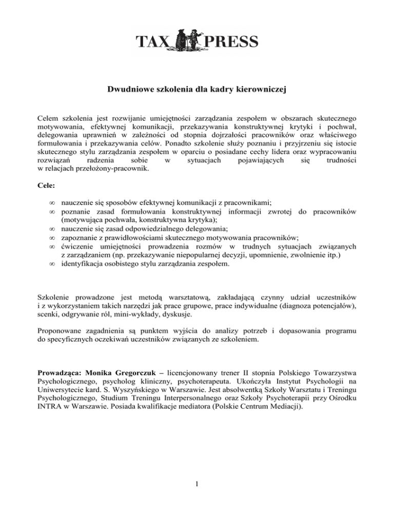 Dwudniowe szkolenia dla kadry kierowniczej Celem szkolenia jest rozwijanie umiejętności zarządzania zespołem w obszarach skutecznego motywowania, efektywnej komunikacji, przekazywania konstruktywnej krytyki i pochwał, delegowania uprawnień w zależności od stopnia dojrzałości pracowników oraz właściwego formułowania i przekazywania celów. Ponadto szkolenie służy poznaniu i przyjrzeniu się istocie skutecznego stylu zarządzania zespołem w oparciu o posiadane cechy lidera oraz wypracowaniu rozwiązań radzenia sobie w sytuacjach pojawiających się trudności w relacjach przełożony-pracownik. Cele: • • • • • • nauczenie się sposobów efektywnej komunikacji z pracownikami; poznanie zasad formułowania konstruktywnej informacji zwrotej do pracowników (motywująca pochwała, konstruktywna krytyka); nauczenie się zasad odpowiedzialnego delegowania; zapoznanie z prawidłowościami skutecznego motywowania pracowników; ćwiczenie umiejętności prowadzenia rozmów w trudnych sytuacjach związanych z zarządzaniem (np. przekazywanie niepopularnej decyzji, upomnienie, zwolnienie itp.) identyfikacja osobistego stylu zarządzania zespołem. Szkolenie prowadzone jest metodą warsztatową, zakładającą czynny udział uczestników i z wykorzystaniem takich narzędzi jak prace grupowe, prace indywidualne (diagnoza potencjałów), scenki, odgrywanie ról, mini-wykłady, dyskusje. Proponowane zagadnienia są punktem wyjścia do analizy potrzeb i dopasowania programu do specyficznych oczekiwań uczestników związanych ze szkoleniem. Prowadząca: Monika Gregorczuk – licencjonowany trener II stopnia Polskiego Towarzystwa Psychologicznego, psycholog kliniczny, psychoterapeuta. Ukończyła Instytut Psychologii na Uniwersytecie kard. S. Wyszyńskiego w Warszawie. Jest absolwentką Szkoły Warsztatu i Treningu Psychologicznego, Studium Treningu Interpersonalnego oraz Szkoły Psychoterapii przy Ośrodku INTRA w Warszawie. Posiada kwalifikacje mediatora (Polskie Centrum Mediacji). 1 Efektywne zarządzanie Cel ogólny szkolenia: Zwiększenie kluczowych dla pracy kierowniczej umiejętności komunikacyjnych. Ramowy plan szkolenia: 1. Szef – specjalista od zarządzania • • • ludzie wartością organizacji; przywódca – podstawowe umiejętności interpersonalne efektywnego lidera; komunikacyjne kompetencje a budowanie wartości organizacji. 2. Narzędzia efektywnej komunikacji • • komunikacja niewerbalna – siła przekazu; komunikacja niewerbalna (aktywne słuchanie, pytania, parafrazy i klaryfikacje) 3. Konstruktywna informacja zwrotna • • • język faktów, uczuć i działań – mówienie od „ja”; skuteczna krytyka – wartość i cel; konstruktywna pochwała – skuteczne narzędzie wpływu. 4. Asertywność – postawa i umiejętności. • • • • fakty i mity o asertywności; asertywność jako postawa; asertywność w pracy managera – podstawowe obszary; autodiagnoza umiejętności asertywnych – mapa asertywności. 5. (Nie) trudne rozmowy • • planowanie i prowadzenie profesjonalnych rozmów z podwładnymi; motywowanie, ocena. monitoring, niepopularne decyzje…itd. 6. Różne zdania – jedna decyzja. • • • • negocjować czy rozkazywać? asertywna konfrontacja opinii; prośby i polecenia służbowe; zarządzanie konfliktem. 7. Od teorii do praktyki. • planowanie zmiany – wykorzystanie poznanych umiejętności w codziennej pracy (wskazówki) 2 Ramowy plan szkolenia nr 2 1. Szef ma zawsze rację...? • autodiagniza stylu zarządzania; • zarządzanie ludźmi – styl a człowiek; • podstawowe zadania kierownika/menadżera w zarządzaniu; • efektywny lider. 2. Zespół ma moc...? • grupa a zespół – etapy rozwoju zespołu; • od rywalizacji do współpracy – budowanie efektywnego zespołu; • relacje i więzi – komunikacja w zespole; • zagrożenia pracy zespołowej. 3. (Za)ufanie...? • strefa delegowania zadań; • monitoring działań i rozmowy oceniające jako elementy kierownia zespołem; • stawianie celów do realizacji; • coaching jako droga do rozwoju pracownika. 4. Motywowanie jest możliwe...? • teorie motywacji i idea motywowania; • dobre słowa – dobre narz edzia; • kłopoty z nagradzeniem. 5. Ludzie, problemy...rozwiązania? • postawa asertywna w zarządzniau; • przekazywanie trudnych decyzji; • niepopoluarne odmawianie; • asertywna krytyka; • stawianie granic i karanie. OŚRODEK SZKOLENIOWY WYDAWNICTWA TAXPRESS 04-028 Warszawa, Al. Stanów Zjednoczonych 51 lok.517 fax 22-44-87-122, 22 51-77-707, tel. 22 51-77-800 , 22 31-02-800 www.taxpress.com.pl 3