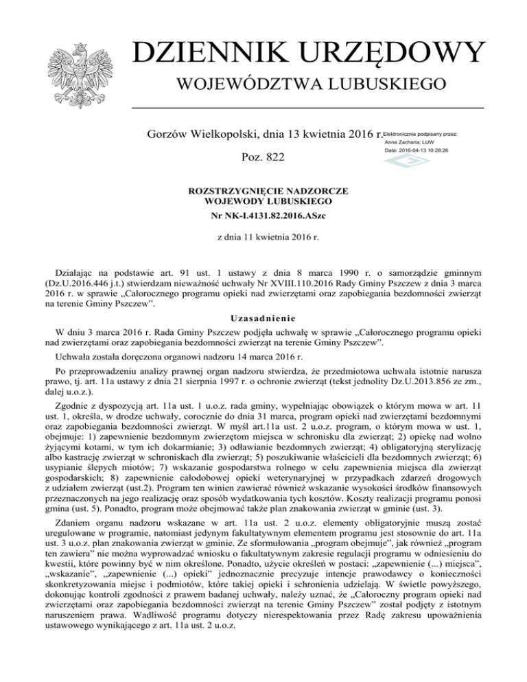 DZIENNIK URZĘDOWY WOJEWÓDZTWA LUBUSKIEGO Gorzów Wielkopolski, dnia 13 kwietnia 2016 r.Elektronicznie podpisany przez: Anna Zacharia; LUW Poz. 822 Data: 2016-04-13 10:28:26 ROZSTRZYGNIĘCIE NADZORCZE WOJEWODY LUBUSKIEGO Nr NK-I.4131.82.2016.ASzc z dnia 11 kwietnia 2016 r. Działając na podstawie art. 91 ust. 1 ustawy z dnia 8 marca 1990 r. o samorządzie gminnym (Dz.U.2016.446 j.t.) stwierdzam nieważność uchwały Nr XVIII.110.2016 Rady Gminy Pszczew z dnia 3 marca 2016 r. w sprawie „Całorocznego programu opieki nad zwierzętami oraz zapobiegania bezdomności zwierząt na terenie Gminy Pszczew”. Uzasadnienie W dniu 3 marca 2016 r. Rada Gminy Pszczew podjęła uchwałę w sprawie „Całorocznego programu opieki nad zwierzętami oraz zapobiegania bezdomności zwierząt na terenie Gminy Pszczew”. Uchwała została doręczona organowi nadzoru 14 marca 2016 r. Po przeprowadzeniu analizy prawnej organ nadzoru stwierdza, że przedmiotowa uchwała istotnie narusza prawo, tj. art. 11a ustawy z dnia 21 sierpnia 1997 r. o ochronie zwierząt (tekst jednolity Dz.U.2013.856 ze zm., dalej u.o.z.). Zgodnie z dyspozycją art. 11a ust. 1 u.o.z. rada gminy, wypełniając obowiązek o którym mowa w art. 11 ust. 1, określa, w drodze uchwały, corocznie do dnia 31 marca, program opieki nad zwierzętami bezdomnymi oraz zapobiegania bezdomności zwierząt. W myśl art.11a ust. 2 u.o.z. program, o którym mowa w ust. 1, obejmuje: 1) zapewnienie bezdomnym zwierzętom miejsca w schronisku dla zwierząt; 2) opiekę nad wolno żyjącymi kotami, w tym ich dokarmianie; 3) odławianie bezdomnych zwierząt; 4) obligatoryjną sterylizację albo kastrację zwierząt w schroniskach dla zwierząt; 5) poszukiwanie właścicieli dla bezdomnych zwierząt; 6) usypianie ślepych miotów; 7) wskazanie gospodarstwa rolnego w celu zapewnienia miejsca dla zwierząt gospodarskich; 8) zapewnienie całodobowej opieki weterynaryjnej w przypadkach zdarzeń drogowych z udziałem zwierząt (ust.2). Program ten winien zawierać również wskazanie wysokości środków finansowych przeznaczonych na jego realizację oraz sposób wydatkowania tych kosztów. Koszty realizacji programu ponosi gmina (ust. 5). Ponadto, program może obejmować także plan znakowania zwierząt w gminie (ust. 3). Zdaniem organu nadzoru wskazane w art. 11a ust. 2 u.o.z. elementy obligatoryjnie muszą zostać uregulowane w programie, natomiast jedynym fakultatywnym elementem programu jest stosownie do art. 11a ust. 3 u.o.z. plan znakowania zwierząt w gminie. Ze sformułowania „program obejmuje”, jak również „program ten zawiera” nie można wyprowadzać wniosku o fakultatywnym zakresie regulacji programu w odniesieniu do kwestii, które powinny być w nim określone. Ponadto, użycie określeń w postaci: „zapewnienie (...) miejsca”, „wskazanie”, „zapewnienie (...) opieki” jednoznacznie precyzuje intencje prawodawcy o konieczności skonkretyzowania miejsc i podmiotów, które takiej opieki i schronienia udzielają. W świetle powyższego, dokonując kontroli zgodności z prawem badanej uchwały, należy uznać, że „Całoroczny program opieki nad zwierzętami oraz zapobiegania bezdomności zwierząt na terenie Gminy Pszczew” został podjęty z istotnym naruszeniem prawa. Wadliwość programu dotyczy nierespektowania przez Radę zakresu upoważnienia ustawowego wynikającego z art. 11a ust. 2 u.o.z. Dziennik Urzędowy Województwa Lubuskiego –2– Poz. 822 Analiza treści przedmiotowej uchwały prowadzi do wniosku, że Rada pominęła obligatoryjny element programu, jakim jest zgodnie z art. 11a ust. 2 pkt 1 u.o.z. zapewnienie bezdomnym zwierzętom miejsca w schronisku dla zwierząt. W § 12 uchwały Rada postanowiła tylko, że wyłapane bezdomne zwierzęta (psy) przed przewiezieniem do Schroniska mogą być tymczasowo przetrzymywane w Przytułku dla bezpańskich psów zlokalizowanym na oczyszczalni ścieków w Pszczewie. Organ nadzoru zwraca jednak uwagę, że na gminie ciąży ustawowy obowiązek zapewnienia bezdomnym zwierzętom miejsca w schronisku, tj. zgodnie z art. 4 pkt 25 u.o.z. w miejscu przeznaczonym do opieki nad zwierzętami domowymi, spełniającym warunki określone w ustawie z dnia 11 marca 2004 r. o ochronie zdrowia zwierząt oraz zwalczaniu chorób zakaźnych zwierząt (Dz.U.2014.1539 j.t. ze zm.). Wskazanie jakiegokolwiek innego miejsca, niezależnie od jego nazwy, nie będzie mogło zostać uznane za wypełnienie przez Radę delegacji ustawowej, wynikającej z art. 11a u.o.z. Jednocześnie organ nadzoru zwraca uwagę, że gmina ma obowiązek zapewnić miejsce w schronisku dla zwierząt bezdomnym zwierzętom, a nie tylko bezdomnym psom. Dla skutecznej realizacji ustawowego obowiązku ciążącego na gminie w ww. zakresie, niezbędne jest zapewnienie bezdomnym zwierzętom miejsca w schronisku dla zwierząt, przy czym Rada powinna w uchwale podać zarówno nazwę, jak i adres schroniska. Organ nadzoru zwraca bowiem uwagę, że powyższy obowiązek należy interpretować ściśle w powiązaniu z art. 11 ust. 3 u.o.z. oraz przepisami rozporządzenia Ministra Spraw Wewnętrznych i Administracji z 26 sierpnia 1998 r. w sprawie zasad i warunków wyłapywania bezdomnych zwierząt (Dz.U.1998.116.753). Zgodnie z art.11 ust. 3 u.o.z zabrania się odławiania zwierząt bezdomnych bez zapewnienia im miejsca w schronisku dla zwierząt, chyba że zwierzę stwarza zagrożenie dla ludzi lub innych zwierząt. Odławianie bezdomnych zwierząt odbywa się wyłącznie na podstawie uchwały rady gminy, o której mowa w art. 11a. Natomiast, w myśl § 3 ww. rozporządzenia, organ gminy zobowiązany jest podać do publicznej wiadomości m.in. adres schroniska, z którym uzgodniono umieszczenie zwierząt po wyłapaniu. W tym miejscu zauważyć należy, że podanie dokładnego adresu schroniska oprócz tego, że stanowi wypełnienie nałożonego przez prawodawcę obowiązku, odgrywa w praktyce istotną rolę informacyjną. Pozwala o