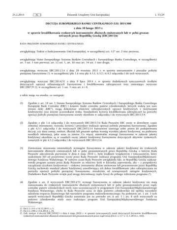 25.2.2015 Dziennik Urzędowy Unii Europejskiej PL L 53/29 DECYZJA EUROPEJSKIEGO BANKU CENTRALNEGO (UE) 2015/300 z dnia 10 lutego 2015 r. w sprawie kwalifikowania rynkowych instrumentów dłużnych emitowanych lub w pełni gwaran towanych przez Republikę Grecką (EBC/2015/6) RADA PREZESÓW EUROPEJSKIEGO BANKU CENTRALNEGO, uwzględniając Traktat o funkcjonowaniu Unii Europejskiej, w szczególności art. 127 ust. 2 tiret pierwsze, uwzględniając Statut Europejskiego Systemu Banków Centralnych i Europejskiego Banku Centralnego, w szczególności art. 3 ust. 1 tiret pierwsze, art. 12 ust. 1, art. 18 oraz art. 34 ust. 1 tiret drugie, uwzględniając wytyczne EBC/2011/14 z dnia 20 września 2011 r. w sprawie instrumentów i procedur polityki pieniężnej Eurosystemu (1), w szczególności pkt 1.6 oraz pkt 6.3.1, 6.3.2 i 6.4.2 załącznika I do tych wytycznych, uwzględniając wytyczne EBC/2014/31 z dnia 9 lipca 2014 r. w sprawie dodatkowych tymczasowych środków dotyczących operacji refinansujących Eurosystemu i kwalifikowania zabezpieczeń oraz zmieniające wytyczne EBC/2007/9 (2), w szczególności art. 1 ust. 3 oraz art. 6 i 8, a także mając na uwadze, co następuje: (1) Zgodnie z art. 18 ust. 1 Statutu Europejskiego Systemu Banków Centralnych i Europejskiego Banku Centralnego Europejski Bank Centralny (EBC) i krajowe banki centralne państw członkowskich, których walutą jest euro (zwane dalej „KBC”), mogą dokonywać właściwie zabezpieczonych operacji kredytowych z instytucjami kredytowymi oraz innymi uczestnikami rynku. Standardowe kryteria kwalifikowania zabezpieczeń na potrzeby operacji polityki pieniężnej Eurosystemu zostały określone w załączniku I do wytycznych EBC/2011/14. (2) Zgodnie z pkt 1.6 załącznika I do wytycznych EBC/2011/14 Rada Prezesów EBC może w dowolnym czasie zmieniać instrumenty, warunki, kryteria i procedury realizacji operacji polityki pieniężnej Eurosystemu. Zgodnie z pkt 6.3.1 załącznika I do wytycznych EBC/2011/14 Eurosystem zastrzega sobie prawo do podejmowania decyzji, czy dana emisja, emitent, dłużnik lub gwarant spełnia wymóg wysokiej jakości kredytowej, na podstawie wszelkich informacji, jakie uzna za istotne. Co więcej, minimalne wymogi Eurosystemu w zakresie jakości kredytowej określone są w zasadach oceny jakości kredytowej Eurosystemu dotyczących aktywów rynkowych, zawartych w pkt 6.3.2 załącznika I do wytycznych EBC/2011/14. (3) Zawieszenie stosowania minimalnych wymogów Eurosystemu w zakresie jakości kredytowej do rynkowych instrumentów dłużnych emitowanych lub w pełni gwarantowanych przez Republikę Grecką, o którym Rada Prezesów zdecydowała pierwotnie w dniu 6 maja 2010 r., było środkiem wyjątkowym i tymczasowym, który uzależniony był od pozytywnej oceny przez Radę Prezesów realizacji programu Unii Europejskiej/Międzynaro dowego Funduszu Walutowego. W tamtym czasie Rada Prezesów uwzględniła fakt, że Republika Grecka zaakcep towała program uznany przez Radę Prezesów za właściwy krok w kierunku zapewnienia, aby – z perspektywy zarządzania ryzykiem kredytowym – rynkowe instrumenty dłużne emitowane lub gwarantowane przez Republikę Grecką zachowały standard jakości kredytowej umożliwiający ich dalsze kwalifikowanie jako zabezpieczenia na potrzeby operacji polityki pieniężnej Eurosystemu, niezależnie od zewnętrznych ratingów kredytowych. Dodatkowo Rada Prezesów wzięła pod uwagę determinację rządu Gracji do pełnego wdrożenia programu (3). (4) Zgodnie z art. 8 wytycznych EBC/2014/31 wymogi Eurosystemu w zakresie jakości kredytowej nie mają zastosowania do rynkowych instrumentów dłużnych emitowanych lub w pełni gwarantowanych przez rządy centralne państw członkowskich strefy euro uczestniczących w programach Unii Europejskiej/Międzynarodowego Funduszu Walutowego, chyba że Rada Prezesów uzna, że dane państwo członkowskie nie spełnia warunków udzielenia wsparcia finansowego lub warunków programu makroekonomicznego. Na podstawie art. 1 ust. 3 tych samych wytycznych Republika Grecka uznawana jest na potrzeby art. 6 ust. 1 i art. 8 tych wytycznych za państwo członkowskie strefy euro realizujące program Unii Europejskiej/Międzynarodowego Funduszu Walutowego. (1) Dz.U. L 331 z 14.12.2011, s. 1. (2) Dz.U. L 240 z 13.8.2014, s. 28. (3) Zob. motyw 4 decyzji EBC/2010/3 z dnia 6 maja 2010 r. w sprawie tymczasowych zasad dotyczących kryteriów kwalifikowania rynkowych instrumentów dłużnych emitowanych lub gwarantowanych przez rząd Grecji (Dz.U. L 117 z 11.5.2010, s. 102). L 53/30 (5) PL Dziennik Urzędowy Unii Europejskiej 25.2.2015 Na podstawie dostępnych informacji Rada Prezesów dokonała oceny, zgodnie z którą nie jest obecnie możliwe przyjęcie założenia, że przegląd realizacji przez Republikę Grecką programu Unii Europejskiej/Międzynarodowego Funduszu Walutowego doprowadzi do pozytywnego rezultatu. W konsekwencji Republika Grecka nie jest już uważana za spełniającą warunki programu, skutkiem czego warunki tymczasowego zawieszenia stosowana minimalnych wymogów Eurosystemu w zakresie jakości kredytowej do instrumentów, o których mowa w art. 8 ust. 2 wytycznych EBC/2014/31, nie są spełnione. W rezultacie Rada Prezesów podjęła decyzję o zastosowaniu minimalnych wymogów Eurosystemu w zakresie jakości kredytowej do instrumentów dłużnych emitowanych lub w pełni gwarantowanych przez Republikę Grecką, PRZYJMUJE NINIEJSZĄ DECYZJĘ: Artykuł 1 Kwalifikowanie rynkowych instrumentów dłużnych emitowanych lub w pełni gwarantowanych przez Republikę Grecką 1. Na potrzeby art. 6 ust. 1 i art. 8 wytycznych EBC/2014/31 Republiki Greckiej nie uważa się już za państwo członkowskie strefy euro realizujące program Unii Europejskiej/Międzynarodowego Funduszu Walutowego. 2. W odniesieniu do rynkowych instrumentów dłużnych emitowanych lub w pełni gwarantowanych przez Republikę Grecką stosuje się minimalne wymog