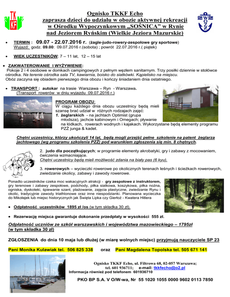 Ognisko TKKF Echo zaprasza dzieci do udziału w obozie aktywnej rekreacji w Ośrodku Wypoczynkowym „SOŚNICA” w Rynie nad Jeziorem Ryńskim (Wielkie Jeziora Mazurskie) TERMIN : 09.07 - 22.07.2016 r. (żagle-judo-rowery-zespołowe gry sportowe) Wyjazd: godz. 09.00: 09.07.2016 r.(sobota) ; powrót 22.07.2016 r.( piątek) WIEK UCZESTNIKÓW: 7 – 11 lat, 12 – 15 lat ZAKWATEROWANIE I WYŻYWIENIE: Pokoje 2 i 4 osobowe w domkach campingowych z pełnym węzłem sanitarnym. Trzy posiłki dziennie w stołówce ośrodka. Na terenie ośrodka sala TV, kawiarnia, boisko do siatkówki. Kąpielisko na miejscu. Obóz zaczyna się obiadem pierwszego dnia obozu i kończy śniadaniem dnia ostatniego. TRANSPORT : autokar na trasie Warszawa – Ryn - Warszawa. (Transport rowerów w dniu wyjazdu 09.07.2016 r.) PROGRAM OBOZU: W ciągu każdego dnia obozu uczestnicy będą mieli szansę brać udział w różnych rodzajach zajęć: 1. żeglarskich - na jachtach Optimist (grupa młodsza), jachcie kabinowym i Omegach; pływanie na łódkach, rowerach wodnych i kajakach. Wykorzystane będą elementy programu PZŻ junga & kadet. Chętni uczestnicy, którzy ukończyli 14 lat, będą mogli przejść pełne szkolenie na patent żeglarza jachtowego (wg programu szkolenia PZŻ) pod warunkiem zgłoszenia się min. 8 chętnych. 2. judo dla początkujących; w programie elementy akrobatyki, gry i zabawy z mocowaniem, ćwiczenia wzmacniające. Chętni uczestnicy będą mieli możliwość zdania na biały pas (6 kyu), 3. rowerowych – wycieczki rowerowe po okolicznych terenach leśnych i ścieżkach rowerowych, zwiedzanie okolicy, zabawy i zawody rowerowe. Ponadto uczestników czeka moc wakacyjnych atrakcji - gry zespołowe z instruktorem, gry terenowe i zabawy zespołowe, podchody, piłka siatkowa, koszykowa, piłka nożna, ogniska, dyskoteki, śpiewanie szant, plażowanie, zajęcia plastyczne, zwiedzanie Rynu i okolic, tradycyjnie zawody triathlonowe oraz inne niespodzianki. Planowana wycieczka do Mikołajek lub miejsc historycznych jak Święta Lipka czy Gierłoż - Kwatera Hitlera Odpłatność uczestników 1895 zł /os (w tym składka 30 zł). Rezerwację miejsca gwarantuje dokonanie przedpłaty w wysokości 555 zł. Odpłatność uczniów ze szkół warszawskich i województwa mazowieckiego – 1795zł (w tym składka 30 zł) ZGŁOSZENIA do dnia 10 maja lub dłużej (w miarę wolnych miejsc) przyjmują nauczyciele SP 23 Pani Monika Kulawiak tel. 506 825 338 oraz Pani Magdalena Topolska tel. 505 671 141 Ognisko TKKF Echo, ul. Filtrowa 68, 02-057 Warszawa; tel. 601 936711; e-mail: [email protected] Informacja również pod telefonem 601936710 PKO BP S.A. V O/W-wa, Nr 55 1020 1055 0000 9602 0113 7850