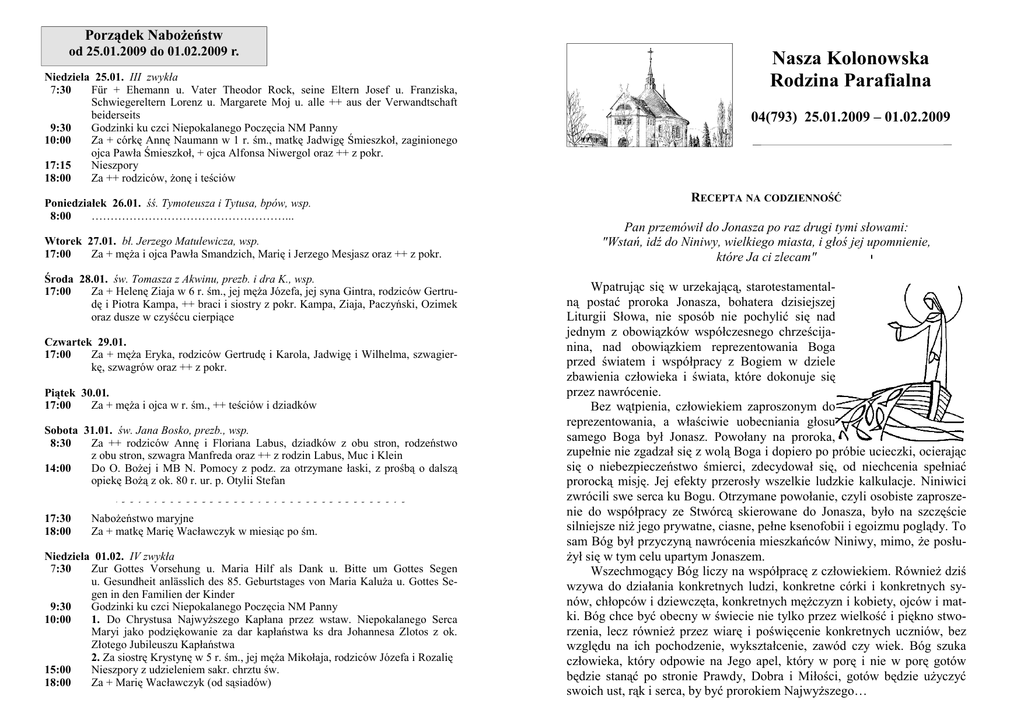 Porządek NaboŜeństw od 25.01.2009 do 01.02.2009 r. Niedziela 25.01. III zwykła 7:30 Für + Ehemann u. Vater Theodor Rock, seine Eltern Josef u. Franziska, Schwiegereltern Lorenz u. Margarete Moj u. alle ++ aus der Verwandtschaft beiderseits 9:30 Godzinki ku czci Niepokalanego Poczęcia NM Panny 10:00 Za + córkę Annę Naumann w 1 r. śm., matkę Jadwigę Śmieszkoł, zaginionego ojca Pawła Śmieszkoł, + ojca Alfonsa Niwergol oraz ++ z pokr. 17:15 Nieszpory 18:00 Za ++ rodziców, Ŝonę i teściów Poniedziałek 26.01. śś. Tymoteusza i Tytusa, bpów, wsp. 8:00 ……………………………………………... Wtorek 27.01. bł. Jerzego Matulewicza, wsp. 17:00 Za + męŜa i ojca Pawła Smandzich, Marię i Jerzego Mesjasz oraz ++ z pokr. Środa 28.01. św. Tomasza z Akwinu, prezb. i dra K., wsp. 17:00 Za + Helenę Ziaja w 6 r. śm., jej męŜa Józefa, jej syna Gintra, rodziców Gertrudę i Piotra Kampa, ++ braci i siostry z pokr. Kampa, Ziaja, Paczyński, Ozimek oraz dusze w czyśćcu cierpiące Czwartek 29.01. 17:00 Za + męŜa Eryka, rodziców Gertrudę i Karola, Jadwigę i Wilhelma, szwagierkę, szwagrów oraz ++ z pokr. Piątek 30.01. 17:00 Za + męŜa i ojca w r. śm., ++ teściów i dziadków Sobota 31.01. św. Jana Bosko, prezb., wsp. 8:30 Za ++ rodziców Annę i Floriana Labus, dziadków z obu stron, rodzeństwo z obu stron, szwagra Manfreda oraz ++ z rodzin Labus, Muc i Klein 14:00 Do O. BoŜej i MB N. Pomocy z podz. za otrzymane łaski, z prośbą o dalszą opiekę BoŜą z ok. 80 r. ur. p. Otylii Stefan 17:30 18:00 NaboŜeństwo maryjne Za + matkę Marię Wacławczyk w miesiąc po śm. Niedziela 01.02. IV zwykła 7:30 Zur Gottes Vorsehung u. Maria Hilf als Dank u. Bitte um Gottes Segen u. Gesundheit anlässlich des 85. Geburtstages von Maria KaluŜa u. Gottes Segen in den Familien der Kinder 9:30 Godzinki ku czci Niepokalanego Poczęcia NM Panny 10:00 1. Do Chrystusa NajwyŜszego Kapłana przez wstaw. Niepokalanego Serca Maryi jako podziękowanie za dar kapłaństwa ks dra Johannesa Zlotos z ok. Złotego Jubileuszu Kapłaństwa 2. Za siostrę Krystynę w 5 r. śm., jej męŜa Mikołaja, rodziców Józefa i Rozalię 15:00 Nieszpory z udzieleniem sakr. chrztu św. 18:00 Za + Marię Wacławczyk (od sąsiadów) Nasza Kolonowska Rodzina Parafialna 04(793) 25.01.2009 – 01.02.2009 RECEPTA NA CODZIENNOŚĆ Pan przemówił do Jonasza po raz drugi tymi słowami: "Wstań, idź do Niniwy, wielkiego miasta, i głoś jej upomnienie, które Ja ci zlecam" Wpatrując się w urzekającą, starotestamentalną postać proroka Jonasza, bohatera dzisiejszej Liturgii Słowa, nie sposób nie pochylić się nad jednym z obowiązków współczesnego chrześcijanina, nad obowiązkiem reprezentowania Boga przed światem i współpracy z Bogiem w dziele zbawienia człowieka i świata, które dokonuje się przez nawrócenie. Bez wątpienia, człowiekiem zaproszonym do reprezentowania, a właściwie uobecniania głosu samego Boga był Jonasz. Powołany na proroka, zupełnie nie zgadzał się z wolą Boga i dopiero po próbie ucieczki, ocierając się o niebezpieczeństwo śmierci, zdecydował się, od niechcenia spełniać prorocką misję. Jej efekty przerosły wszelkie ludzkie kalkulacje. Niniwici zwrócili swe serca ku Bogu. Otrzymane powołanie, czyli osobiste zaproszenie do współpracy ze Stwórcą skierowane do Jonasza, było na szczęście silniejsze niŜ jego prywatne, ciasne, pełne ksenofobii i egoizmu poglądy. To sam Bóg był przyczyną nawrócenia mieszkańców Niniwy, mimo, Ŝe posłuŜył się w tym celu upartym Jonaszem. Wszechmogący Bóg liczy na współpracę z człowiekiem. RównieŜ dziś wzywa do działania konkretnych ludzi, konkretne córki i konkretnych synów, chłopców i dziewczęta, konkretnych męŜczyzn i kobiety, ojców i matki. Bóg chce być obecny w świecie nie tylko przez wielkość i piękno stworzenia, lecz równieŜ przez wiarę i poświęcenie konkretnych uczniów, bez względu na ich pochodzenie, wykształcenie, zawód czy wiek. Bóg szuka człowieka, który odpowie na Jego apel, który w porę i nie w porę gotów będzie stanąć po stronie Prawdy, Dobra i Miłości, gotów będzie uŜyczyć swoich ust, rąk i serca, by być prorokiem NajwyŜszego… 04/2009 Dzisiaj III niedziela zwykła. Zapraszam na nieszpory o godz. 17:15. Dzisiejsza niedziela kończy Tydzień Powszechnej Modlitwy o Jedność Chrześcijan. Rozliczenie Parafialnego CARITAS za rok 2008 Przychód 1. Wspierający 2. Magazyn odzieŜowy 3. Sponsorzy 4. Skarbonka św. Antoniego 5. JałmuŜna postna i zbiórka do koszyka 6. SprzedaŜ świec adwentowych 7. SprzedaŜ pierników 8. Projekt UE (dofinansowanie wycieczek i Wakacji z Bogiem) 1.120,00 zł 850,00 zł 6.348,00 zł 94,00 zł 550,00 zł 155,00 zł 815,00 zł _______________ 9.932,00 zł 7.000,00 zł Rozchód 1. Jubilaci i odwiedziny w szpitalach, domach osób starszych i chorych 2.764,00 zł 2. Światowy Dzień Chorych, Misyjny Tydzień Chorych i Tydzień Miłosierdzia 495,00 zł 3. Opłata biletów autobusowych do szkoły 150,00 zł 4. Zakup lekarstw, Ŝywności, opału 1.216,00 zł 5. Zakup towaru do paczek wielk. dla chorych 120,00 zł 6. Dopłata do wycieczki i zakup ksiąŜek 2.207,00 zł 7. Św. Marcin i św. Mikołaj 564,00 zł 8. Św. ElŜbieta i spotkanie Zespołu 344,00 zł 9. Wigilia 1.267,00 zł _______________ 9.127,00 zł W sobotę o godz. 16:00 nauka przedchrzcielna w salce parafialnej. Rodzina RóŜańcowa zaprasza swoich członków na „Spotkanie z kolędą” do salki parafialnej w następną niedzielę (01.02.) o godz. 15:00. Prosimy przynieść Drogę do Nieba. Caritas Parafialny parafii Staniszcze Wielkie organizuje Pielgrzymkę do Medjugorje w dn. 21-27.06.2009 r. Koszt: 440 zł + 100 €. Zapisy pod nr tel.: 077/ 4611 108 lub 501 796 669 (do 31 stycznia 2009 r.) Serdeczne podziękowania składamy panu Edwardowi Obst za transport dziewcząt na rekolekcje do Miedoni koło Raciborza. Bóg zapłać! Do nabycia: 