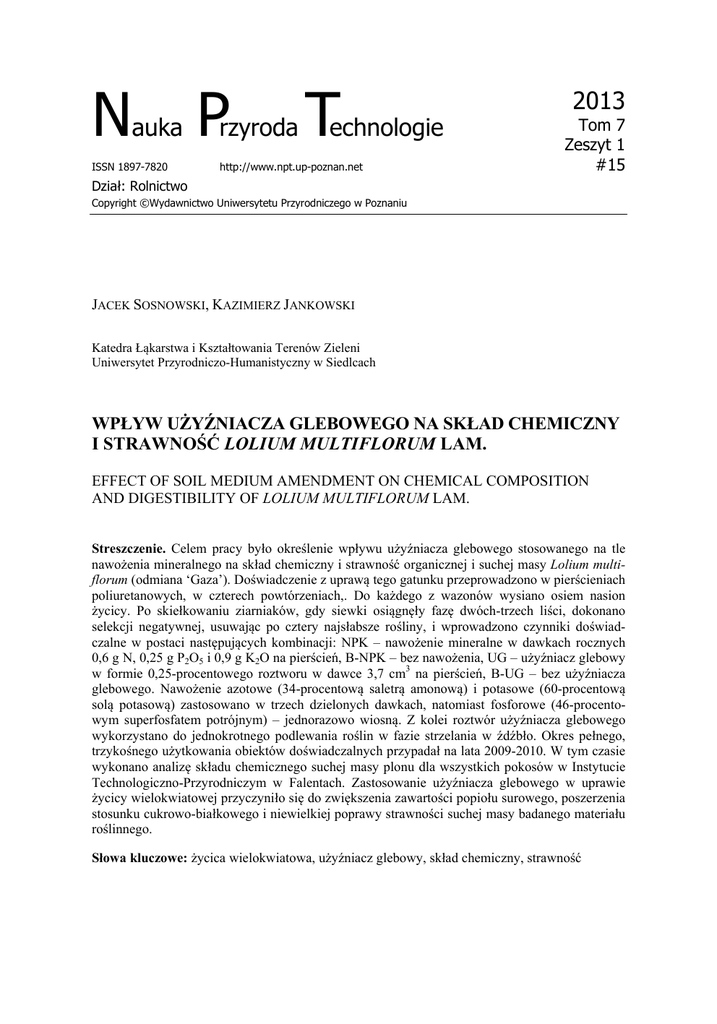 Nauka Przyroda Technologie ISSN 1897-7820 http://www.npt.up-poznan.net 2013 Tom 7 Zeszyt 1 #15 Dział: Rolnictwo Copyright ©Wydawnictwo Uniwersytetu Przyrodniczego w Poznaniu JACEK SOSNOWSKI, KAZIMIERZ JANKOWSKI Katedra Łąkarstwa i Kształtowania Terenów Zieleni Uniwersytet Przyrodniczo-Humanistyczny w Siedlcach WPŁYW UŻYŹNIACZA GLEBOWEGO NA SKŁAD CHEMICZNY I STRAWNOŚĆ LOLIUM MULTIFLORUM LAM. EFFECT OF SOIL MEDIUM AMENDMENT ON CHEMICAL COMPOSITION AND DIGESTIBILITY OF LOLIUM MULTIFLORUM LAM. Streszczenie. Celem pracy było określenie wpływu użyźniacza glebowego stosowanego na tle nawożenia mineralnego na skład chemiczny i strawność organicznej i suchej masy Lolium multiflorum (odmiana ‘Gaza’). Doświadczenie z uprawą tego gatunku przeprowadzono w pierścieniach poliuretanowych, w czterech powtórzeniach,. Do każdego z wazonów wysiano osiem nasion życicy. Po skiełkowaniu ziarniaków, gdy siewki osiągnęły fazę dwóch-trzech liści, dokonano selekcji negatywnej, usuwając po cztery najsłabsze rośliny, i wprowadzono czynniki doświadczalne w postaci następujących kombinacji: NPK – nawożenie mineralne w dawkach rocznych 0,6 g N, 0,25 g P2O5 i 0,9 g K2O na pierścień, B-NPK – bez nawożenia, UG – użyźniacz glebowy w formie 0,25-procentowego roztworu w dawce 3,7 cm3 na pierścień, B-UG – bez użyźniacza glebowego. Nawożenie azotowe (34-procentową saletrą amonową) i potasowe (60-procentową solą potasową) zastosowano w trzech dzielonych dawkach, natomiast fosforowe (46-procentowym superfosfatem potrójnym) – jednorazowo wiosną. Z kolei roztwór użyźniacza glebowego wykorzystano do jednokrotnego podlewania roślin w fazie strzelania w źdźbło. Okres pełnego, trzykośnego użytkowania obiektów doświadczalnych przypadał na lata 2009-2010. W tym czasie wykonano analizę składu chemicznego suchej masy plonu dla wszystkich pokosów w Instytucie Technologiczno-Przyrodniczym w Falentach. Zastosowanie użyźniacza glebowego w uprawie życicy wielokwiatowej przyczyniło się do zwiększenia zawartości popiołu surowego, poszerzenia stosunku cukrowo-białkowego i niewielkiej poprawy strawności suchej masy badanego materiału roślinnego. Słowa kluczowe: życica wielokwiatowa, użyźniacz glebowy, skład chemiczny, strawność 2 Sosnowski J., Jankowski K., 2013. Wpływ użyźniacza glebowego na skład chemiczny i strawność Lolium multiflorum Lam. Nauka Przyr. Technol. 7, 1, #15. Wstęp Życica wielokwiatowa, ze względu na dużą wartość pokarmową, związaną z dużym udziałem cukrów rozpuszczalnych w wodzie, a niewielkim lignin, celuloz i hemiceluloz oraz z korzystnym składem mineralnym i małą koncentracją azotu azotanowego, jest postrzegana jako cenna trawa pastewna (ŁYSZCZARZ i IN. 1997, JANICKA i IN. 2001, ZILIOTTO i IN. 2003). Ponadto, ze względu na dostępność odmian pastewnych i szybkie tempo wzrostu i rozwoju po zasiewie, znajduje ona zastosowanie jako wsiewka międzyplonowa w płodozmianach polowych (PŁAZA 2007, PŁAZA i IN. 2011). W literaturze opisano już reakcję tego gatunku na zróżnicowany poziom nawożenia azotem, wermikompostem, na stresowe warunki pogodowe oraz osypywanie się ziarniaków pod wpływem środków sterujących dojrzewaniem roślin (SERIN i IN. 1996, KALEMBASA i SYMANOWICZ 1999, CZYŻ i IN. 2001, STYPIŃSKI i IN. 2001, KALEMBASA 2004, GOLIŃSKI i IN. 2010). Brakuje jednak doniesień dotyczących wpływu preparatów mikrobiologicznych na skład chemiczny materiału roślinnego pozyskanego z uprawy tej życicy. Według SULEWSKIEJ i IN. (2009) użyźniacz glebowy UGmax jako biopreparat przyczynia się do poprawy aktywności biologicznej gleby, wzmaga wiązanie wolnego azotu z powietrza, ogranicza erozję gleby i straty składników pokarmowych oraz przyspiesza procesy mineralizacji organicznych związków próchnicznych. Autorzy twierdzą również, że tak wszechstronne oddziaływanie użyźniacza na glebę może spotkać się z reakcją rośliny uprawnej przejawiającą się poprawą wielkości i jakości plonu. W wielu badaniach (TRAWCZYŃSKI i BOGDANOWICZ 2007, KLAMA i IN. 2010, SOSNOWSKI i JANKOWSKI 2010, WOJTALA-ŁOZOWSKA i PARYLAK 2010, ZARZECKA i IN. 2011) wykazano pozytywny wpływ użyźniania gleby mikroorganizmami na zdrowotność roślin i zwyżkę plonów. Dane literaturowe dotyczące oddziaływania tego typu preparatów na trawy pastewne są nieliczne (SOSNOWSKI i JANKOWSKI 2010, SOSNOWSKI 2012 a, 2012 b, 2012 c), dlatego badania w tym zakresie mogą mieć duże znaczenie poznawcze i aplikacyjne. Celem pracy było określenie wpływu użyźniacza glebowego UGmax stosowanego na tle nawożenia mineralnego na skład chemiczny oraz strawność organicznej i suchej masy życicy wielokwiatowej. Materiał i metody Badania z uprawą Lolium multiflorum Lam. (odmiana ‘Gaza’) przeprowadzono w pierścieniach poliuretanowych, w czterech powtórzeniach, na obiekcie doświadczalnym Katedry Łąkarstwa i Kształtowania Terenów Zieleni Uniwersytetu Przyrodniczo-Humanistycznego w Siedlcach (współrzędne geograficzne: 52,169°N, 22,280°E). Pierścienie o średnicy 36 cm i wysokości 40 cm wkopano na głębokość 30 cm i wypełniono materiałem glebowym pochodzącym z gleb rzędu kulturoziemnych, typu hortisoli, wytworzonych z piasku słabo gliniastego. Na podstawie analizy wykonanej w Okręgowej Stacji Chemicznej w Wesołej stwierdzono, że materiał glebowy w pierścieniach odznaczał się odczynem obojętnym (pH 7,2), dużą zasobnością w próchnicę (3,78%), przy- 3 Sosnowski J., Jankowski K., 2013. Wpływ użyźniacza glebowego na skład chemiczny i strawność Lolium multiflorum Lam. Nauka Przyr. Technol. 7, 1, #15. swajalny fosfor (P2O5 – 900 mg·kg-l) i magnez (Mg – 84 mg·kg-l) oraz średnią zasobnością w azot ogólny (N – 1,8 g·kg-l) i przyswajalny potas (K2O – 190 mg·kg-l). Do każdego z pierścieni 5 kwietnia w 2009 roku wysiano osiem nasion badanego gatunku trawy