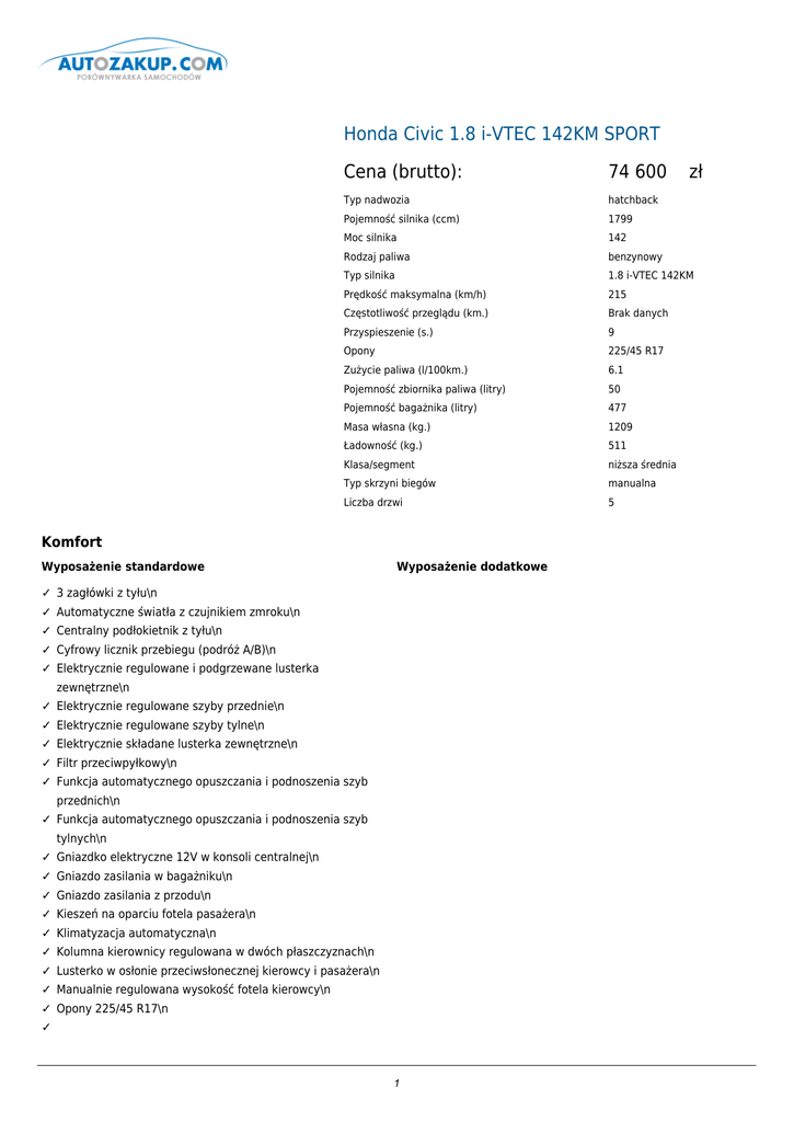 Honda Civic 1.8 i-VTEC 142KM SPORT Cena (brutto): 74 600 Typ nadwozia hatchback Pojemność silnika (ccm) 1799 Moc silnika 142 Rodzaj paliwa benzynowy Typ silnika 1.8 i-VTEC 142KM Prędkość maksymalna (km/h) 215 Częstotliwość przeglądu (km.) Brak danych Przyspieszenie (s.) 9 Opony 225/45 R17 Zużycie paliwa (l/100km.) 6.1 Pojemność zbiornika paliwa (litry) 50 Pojemność bagażnika (litry) 477 Masa własna (kg.) 1209 Ładowność (kg.) 511 Klasa/segment niższa średnia Typ skrzyni biegów manualna Liczba drzwi 5 Komfort Wyposażenie standardowe Wyposażenie dodatkowe ✓ 3 zagłówki z tyłu\n ✓ Automatyczne światła z czujnikiem zmroku\n ✓ Centralny podłokietnik z tyłu\n ✓ Cyfrowy licznik przebiegu (podróż A/B)\n ✓ Elektrycznie regulowane i podgrzewane lusterka zewnętrzne\n ✓ Elektrycznie regulowane szyby przednie\n ✓ Elektrycznie regulowane szyby tylne\n ✓ Elektrycznie składane lusterka zewnętrzne\n ✓ Filtr przeciwpyłkowy\n ✓ Funkcja automatycznego opuszczania i podnoszenia szyb przednich\n ✓ Funkcja automatycznego opuszczania i podnoszenia szyb tylnych\n ✓ Gniazdko elektryczne 12V w konsoli centralnej\n ✓ Gniazdo zasilania w bagażniku\n ✓ Gniazdo zasilania z przodu\n ✓ Kieszeń na oparciu fotela pasażera\n ✓ Klimatyzacja automatyczna\n ✓ Kolumna kierownicy regulowana w dwóch płaszczyznach\n ✓ Lusterko w osłonie przeciwsłonecznej kierowcy i pasażera\n ✓ Manualnie regulowana wysokość fotela kierowcy\n ✓ Opony 225/45 R17\n ✓ 1 zł Oświetlenie bagażnika\n 2 ✓ Oświetlenie schowka pasażera\n ✓ Oświetlenie wnętrza z przodu i z tyłu w podsufitce\n ✓ Oświetlenie z przodu\n ✓ Regulowane z wnętrza położenie reflektorów\n ✓ Skórzana kierownica\n ✓ Sygnał ostrzegający o pozostawieniu włączonych świateł\n ✓ System składania tylnej kanapy Magic Seats\n ✓ Tylna kanapa składana asymetrycznie w stosunku 60/40\n ✓ Uchwyty mocujące w bagażniku\n ✓ Uchwyty na napoje z przodu\n ✓ Wyłącznik czasowy systemu Audio\n ✓ Zdalne domykanie szyb\n ✓ Zdalne składanie lusterek zewnętrznych\n ✓ Złącze USB /Aux (kompatybilne z iPod)\n Bezpieczeństwo Wyposażenie standardowe Wyposażenie dodatkowe ✓ 15" tarcze hamulcowe z tyłu\n ✓ 16" wentylowane tarcze hamulcowe z przodu\n ✓ 5 x 3-punktowe pasy bezpieczeństwa\n ✓ ABS - Układ zapobiegający blokowaniu kół\n ✓ BA - Układ wspomagania siły hamowania\n ✓ Boczne poduszki powietrzne\n ✓ DWS - System monitorowania ciśnienia w oponach\n ✓ Dwustopniowy centralny zamek\n ✓ EBD - Układ elektronicznego rozdziału siły hamowania\n ✓ HSA - System wspomagania ruszania na wzniesieniu\n ✓ Kurtyny powietrzne (z przodu i z tyłu)\n ✓ Mocowania fotelika dziecięcego ISOFix\n ✓ Przednie pasy bezpieczeństwa z 2-stopniowymi napinaczami\n ✓ Przednie poduszki powietrzne SRS Uzupełniający system bezpieczeństwa biernegoSRS\n ✓ Przednie światła przeciwmgielne\n ✓ Przełącznik dezaktywujący przednią poduszkę powietrzną pasażera\n ✓ Tylne pasy bezpieczeństwa z napinaczami\n ✓ Umieszczone wysoko trzecie światło STOP\n ✓ VSA - System kontroli stabilności jazdy\n Dodatki Wyposażenie standardowe Wyposażenie dodatkowe ✓ 2 składane kluczyki z systemem zdalnego sterowania\n ✓ Aluminiowe pedały\n ✓ Antena dachowa w kształcie płetwy rekina\n ✓ 3 Centralny podłokietnik z przodu\n 4 ✓ Cyfrowy wskaźnik zużycia paliwa\n ✓ Cyfrowy zegar\n ✓ Drążek skrzyni biegów - skórzany\n ✓ Elektryczne wspomaganie układu kierowniczego\n ✓ Felgi 17" aluminiowe\n ✓ Głośniki wysokotonowe\n ✓ Głośniki z przodu i z tyłu\n ✓ Immobilizer\n ✓ Kamera cofania\n ✓ Oświetlenie do czytania mapy\n ✓ Podświetlenie lusterek w osłonach przeciwsłonecznych\n ✓ Półka bagażnika\n ✓ Przednie reflektory halogenowe\n ✓ Przednie wycieraczki z czujnikiem deszczu\n ✓ Schowek pod podłogą bagażnika\n ✓ Sterowanie radiem z kierownicy\n ✓ Światła do jazdy dziennej LED\n ✓ System alarmowy ze zdalnym sterowaniem\n ✓ System Auto Stop (przekładnia manualna)\n ✓ System regulacji głośności w zależności od prędkości jazdy\n ✓ Tapicerka materiałowa\n ✓ Tempomat z ogranicznikiem prędkości\n ✓ Tylna wycieraczka\n ✓ Uchwyty na butelki w drzwiach\n ✓ Wskaźnik optymalnego momentu zmiany biegu (przekładnia manualna)\n ✓ Wskaźnik rezerwy paliwa\n ✓ Wskaźnik temperatury zewnętrznej\n ✓ Wyświetlacz wielofunkcyjny MID\n ✓ Zestaw naprawczy\n Doprecyzowanie oferty Kontakt: Nazwa użytkownika: admin Nazwa firmy: qqq Adres: qqq 12, 41-706 qqq1, NIP: 954 REGON: 1 Telefon: 123, 1 Fax: 1 Email: 1 www: 5