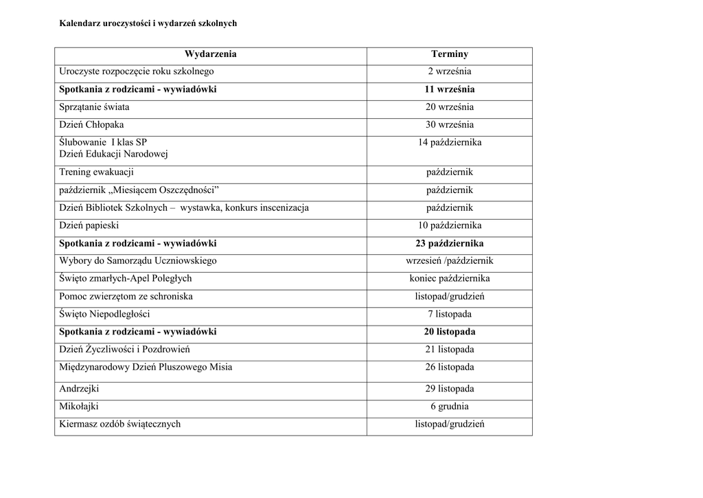 Kalendarz uroczystości i wydarzeń szkolnych Wydarzenia Terminy Uroczyste rozpoczęcie roku szkolnego 2 września Spotkania z rodzicami - wywiadówki 11 września Sprzątanie świata 20 września Dzień Chłopaka 30 września Ślubowanie I klas SP Dzień Edukacji Narodowej 14 października Trening ewakuacji październik październik „Miesiącem Oszczędności” październik Dzień Bibliotek Szkolnych – wystawka, konkurs inscenizacja październik Dzień papieski 10 października Spotkania z rodzicami - wywiadówki 23 października Wybory do Samorządu Uczniowskiego wrzesień /październik Święto zmarłych-Apel Poległych koniec października Pomoc zwierzętom ze schroniska listopad/grudzień Święto Niepodległości 7 listopada Spotkania z rodzicami - wywiadówki 20 listopada Dzień Życzliwości i Pozdrowień 21 listopada Międzynarodowy Dzień Pluszowego Misia 26 listopada Andrzejki 29 listopada Mikołajki 6 grudnia Kiermasz ozdób świątecznych listopad/grudzień Spotkania z rodzicami - wywiadówki 18 grudnia Wspólne kolędowanie grudzień Przerwa świąteczna 23.12.2013- 31.12.2013 Zabawy karnawałowe styczeń Spotkania z rodzicami - wywiadówki Ferie zimowe 16 stycznia 20.01.2014- 30.01.2014 Walentynki 14 lutego Rozstrzygniecie rozgrywek sportowych o Puchar Dyrektora 28 lutego Drzwi otwarte szkoły „Profil szkoły” – debata społeczności szkolnej luty luty/marzec „8 Marca” w naszej szkole 7 marca Pierwszy Dzień Wiosny 21 marca Wiosenny festiwal zdrowia Spotkania z rodzicami - wywiadówki Sprawdzian zewnętrzny dla klas szóstych Rocznica śmierci Jana Pawła II Dni Kultury Regionalnej Wielkanoc Przerwa wielkanocna marzec/ kwiecień 27 marca 1 kwietnia 2014 kwiecień 14-16 kwietnia 16 kwietnia 17.04.2014- 22.04.2014 Dzień Patrona 30 kwietnia Święta majowe 5 maja termin uroczystości w szkole Dzień Europejski Spotkania z rodzicami - wywiadówki 8 maja 21 maja Dzień Matki na sportowo maj Dzień sportu 2 czerwca Festyn rodzinny ( dzień ojca na sportowo) 20 czerwca Spotkania z rodzicami - wywiadówki 25 czerwca „Pchli targ” – kiermasz szkolnych podręczników 25 czerwca Uroczyste zakończenie roku szkolnego 27 czerwca